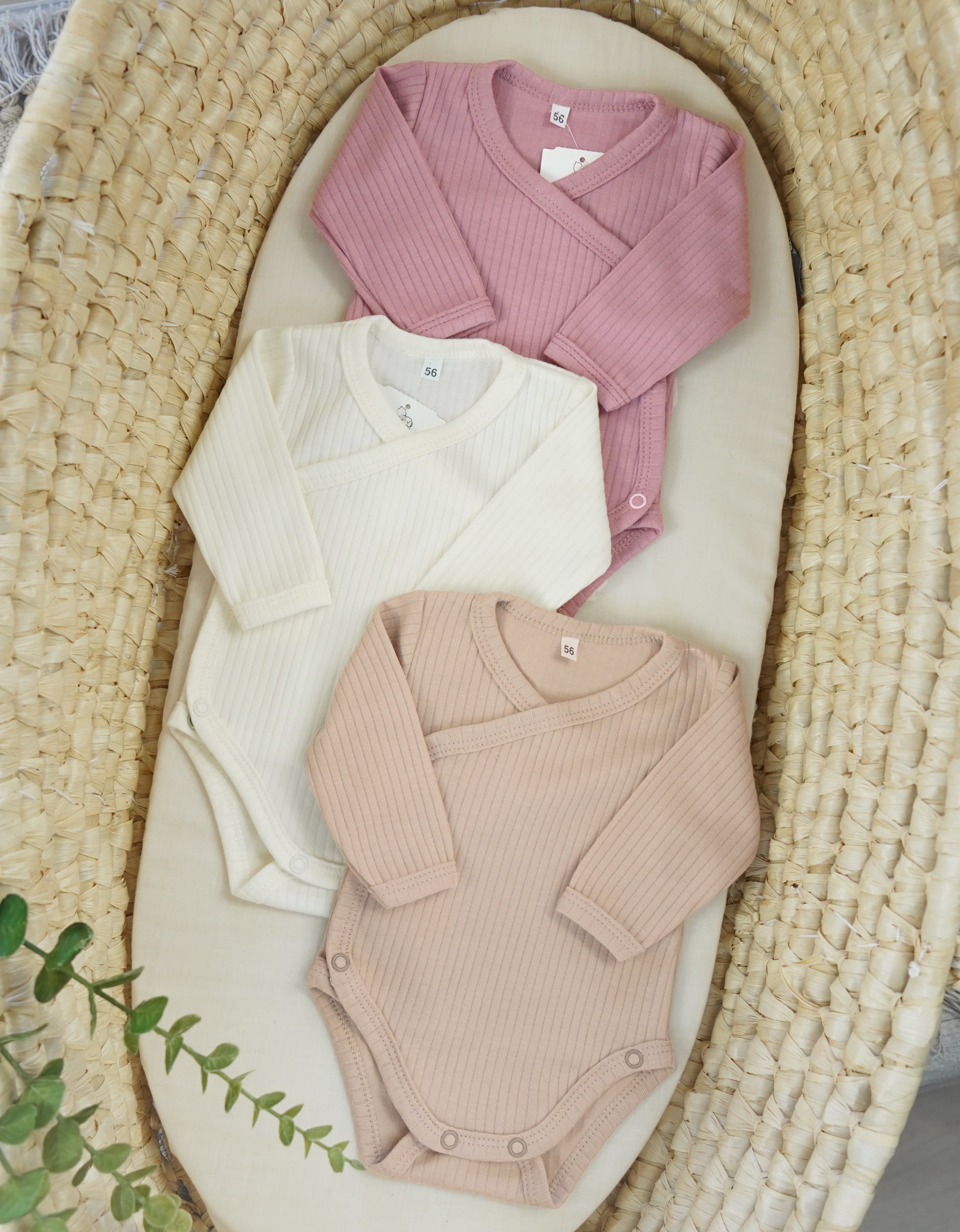 3PAK praktycznych kopertowych BODY niemowlęcych z długim rękawem w kolorach: ecru, beżowym i różowym.