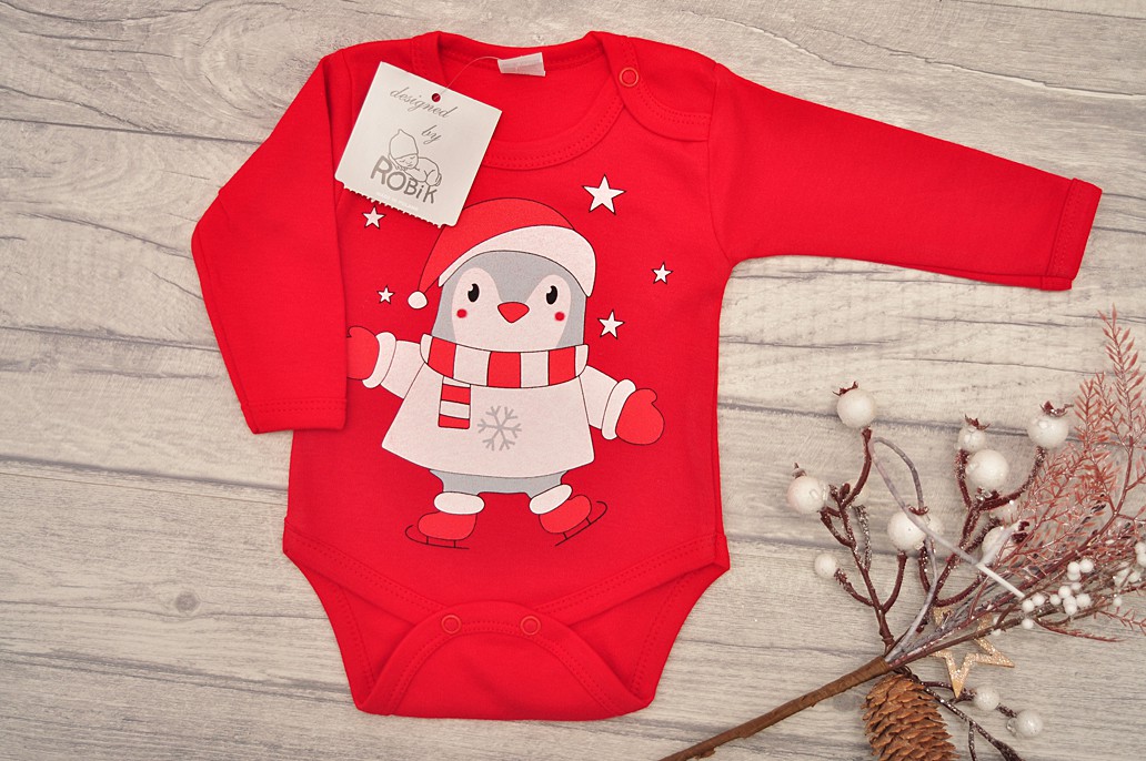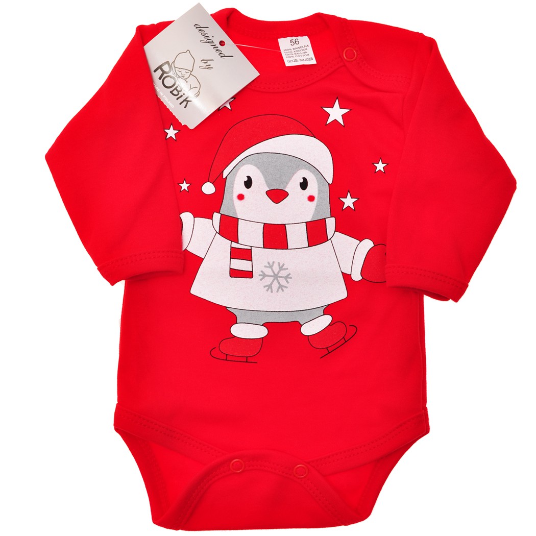 Dziecięce Body na Święta - czerwone z pingwinkiem