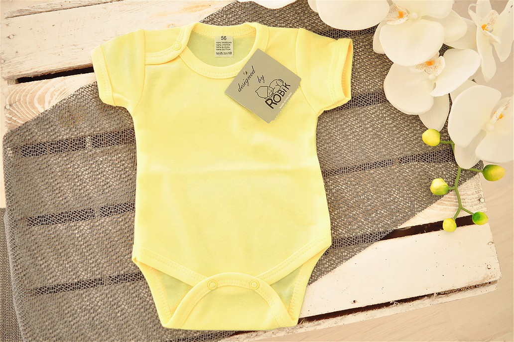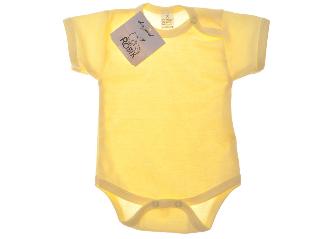 Dziecięce body z krótkim rękawem w kolorze żółtym.