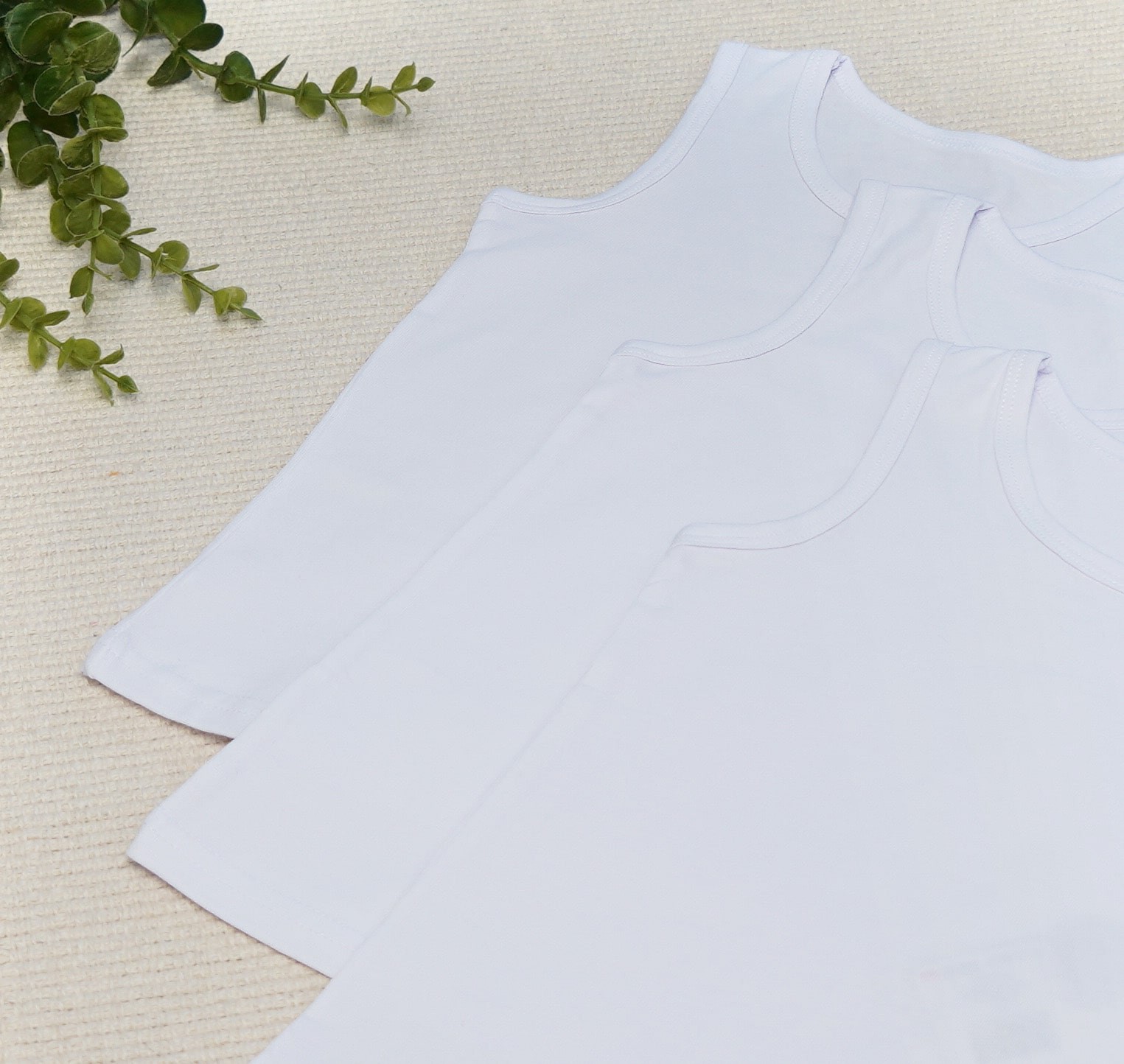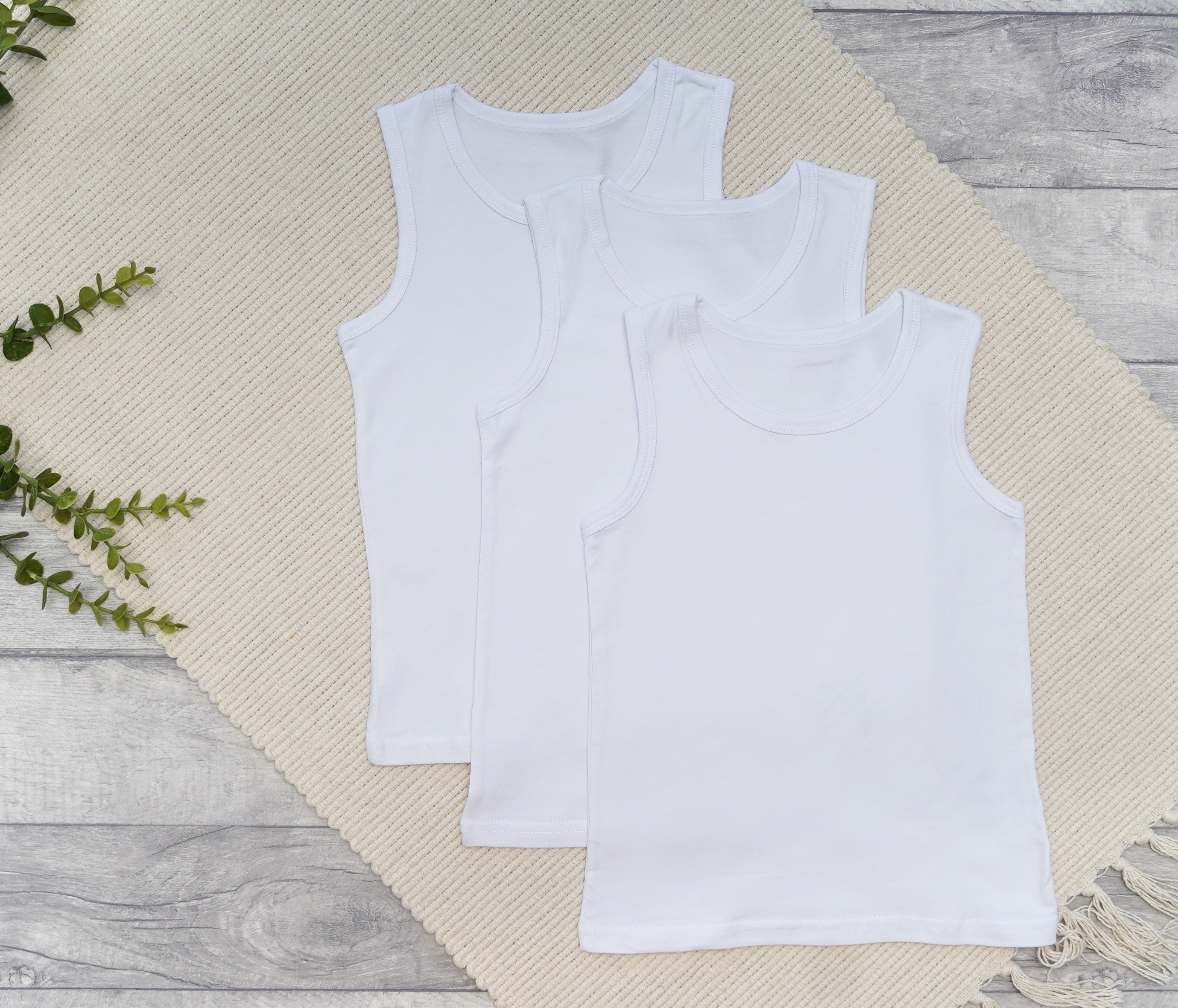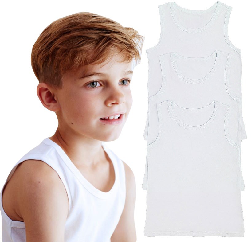 Klasyczny krój- klasyczna gładka bawełniana podkoszulka chłopięca na szerokie ramiączka w uniwersalnym białym kolorze