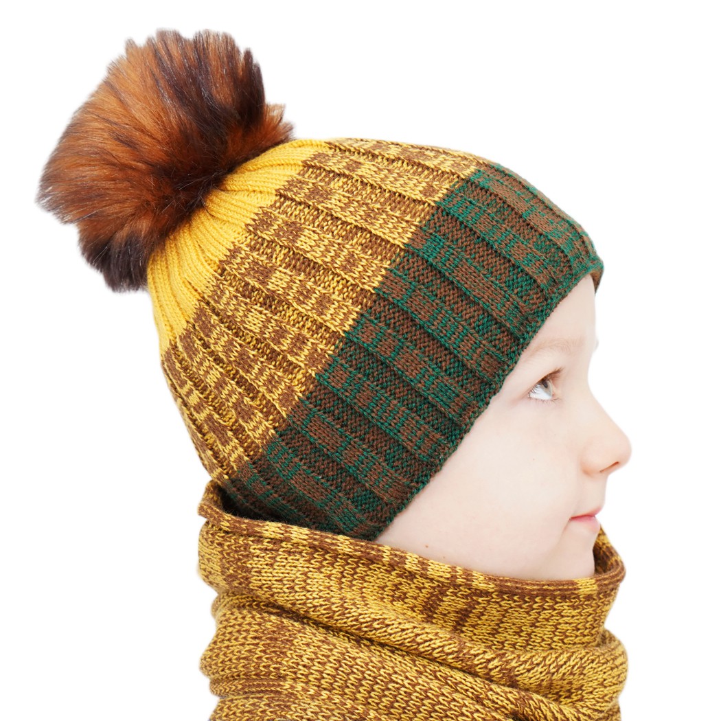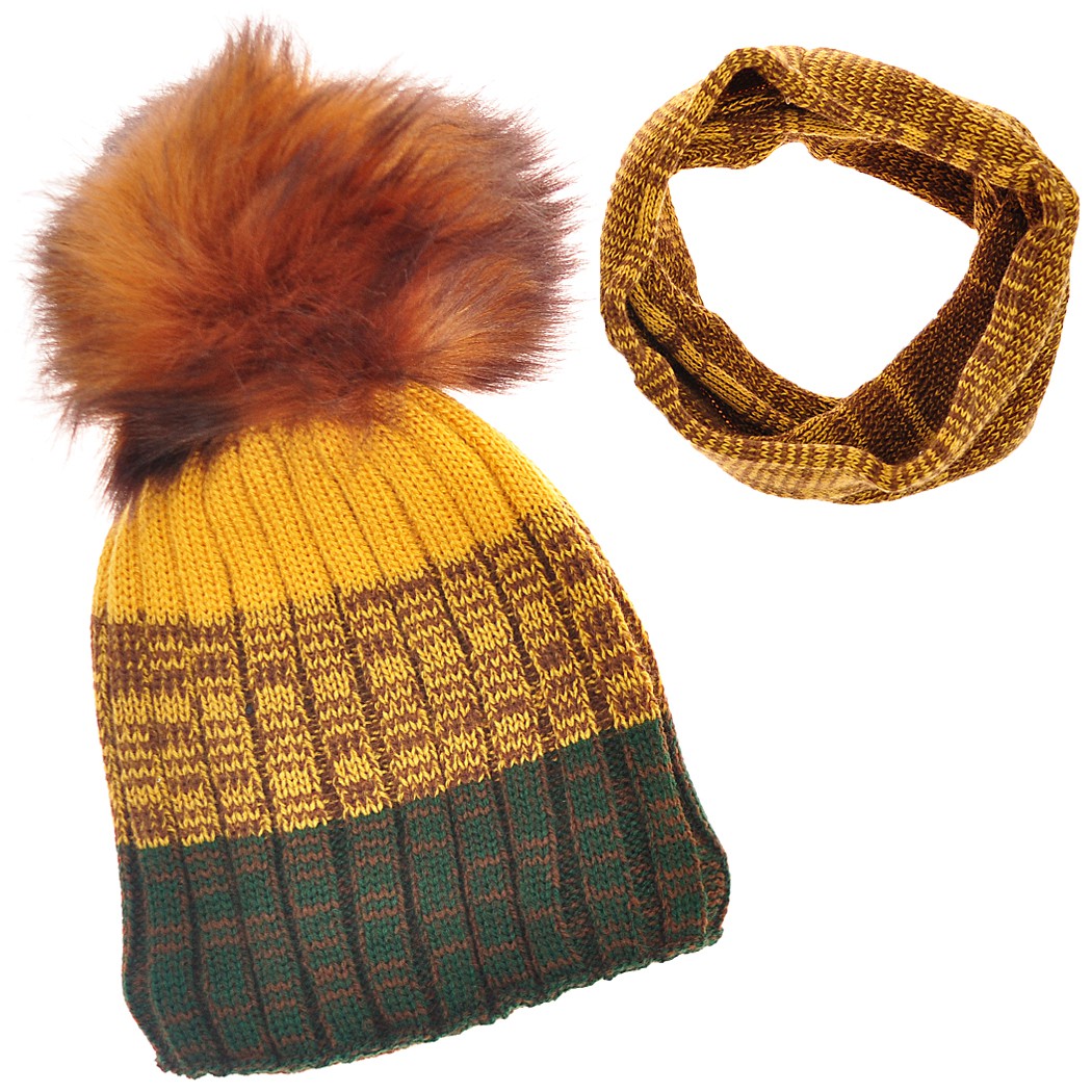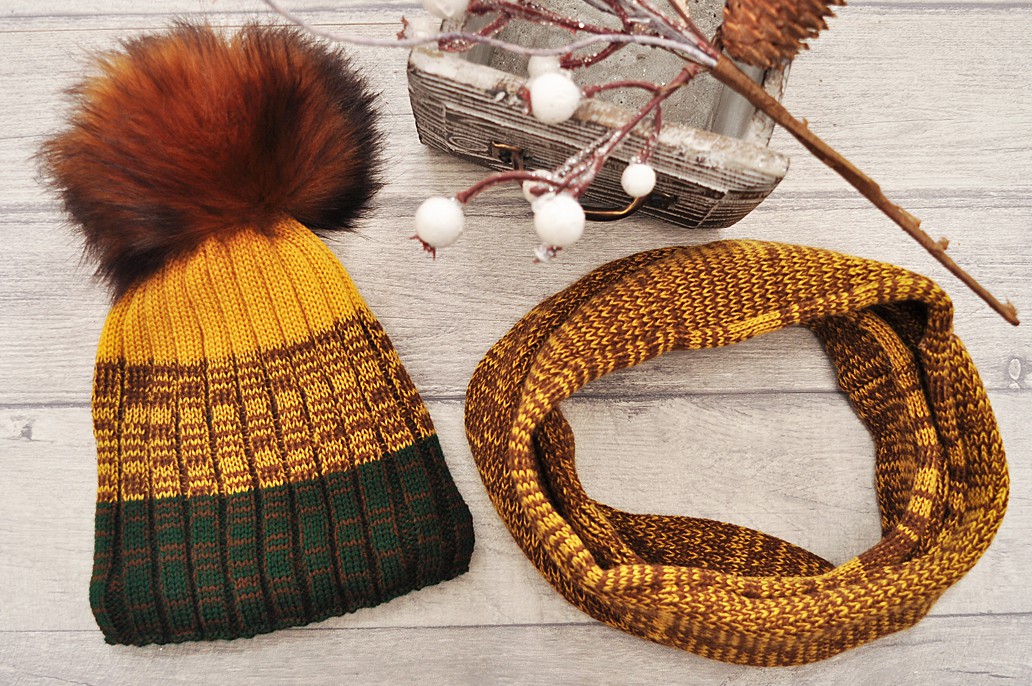 Komplet czapka i komin to odzież polskiej marki. W skład zestawu wchodzi czapka, której niepowtarzalnego stylu dodaje duży, puchaty, brązowy pompon z imitacji futra. Czapka uszyta z 2 warstw materiału, zewnętrzna warstwa wykonana z akrylowej dzianiny w musztardowo-zielono-brązowej kolorystyce, a od środka 100% bawełna w kolorze brązowym. Uzupełnienie czapeczki stanowi akrylowy komin - tuba, zakładany na raz, przylegający do szyi w kolorze musztardowo-brązowego melanżu.