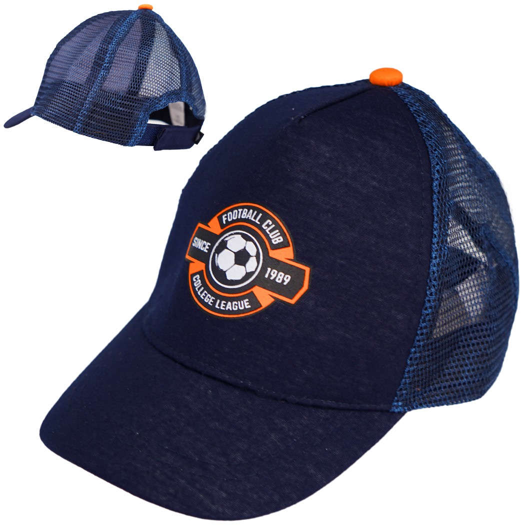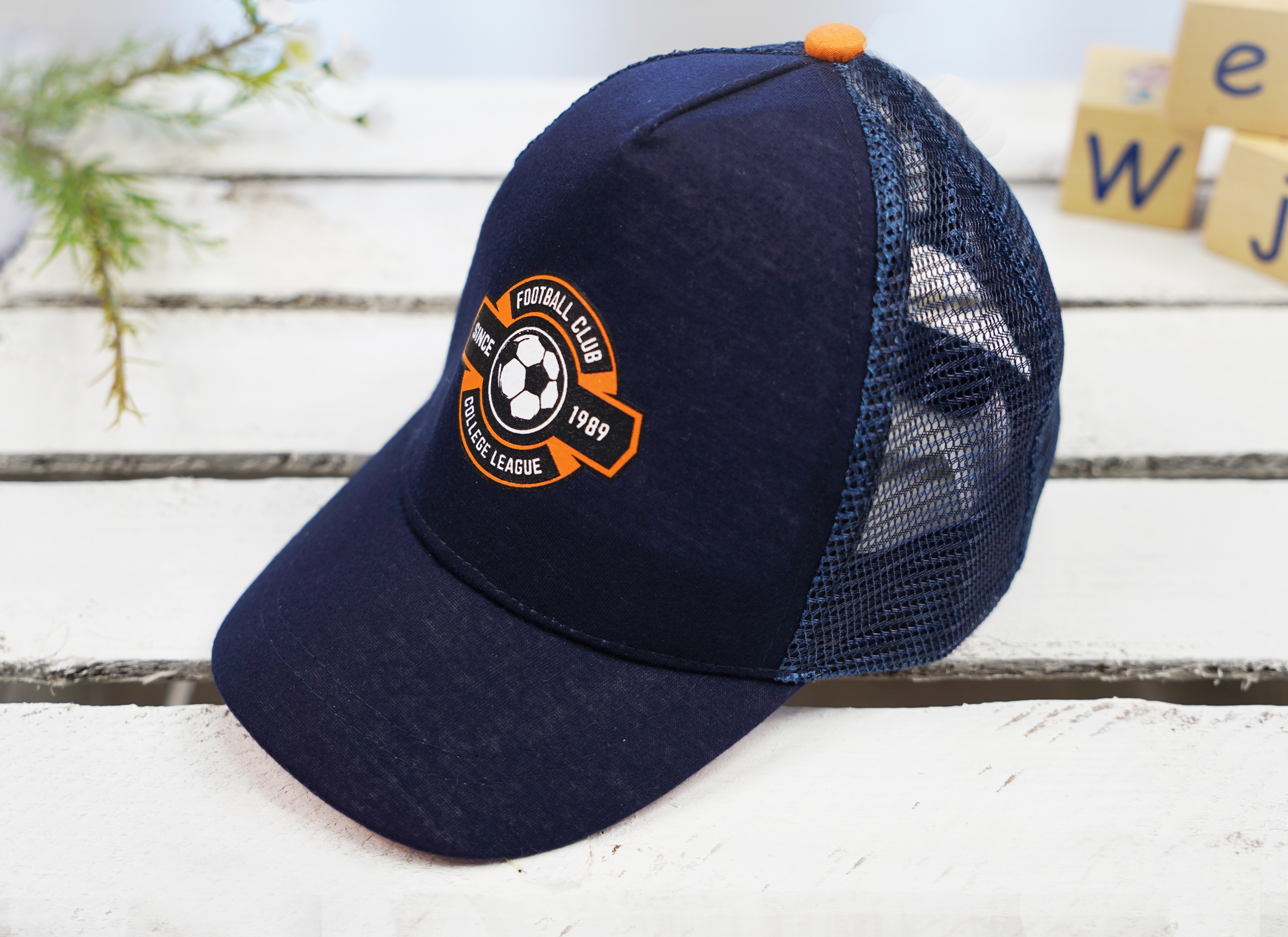 Granatowa czapeczka chłopięca z profilowanym, twardym daszkiem, typ bejsbolówka. Spód daszku w kolorze pomarańczowym. Czapka posiada wszytą z tyłu regulację na rzep, część z materiału siateczkowego, który zapobiega poceniu się głowy oraz pomarańczowy guziczek na czubku. Czapka z daszkiem posiada ozdobną, football'ową aplikację z przodu. Oferowany model to ponadczasowa chłopięca bejsbolówka, odpowiednia jako czapeczka na lato.