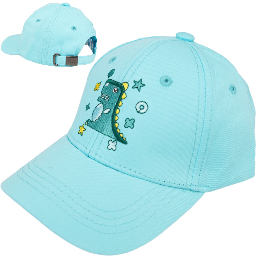 Miętowa czapeczka dziecięca z profilowanym, twardym daszkiem, typ bejsbolówka. Przód czapki zdobi zielono- żółty haft z dinozaurem i gwiazdkami! Czapka posiada wszytą z tyłu wpuszczaną regulację oraz małe otworki wentylacyjne. Oferowany model to ponadczasowa dziecięca bejsbolówka, odpowiednia jako czapeczka na wiosnę i lato.