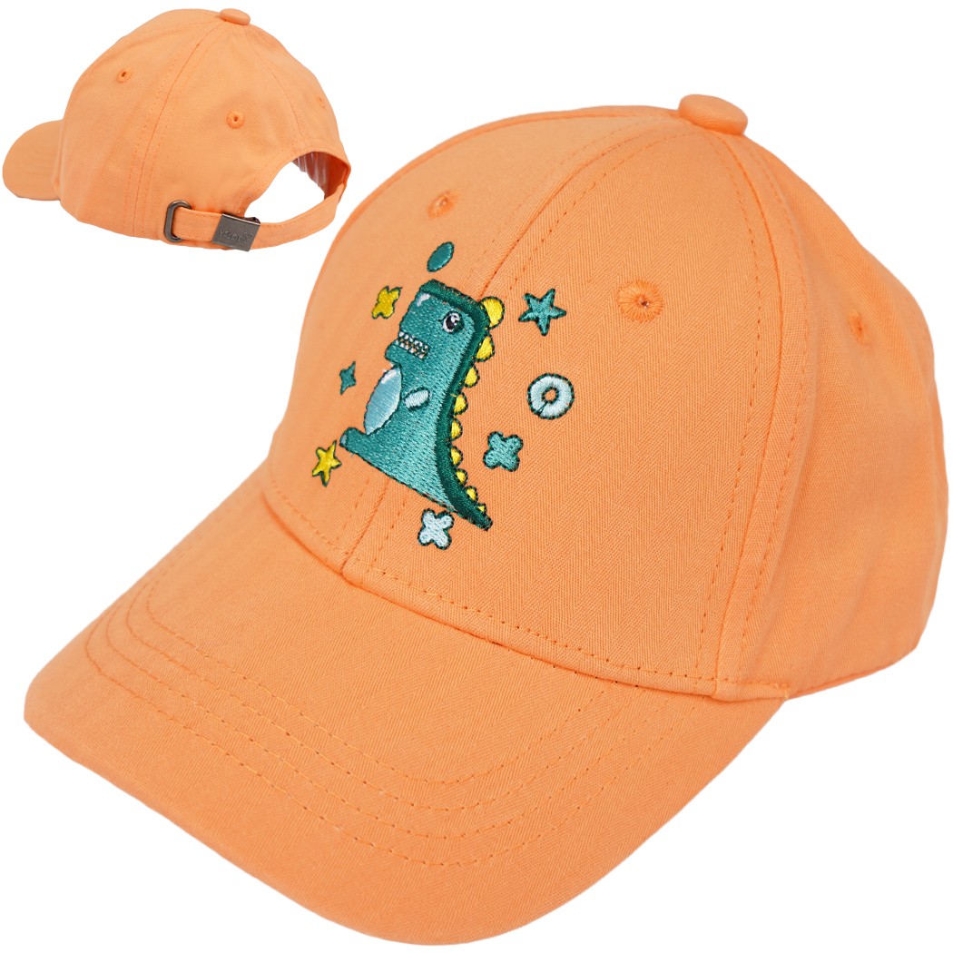 Pomarańczowa czapeczka dziecięca z profilowanym, twardym daszkiem, typ bejsbolówka. Przód czapki zdobi zielono- żółty haft z dinozaurem i gwiazdkami! Czapka posiada wszytą z tyłu wpuszczaną regulację oraz małe otworki wentylacyjne. Oferowany model to ponadczasowa dziecięca bejsbolówka, odpowiednia jako czapeczka na wiosnę i lato.