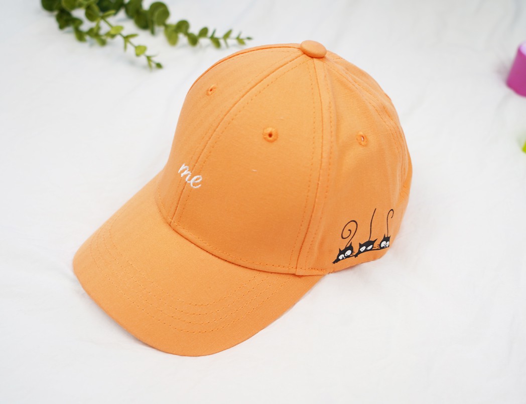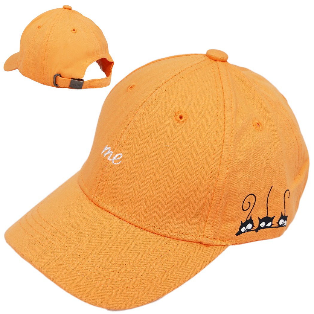 Pomarańczowa czapeczka dziecięca z profilowanym, twardym daszkiem, typ bejsbolówka. Przód czapki zdobi biały haft z napisem ME, lewy bok posiada nadruk z trzema kotami! Czapka posiada wszytą z tyłu wpuszczaną regulację oraz małe otworki wentylacyjne. Oferowany model to ponadczasowa dziecięca bejsbolówka, odpowiednia jako czapeczka na wiosnę i lato.