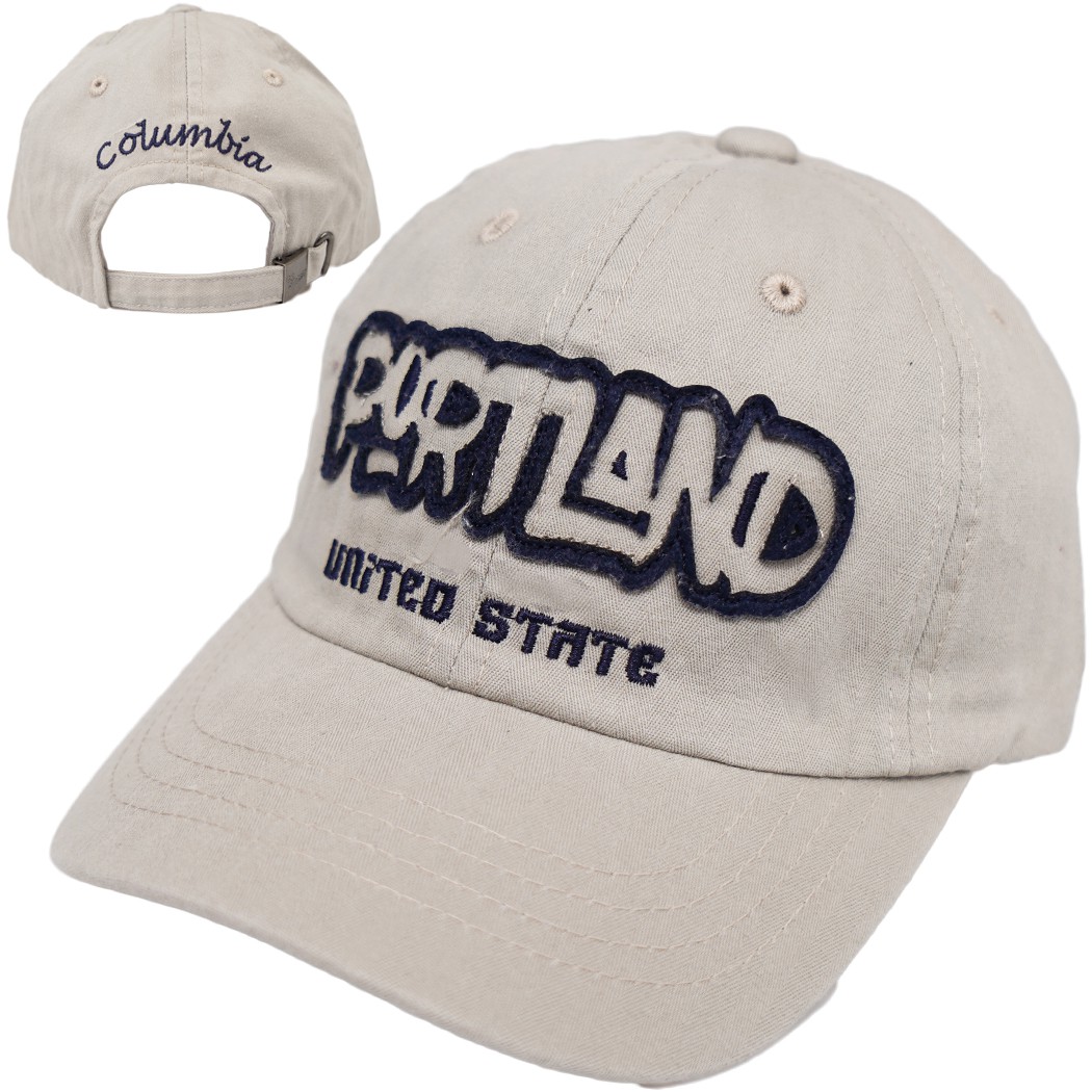 Piaskowa czapeczka chłopięca z profilowanym, twardym daszkiem, typ bejsbolówka. Przód czapki zdobi granatowy napis PORTLAND United State, a tył napis Columbia w tym samym kolorze! Czapka posiada wszytą z tyłu wpuszczaną regulację oraz małe otworki wentylacyjne. Oferowany model to ponadczasowa chłopięca bejsbolówka, odpowiednia jako czapeczka na wiosnę i lato.