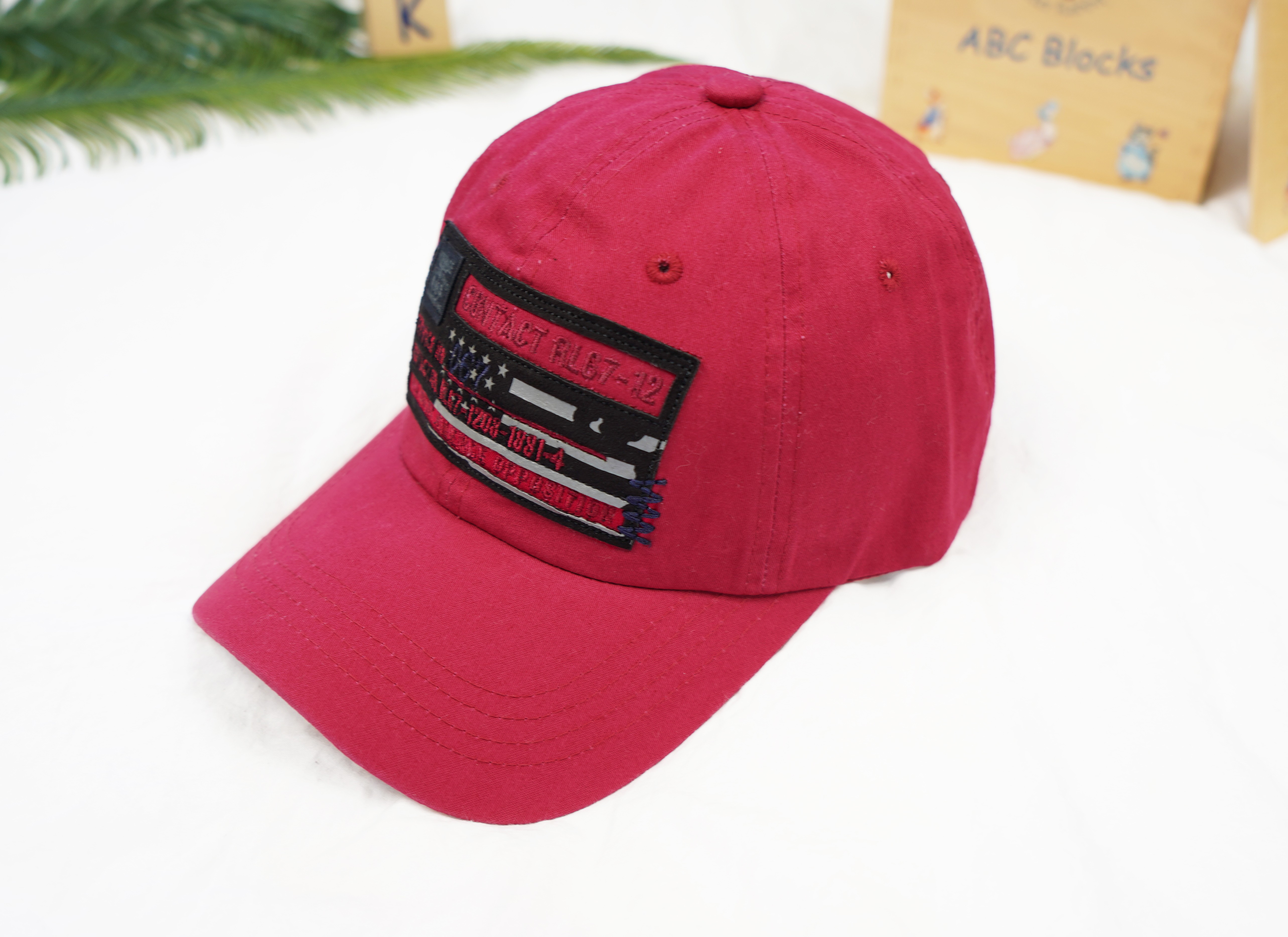Czapka z daszkiem dla chłopca w kolorze bordowym z aplikacją.