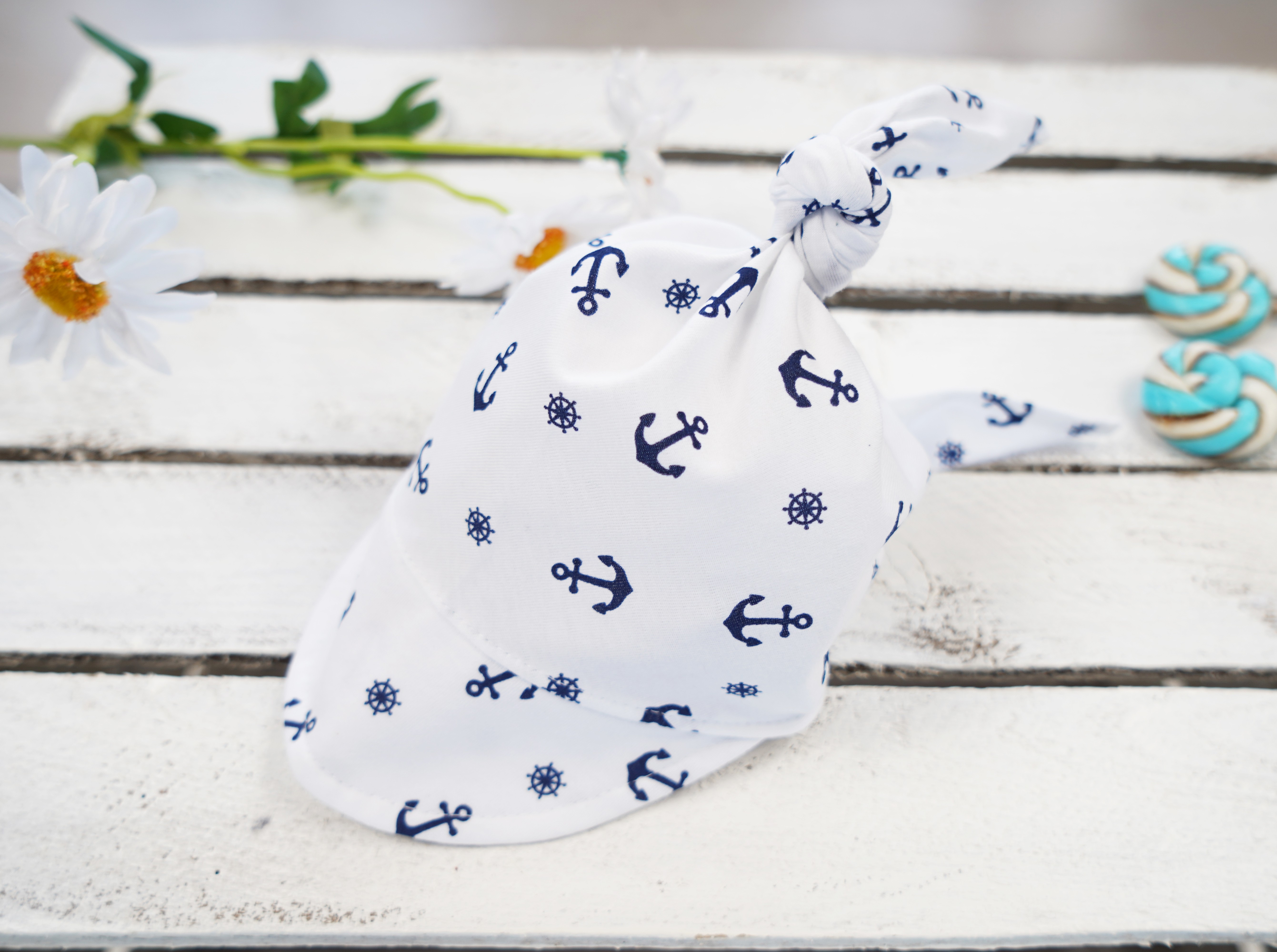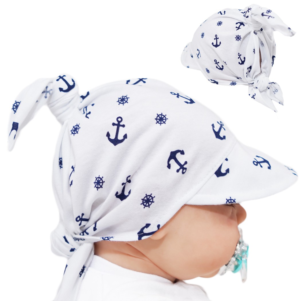 Biała czapka CHUSTA w kotwice z daszkiem wiązana LATO