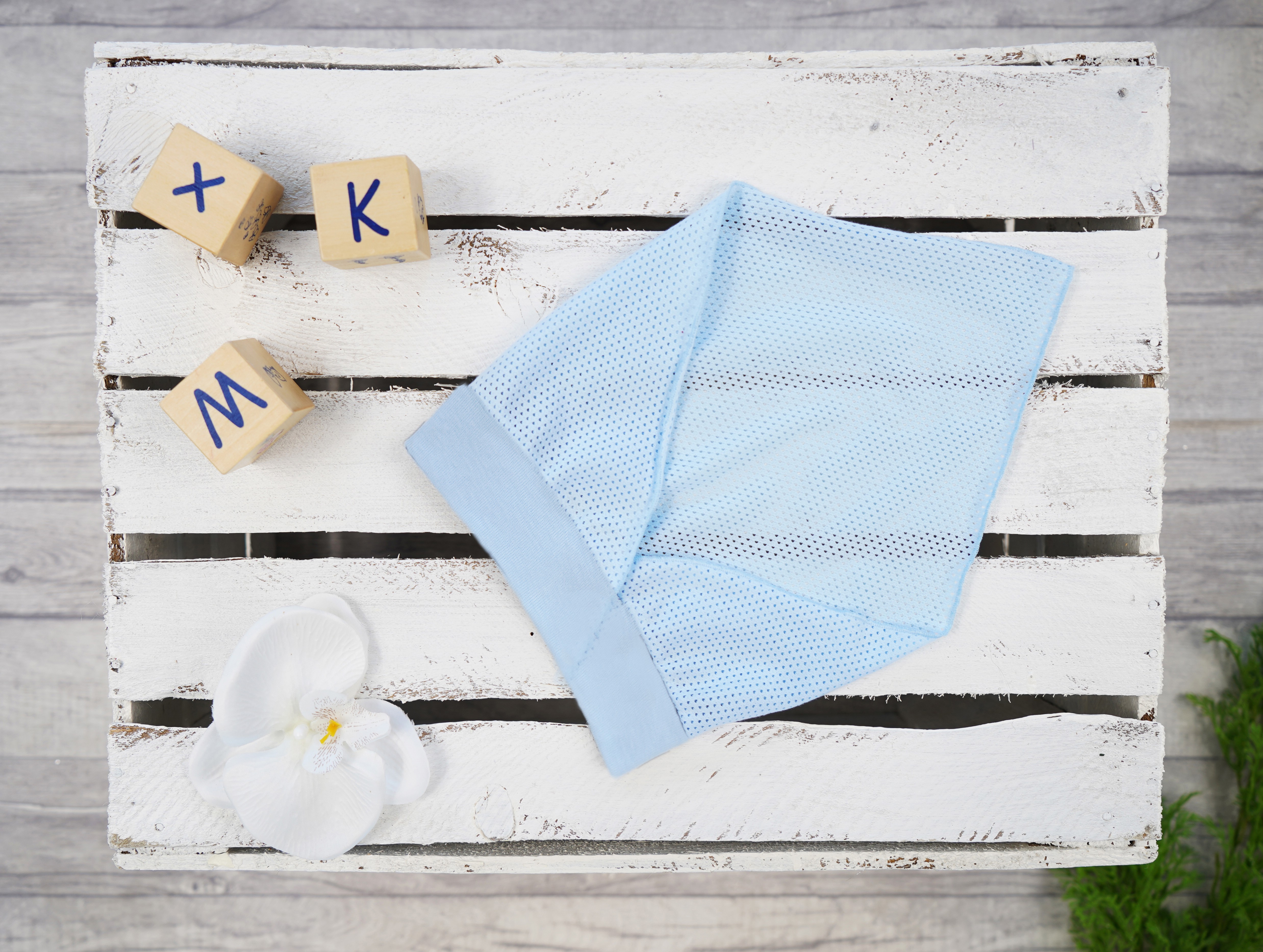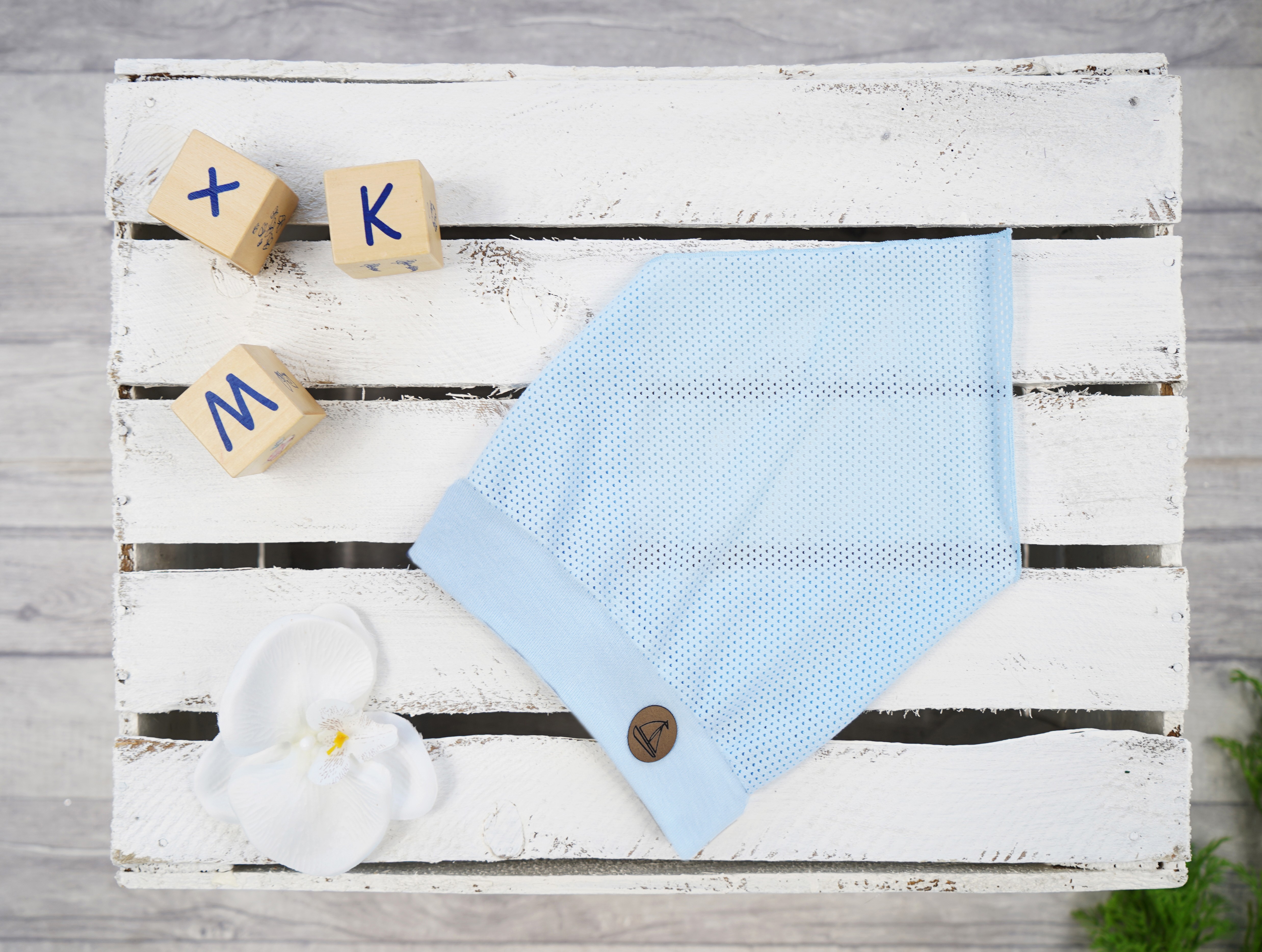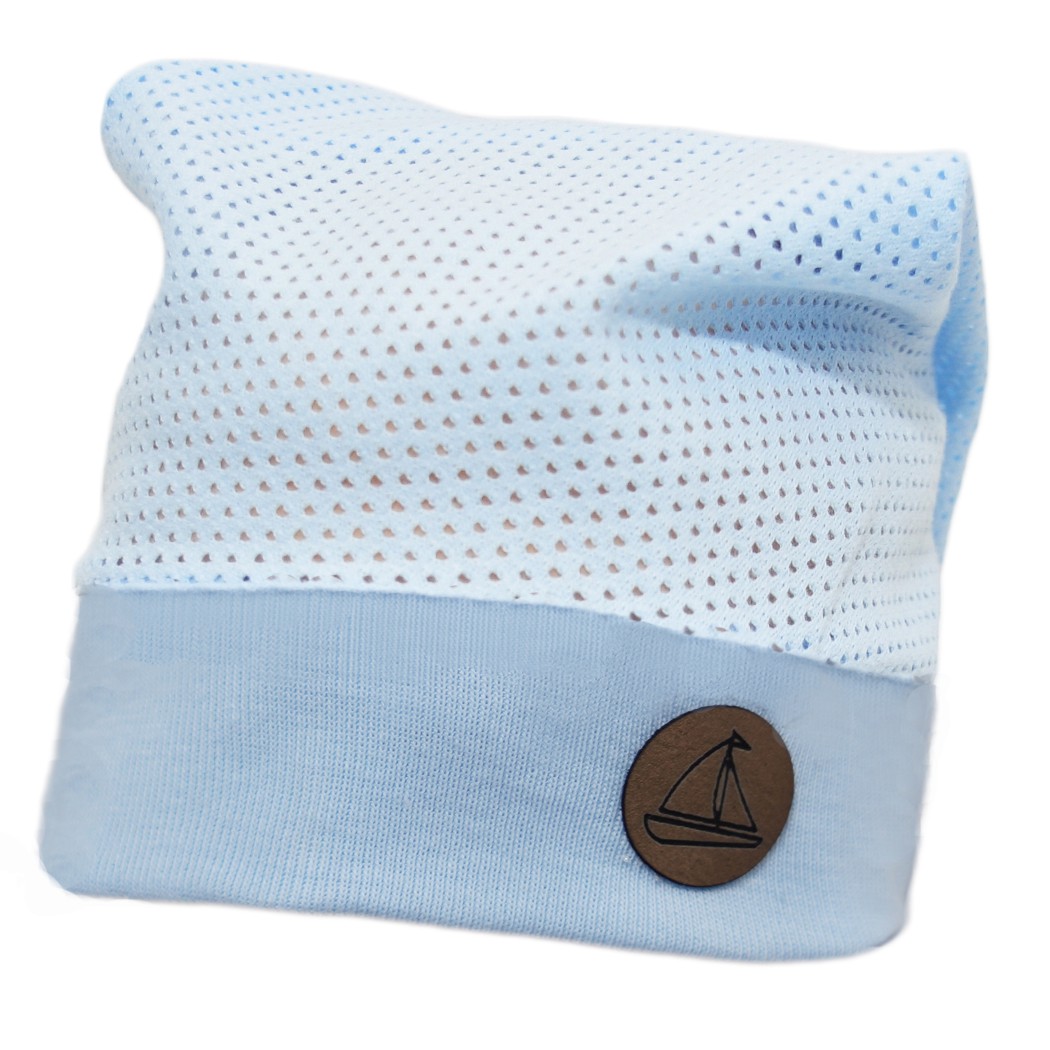 Letnia czapeczka dziecięca typu chusta z delikatnym ściągaczem. Chusta dla chłopca wykonana została z miękkiej, atestowanej dzianiny z ażurowym siateczkowym wzorem a doszyta aplikacja żaglówki dodaje chuście dodatkowego uroku. Idealnie ochroni główkę dziecka przed przegrzaniem, a dzięki wykorzystaniu bardzo miękkiej tkaniny nie spowoduje podrażnień oraz zapobiegnie przetarciom nawet na wrażliwej skórze maluszka.