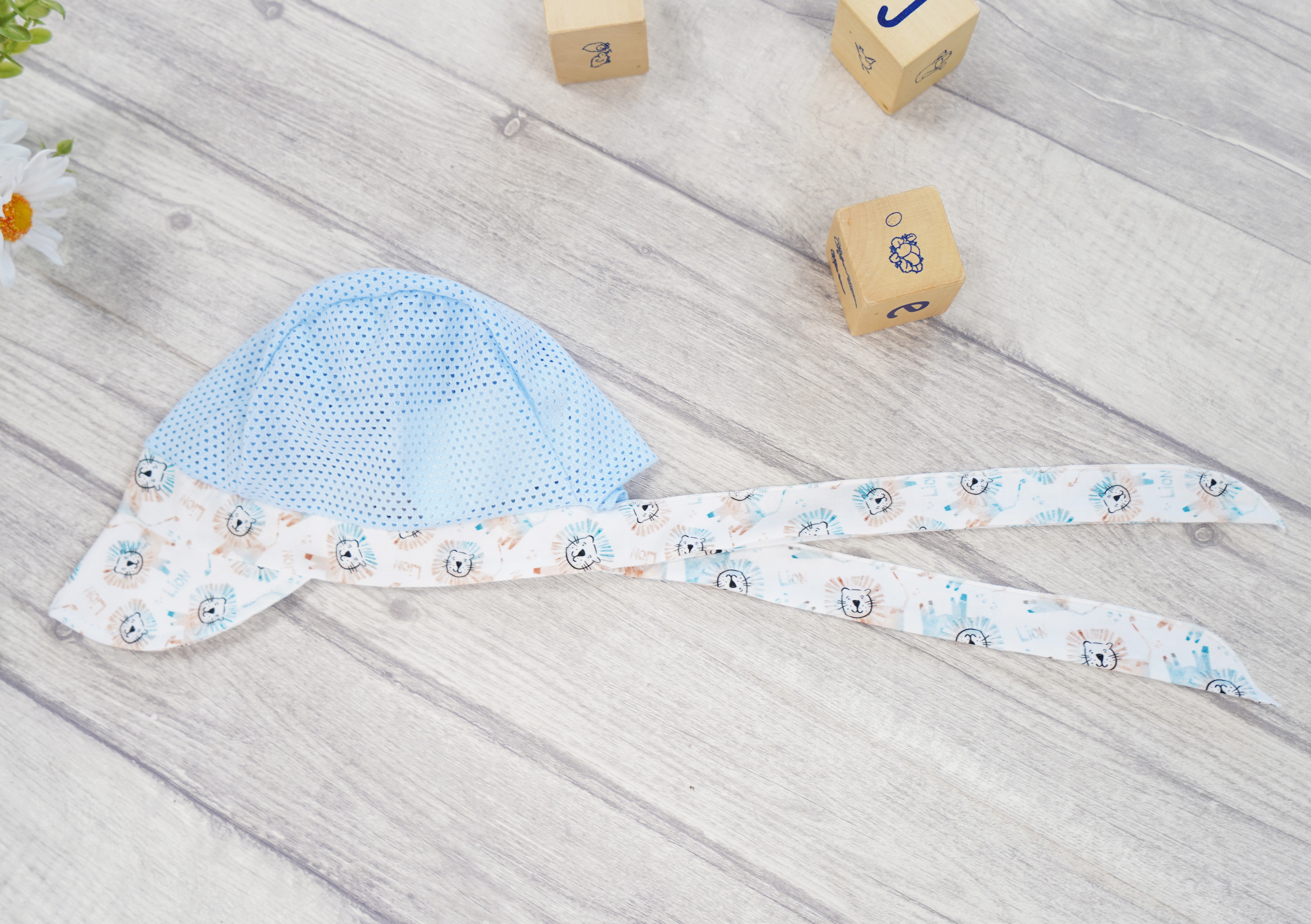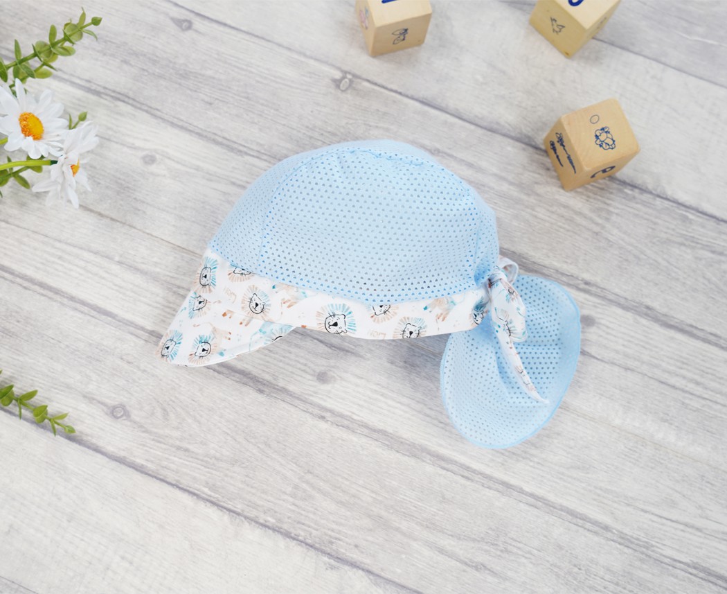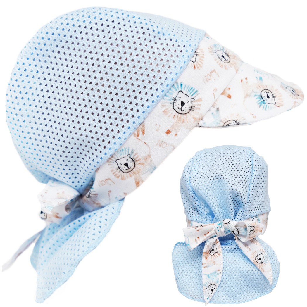 Letnia czapeczka dziecięca z elastycznym daszkiem. Czapka dla dziecka przeciw poceniu się głowy wykonana została z miękkiej, dziurkowanej bawełny z niewielkim dodatkiem elastanu. Daszek i wiązanie wykonane są z bawełny drukowanej. Czapka wiązana jest przy karku dzięki czemu można dopasować ją do wielkości główki i rośnie razem z dzieckiem. Czapka na lato posiada długi tył z oddychającego materiału, dzięki któremu kark dziecka chroniony jest przed promieniami słońca i przegrzaniem, a przedni daszek chroni oczy. Dzięki wykorzystaniu bardzo miękkiej tkaniny nie spowoduje podrażnień oraz zapobiegnie przetarciom nawet na wrażliwej skórze maluszka.