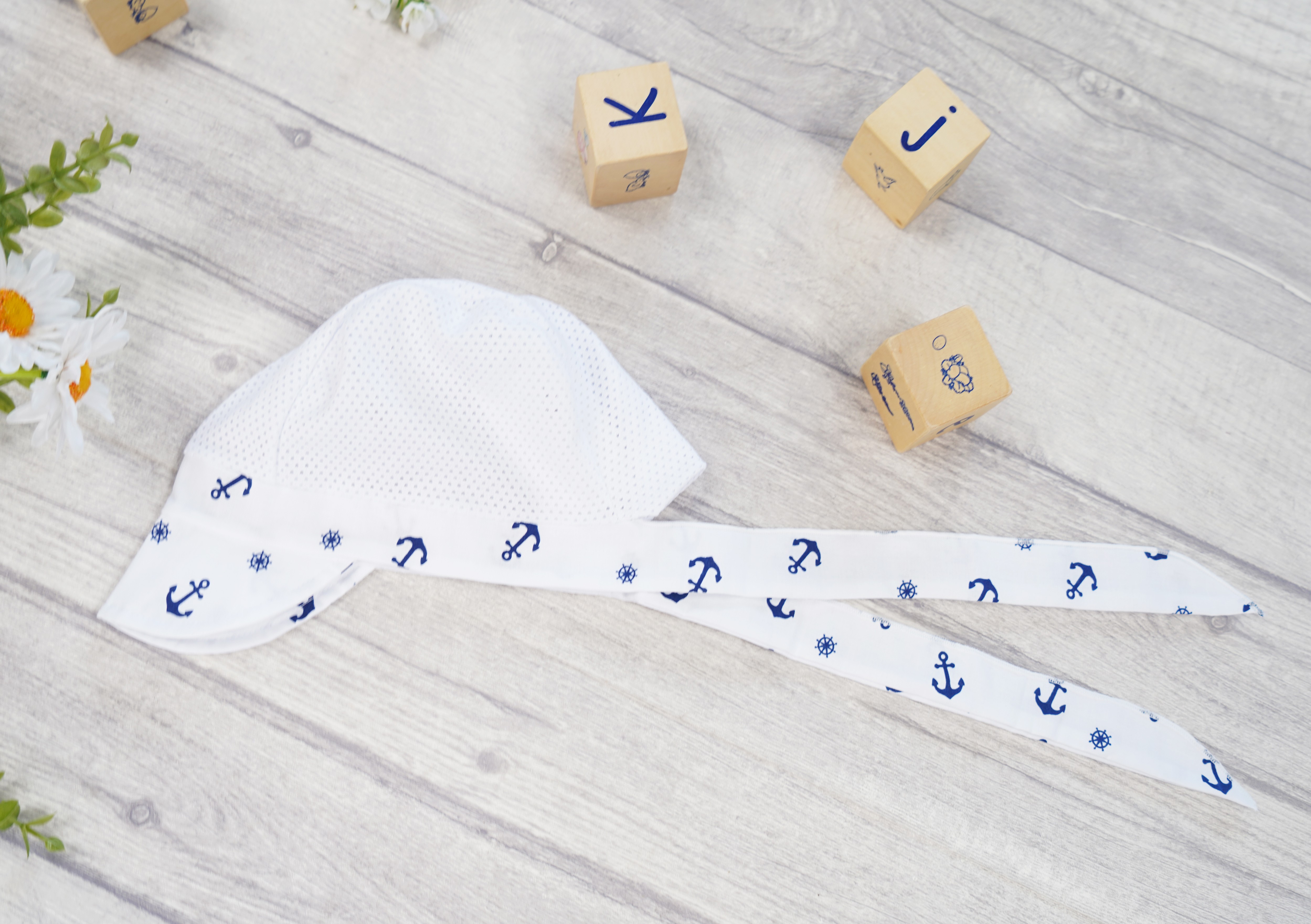 Biała czapka z długim tyłem i daszkiem, wiązana w kotwice - przeciw poceniu głowy