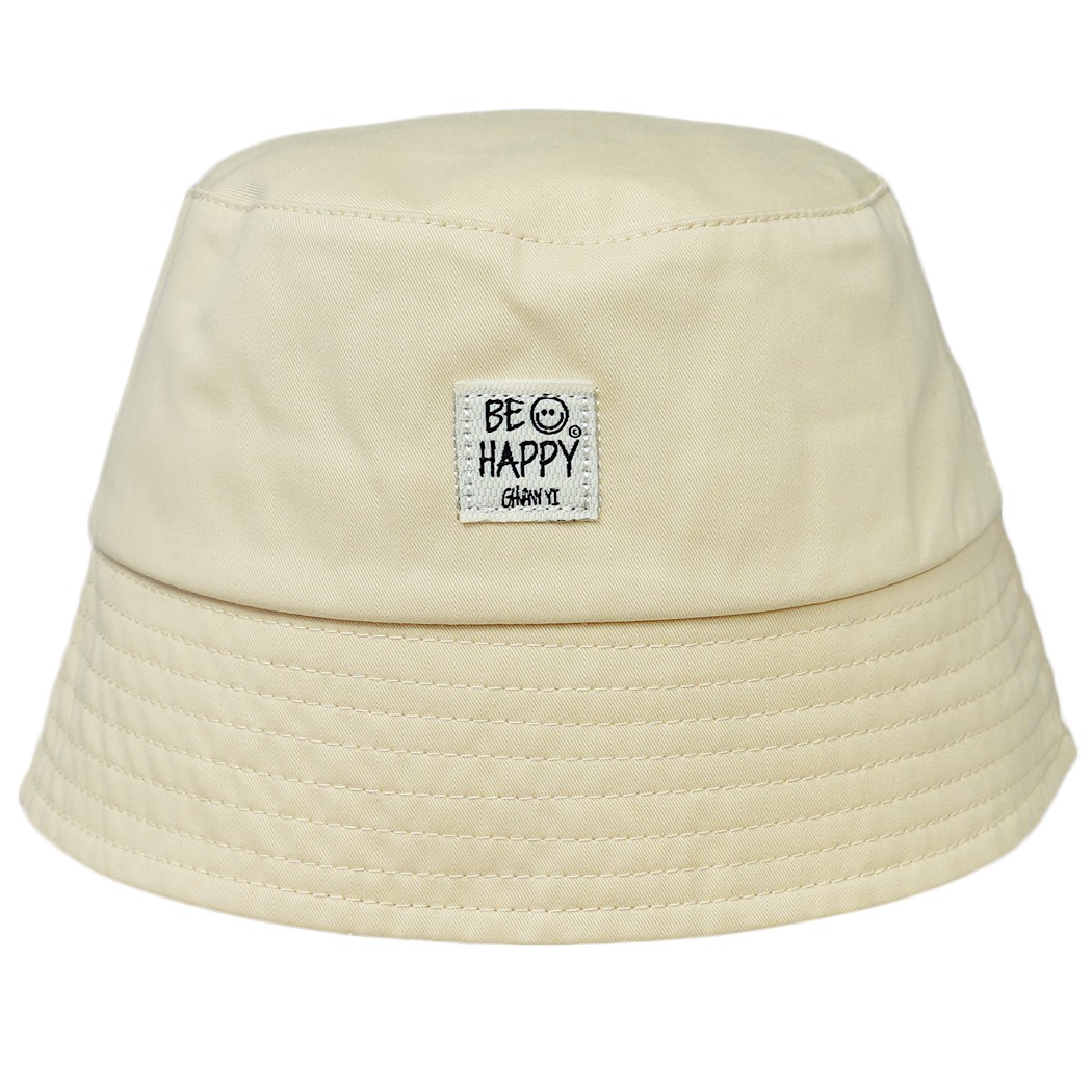 Kapelusz dziecięcy typu bucket hat w kolorze beżowym z naszywka z napisem BE HAPPY. Wykonany przez polskiego producenta ze 100% bawełny. Czapka typu bucket hat to zdecydowany hit lata ale także funkcjonalne i praktyczne nakrycie głowy.