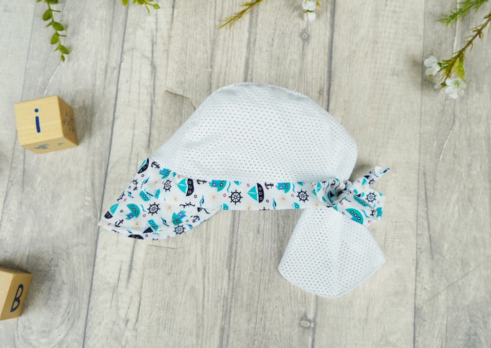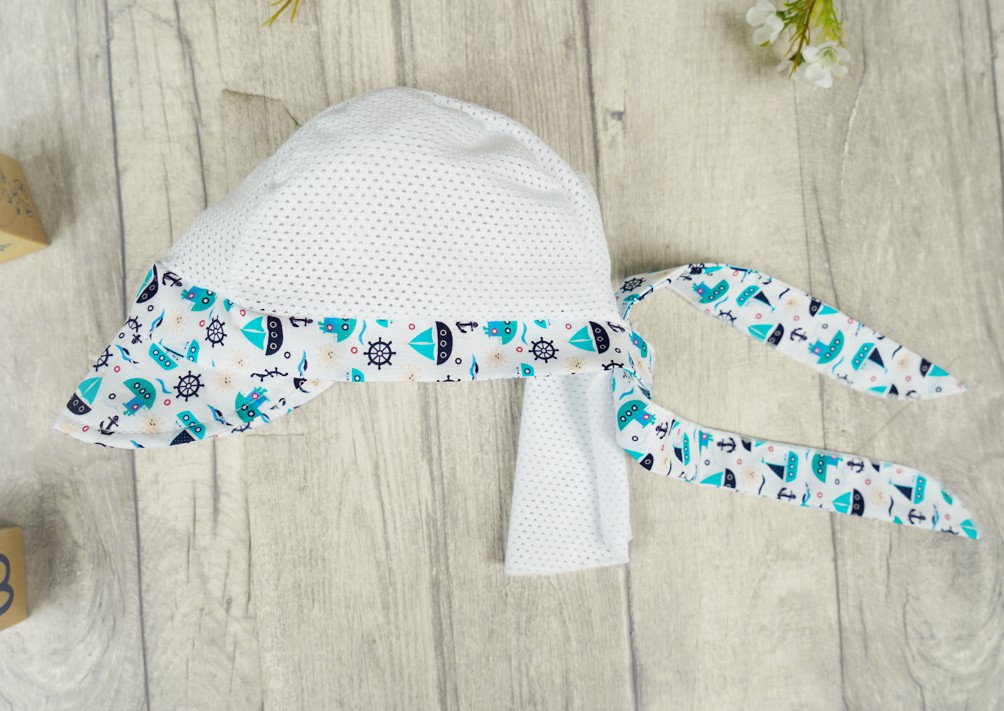Letnia czapeczka dziecięca z elastycznym daszkiem. Czapka dla dziecka przeciw poceniu się głowy wykonana została z miękkiej, dziurkowanej bawełny z niewielkim dodatkiem elastanu. Daszek i wiązanie wykonane są z bawełny drukowanej. Czapka wiązana jest przy karku dzięki czemu można dopasować ją do wielkości główki i rośnie razem z dzieckiem. Czapka na lato posiada długi tył z oddychającego materiału, dzięki któremu kark dziecka chroniony jest przed promieniami słońca i przegrzaniem, a przedni daszek chroni oczy. Dzięki wykorzystaniu bardzo miękkiej tkaniny nie spowoduje podrażnień oraz zapobiegnie przetarciom nawet na wrażliwej skórze maluszka.