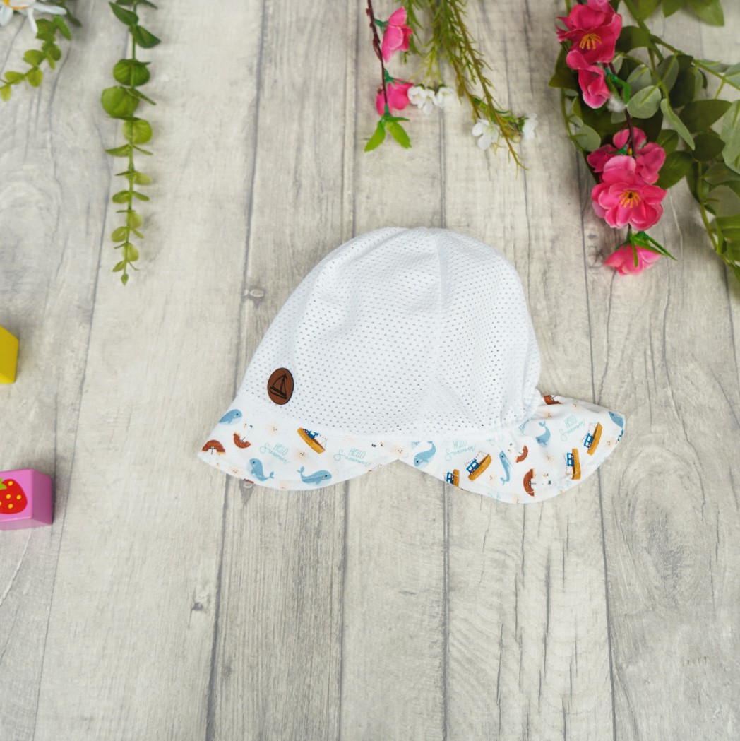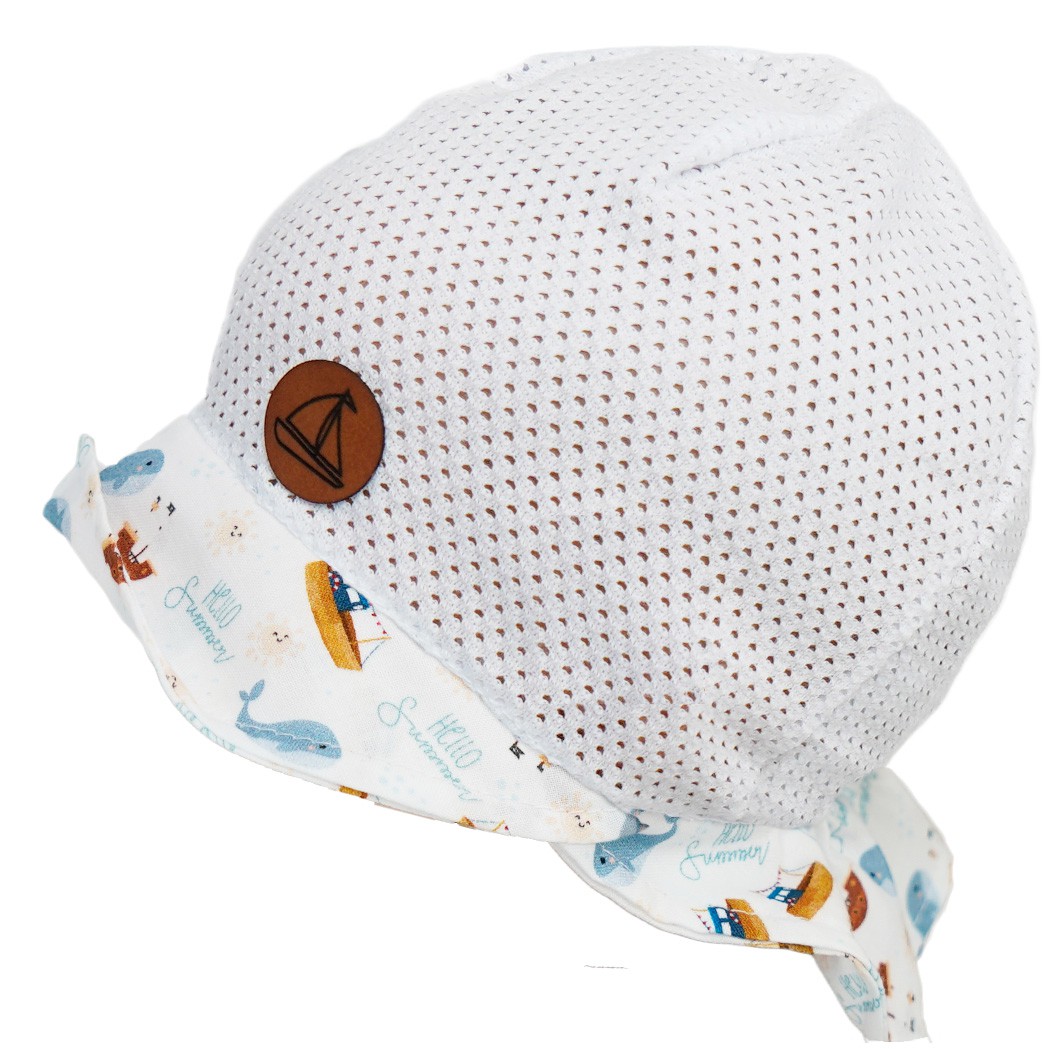 Biały kapelusz wykonany z przewiewnej siateczki zapobiegającej poceniu się główki. Czapka na lato posiada miękki ozdobny daszek oraz specjalne przedłużenie z tyłu aby ochronić kark dziecka. Kapelusik delikatnie się rozciąga dzięki wszytej z tyłu gumce. Oferowany model to kapelusz odpowiedni jako letnie nakrycie główki dziecka.