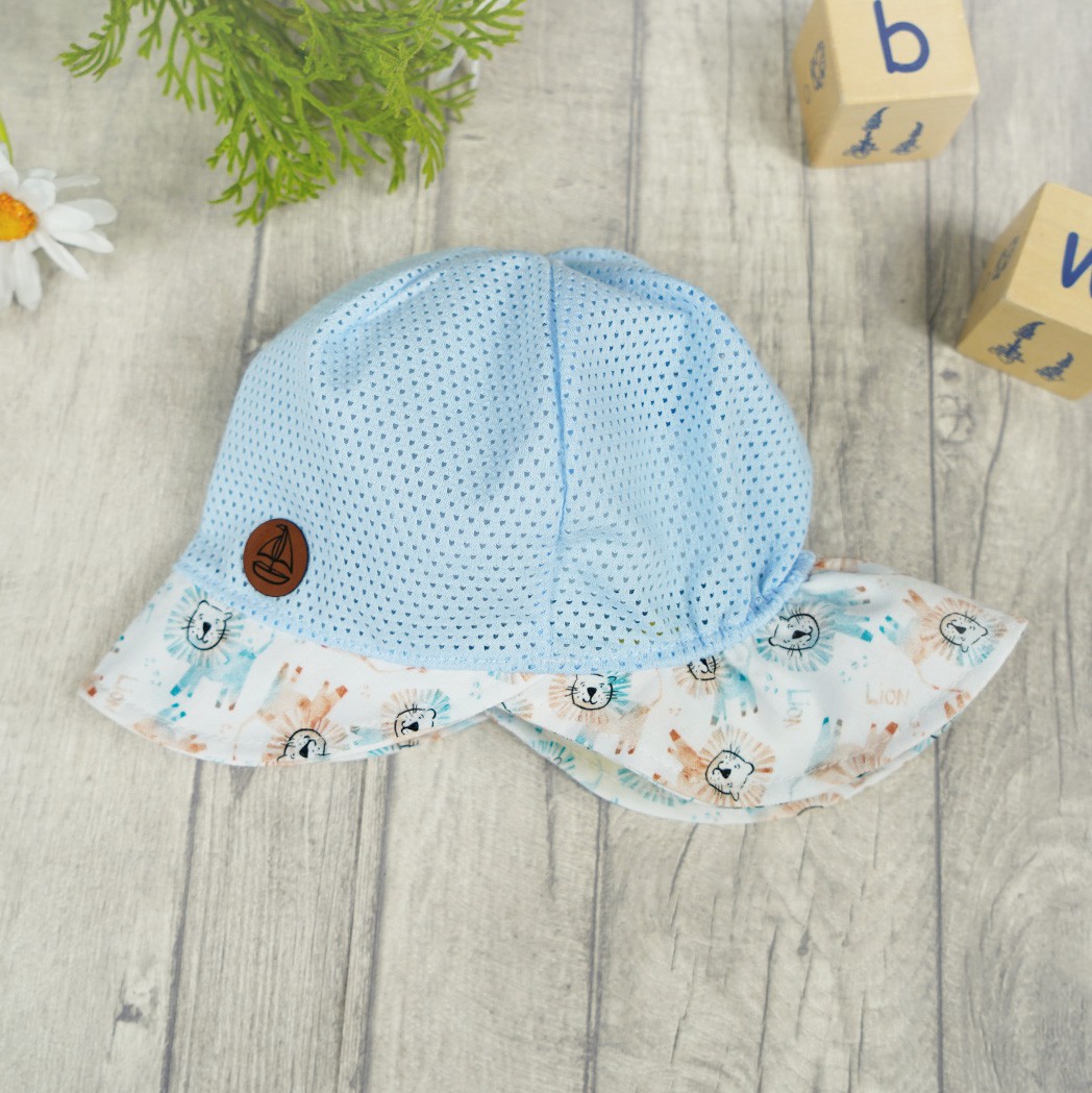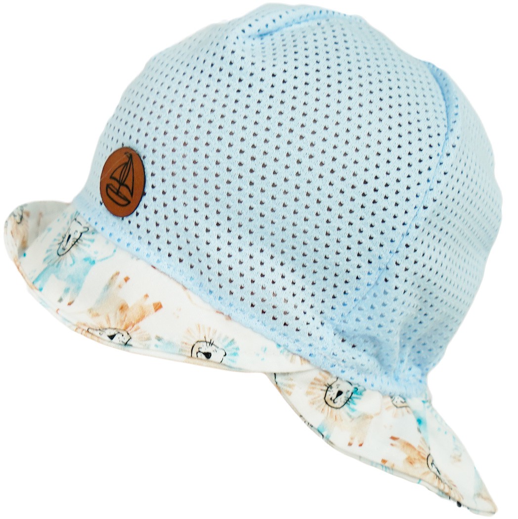 Niebieski kapelusz wykonany z przewiewnej siateczki zapobiegającej poceniu się główki. Czapka na lato posiada miękki ozdobny daszek oraz specjalne przedłużenie z tyłu aby ochronić kark dziecka. Kapelusik delikatnie się rozciąga dzięki wszytej z tyłu gumce. Oferowany model to kapelusz odpowiedni jako letnie nakrycie główki dziecka.