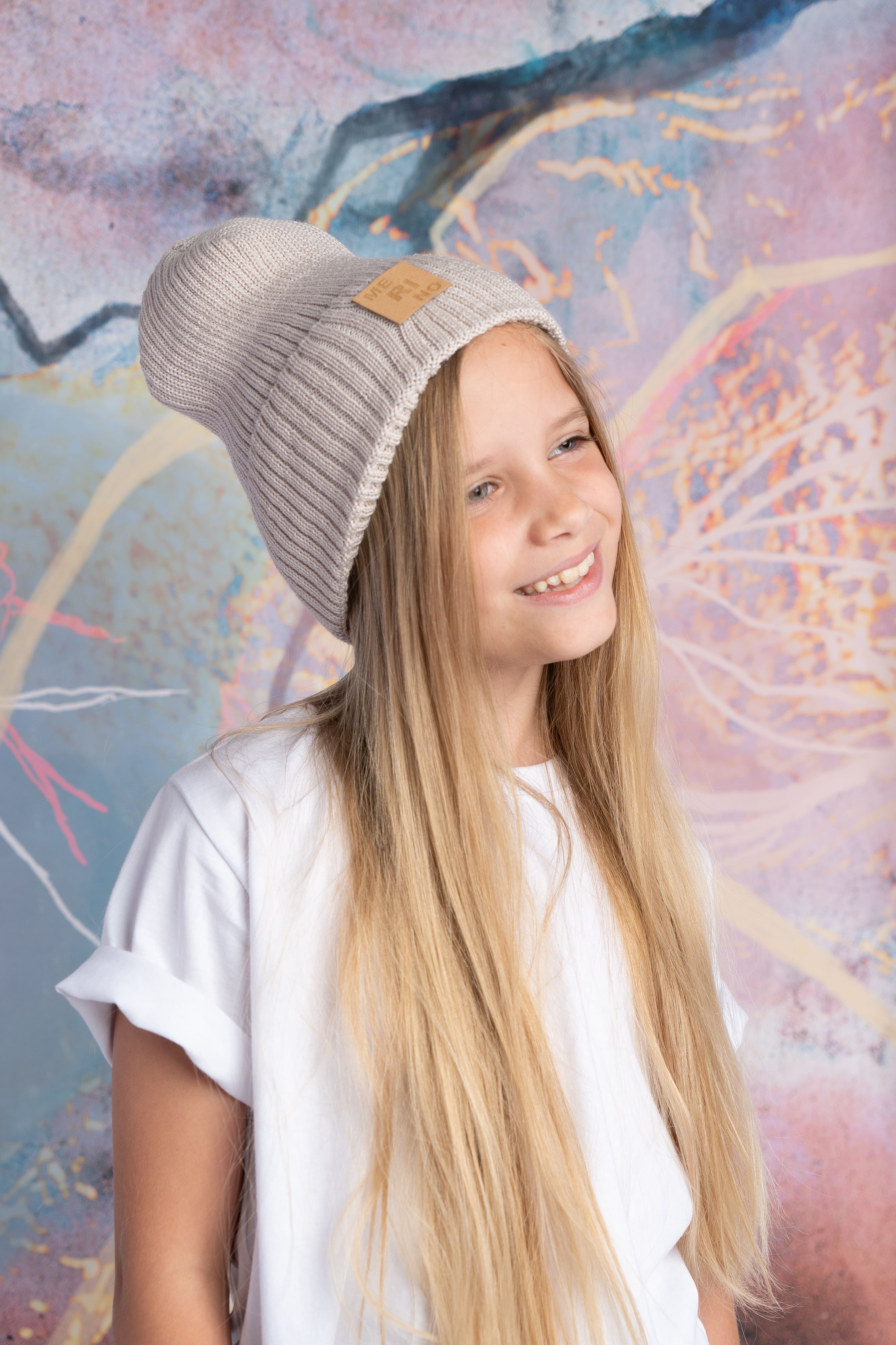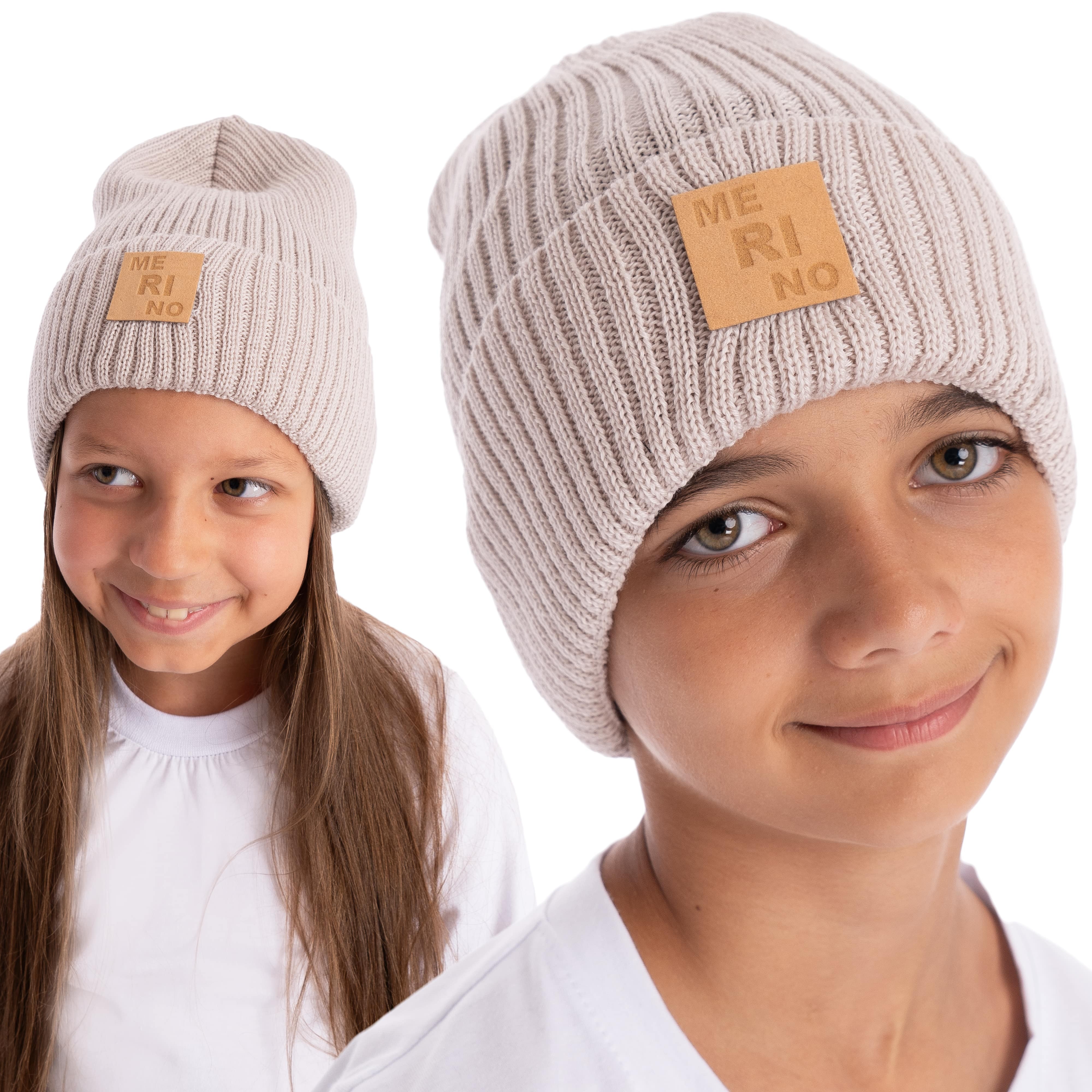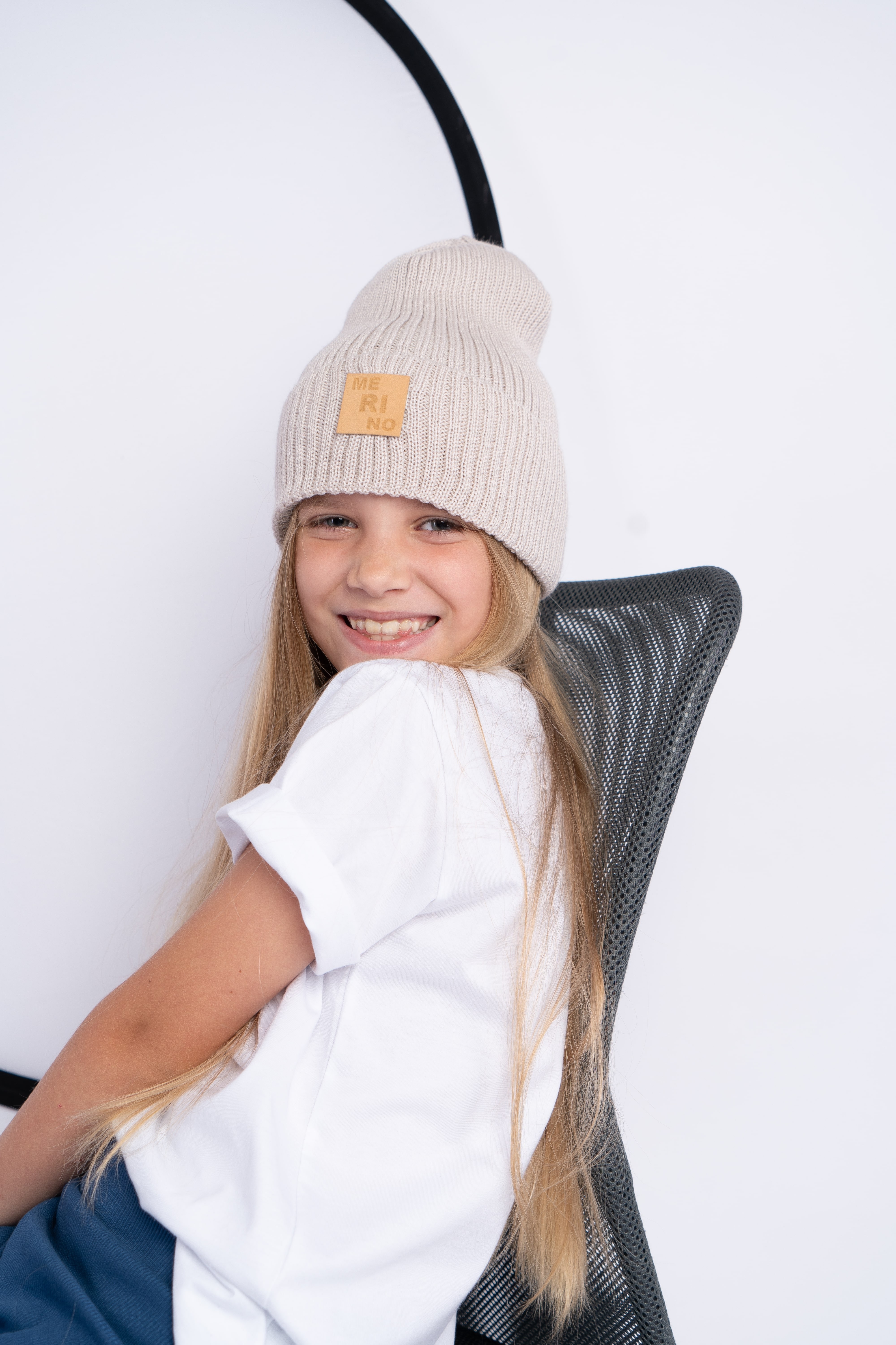 Podwijana czapka dziecięca 100% MERINO w kolorze beżowym