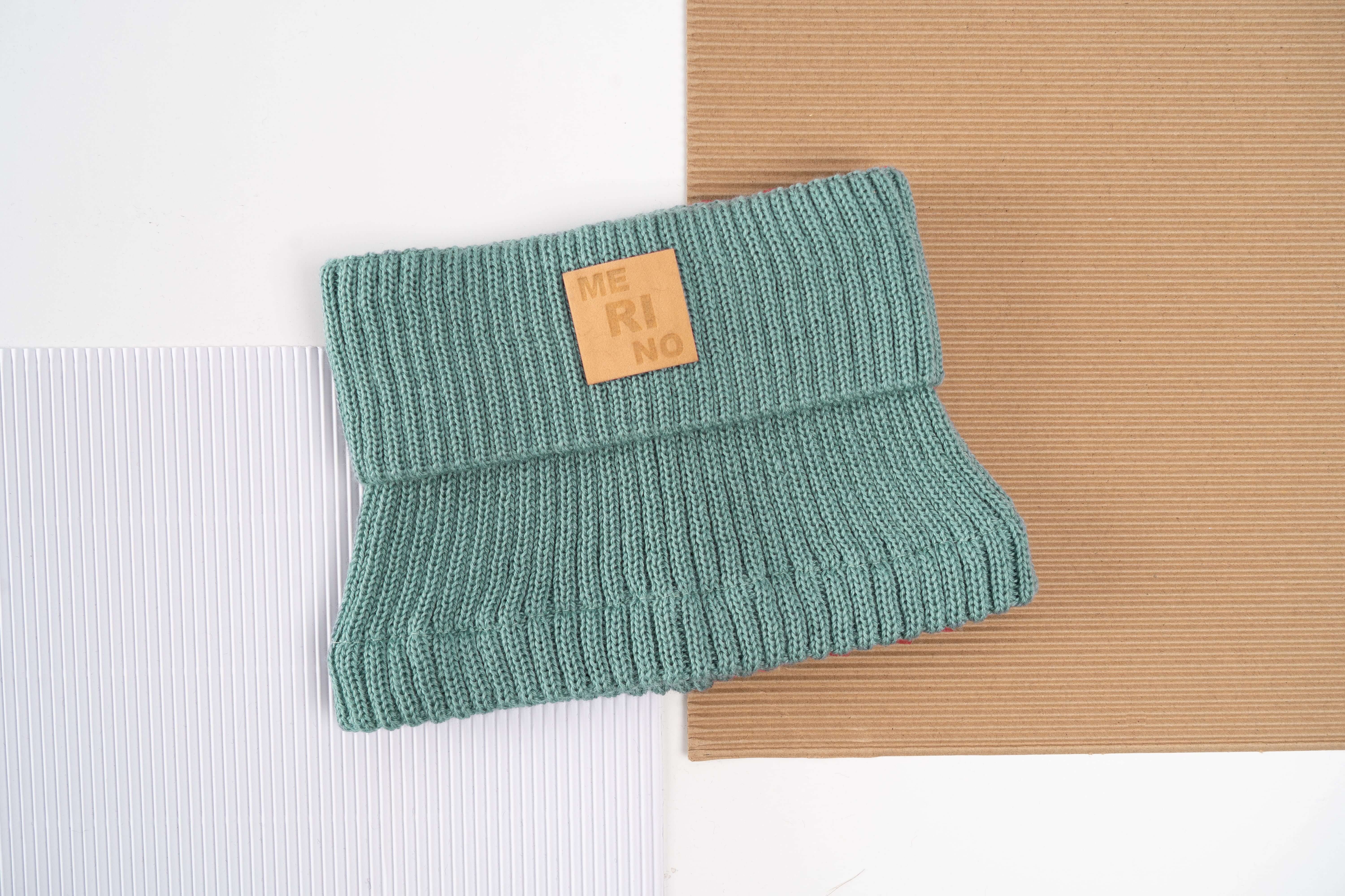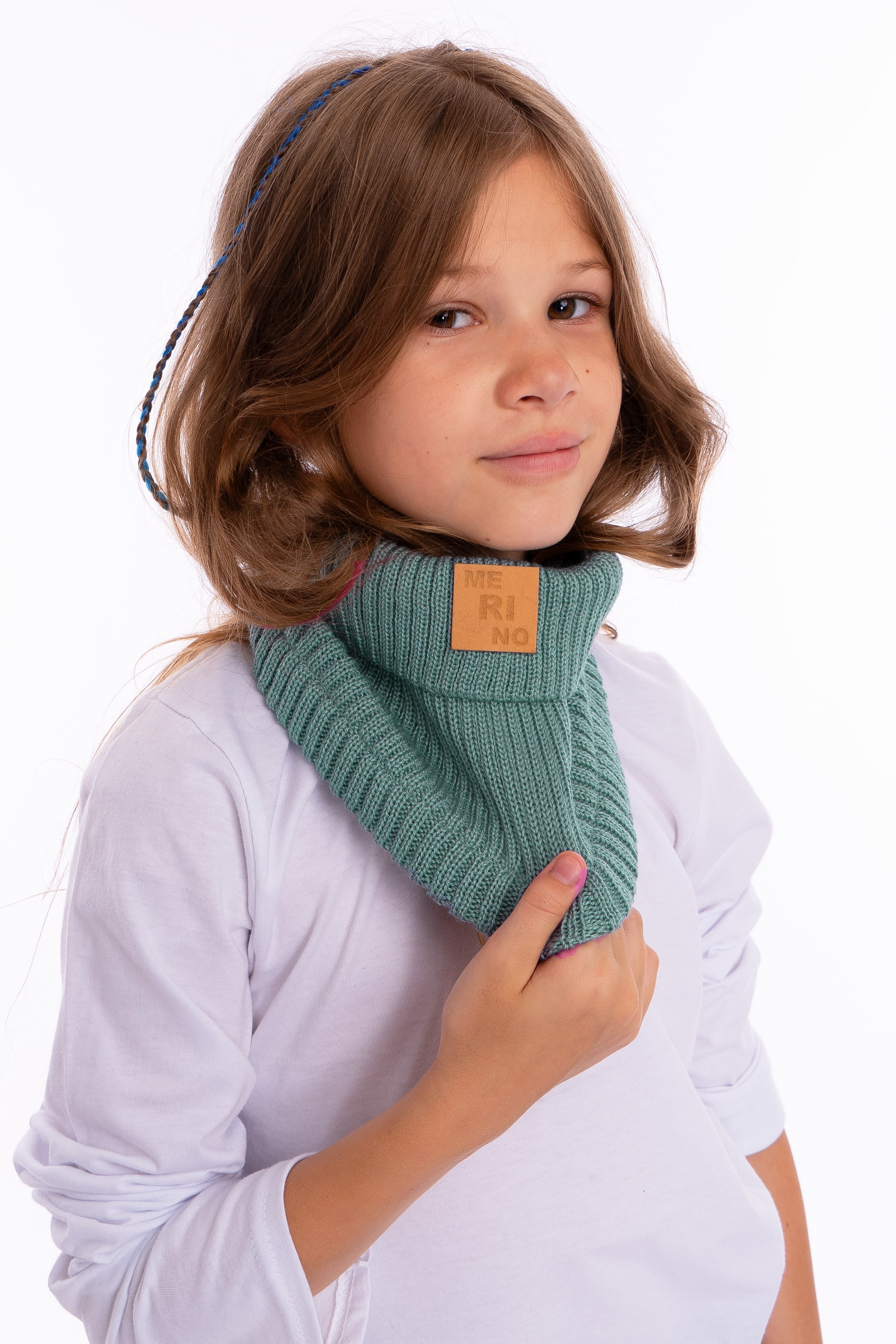 Wywijany komin dziecięcy 100% MERINO w kolorze szałwiowym.