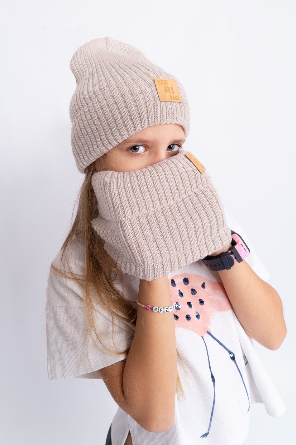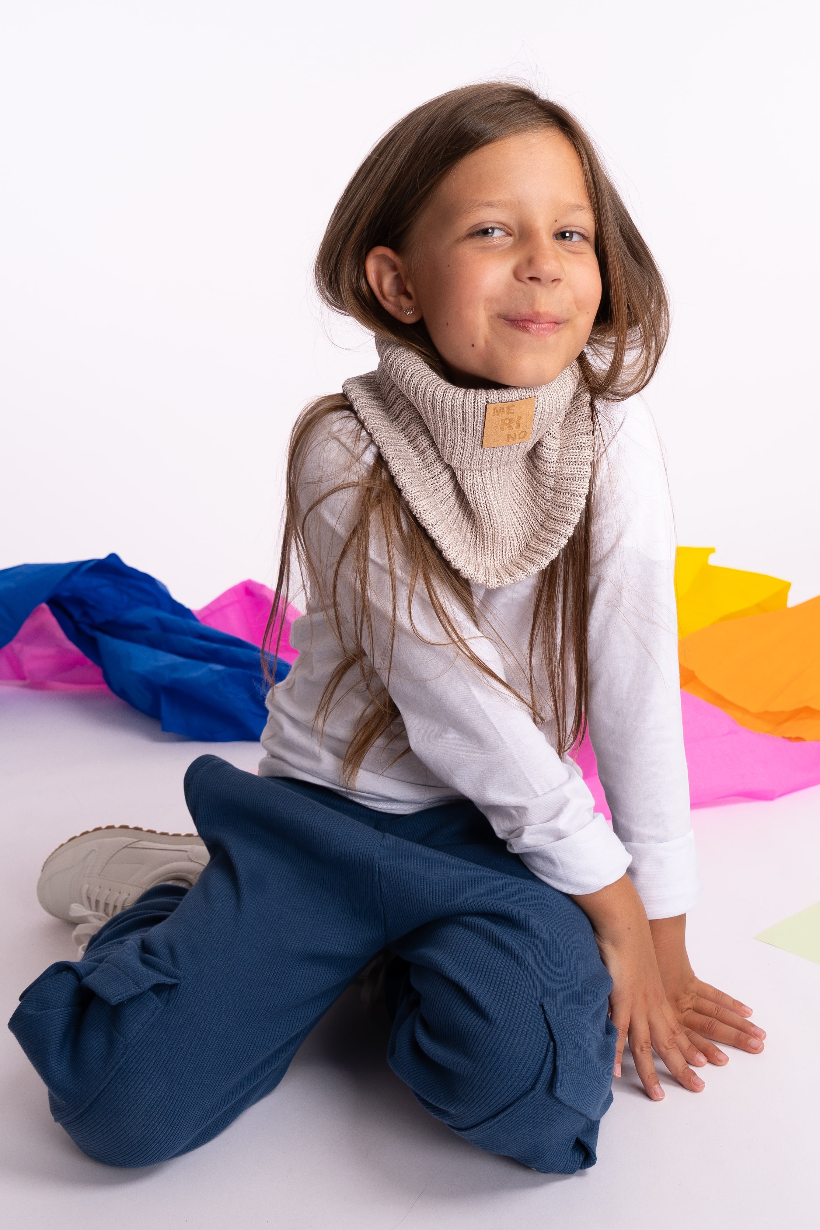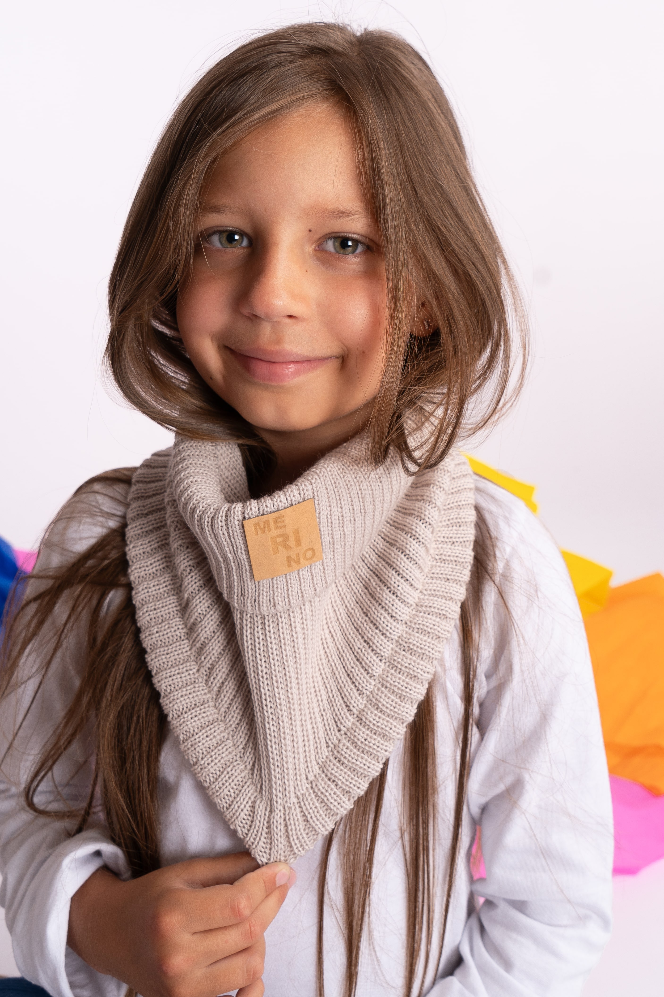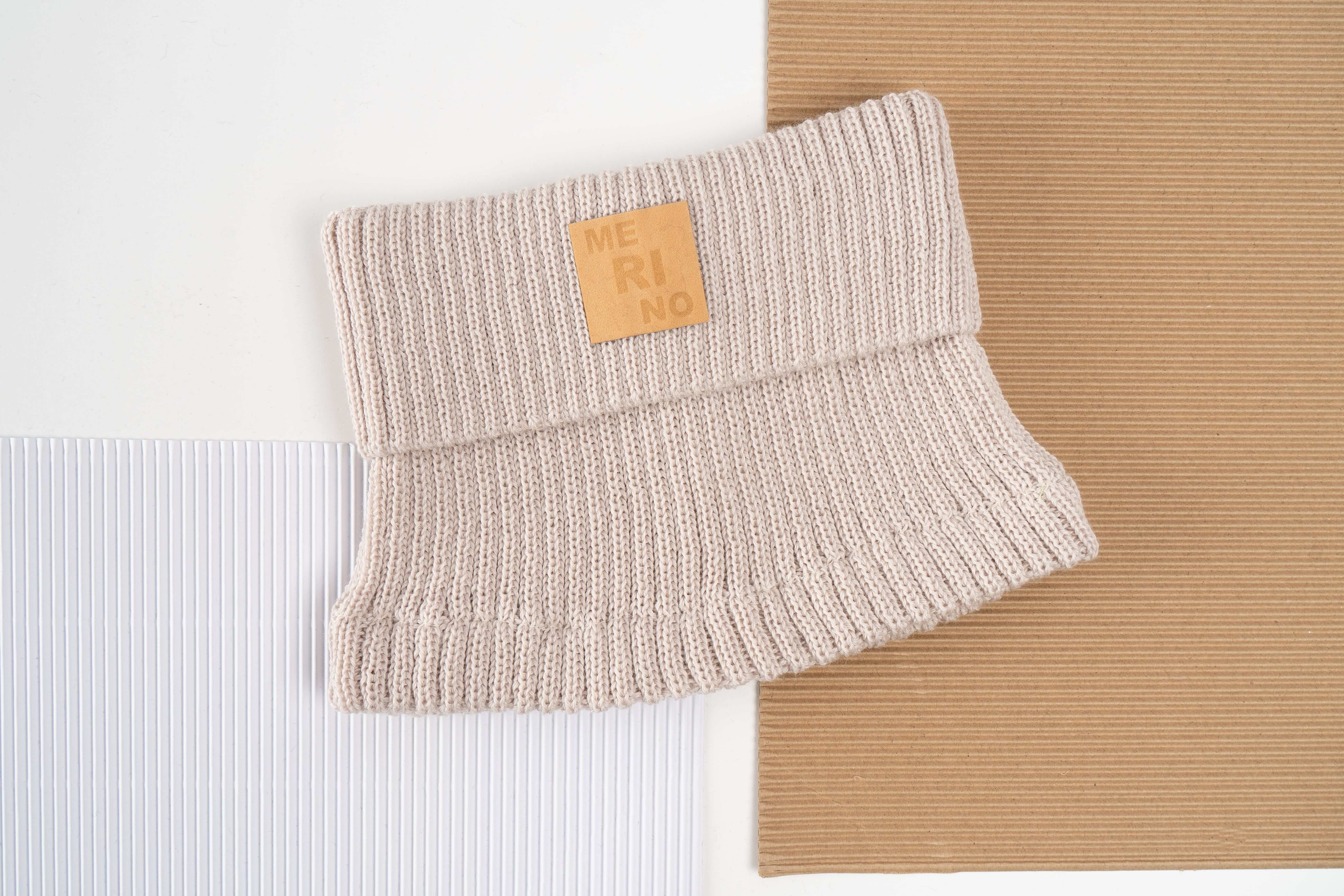 Wywijany komin dziecięcy 100% MERINO w kolorze beżowym.