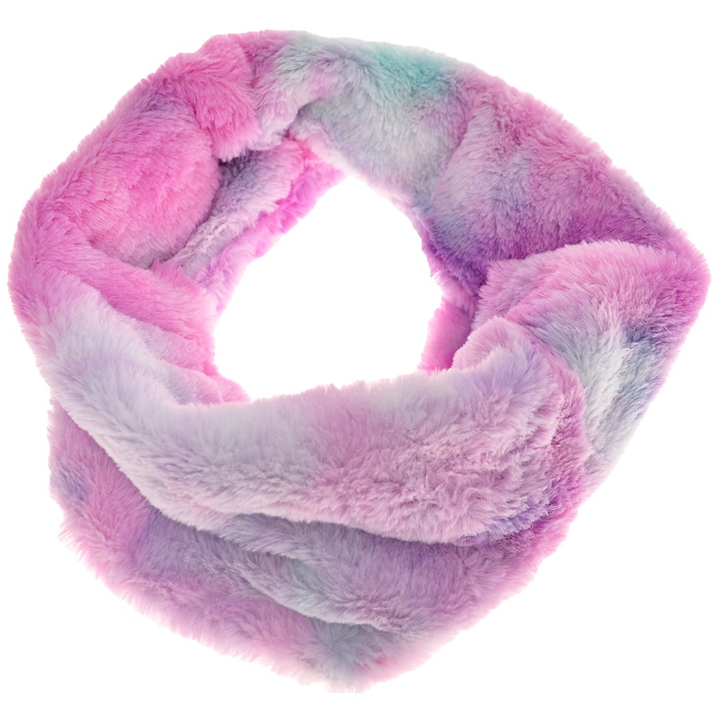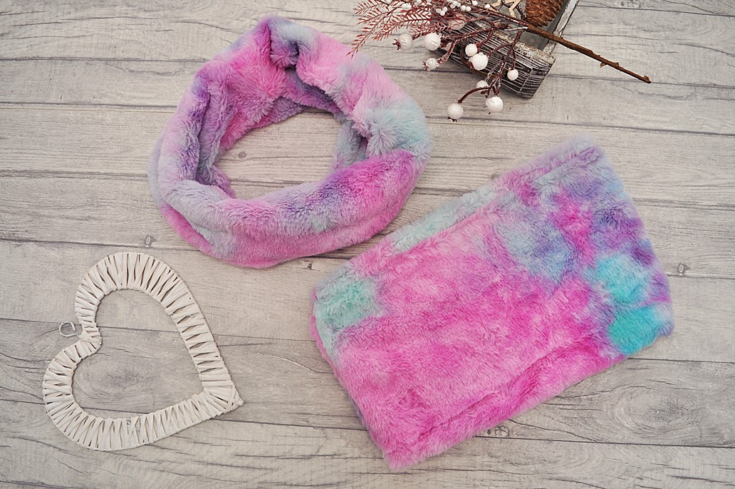 Futrzany komin zimowy dla dziewczynki w tęczowych kolorach.