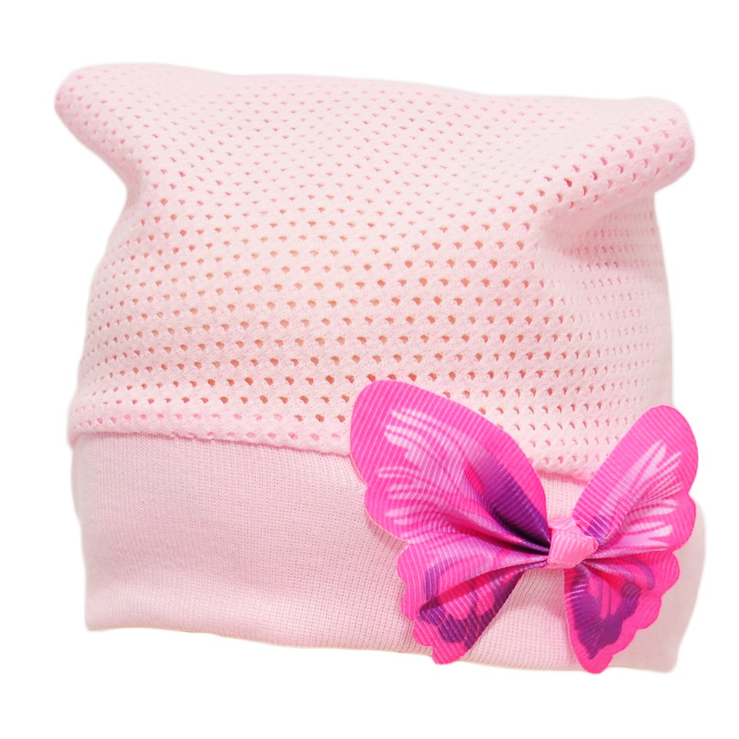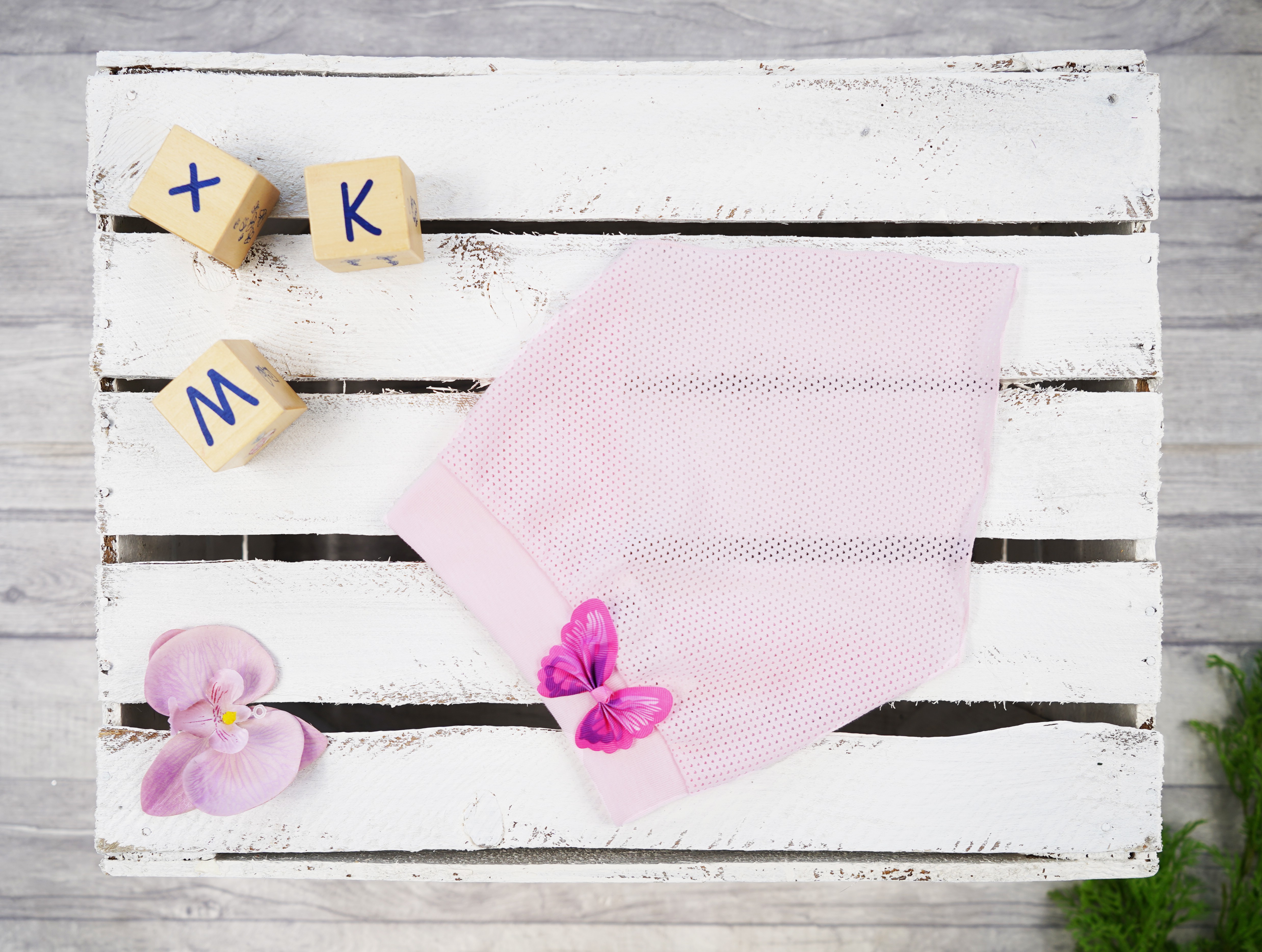 Letnia czapeczka dziewczęca typu chusta z delikatnym ściągaczem. Chusta dla dziewczynki wykonana została z miękkiej, atestowanej dzianiny z ażurowym siateczkowym wzorem a doszyta aplikacja motyla dodaje chuście dodatkowego uroku. Idealnie ochroni główkę dziecka przed przegrzaniem, a dzięki wykorzystaniu bardzo miękkiej tkaniny nie spowoduje podrażnień oraz zapobiegnie przetarciom nawet na wrażliwej skórze maluszka.