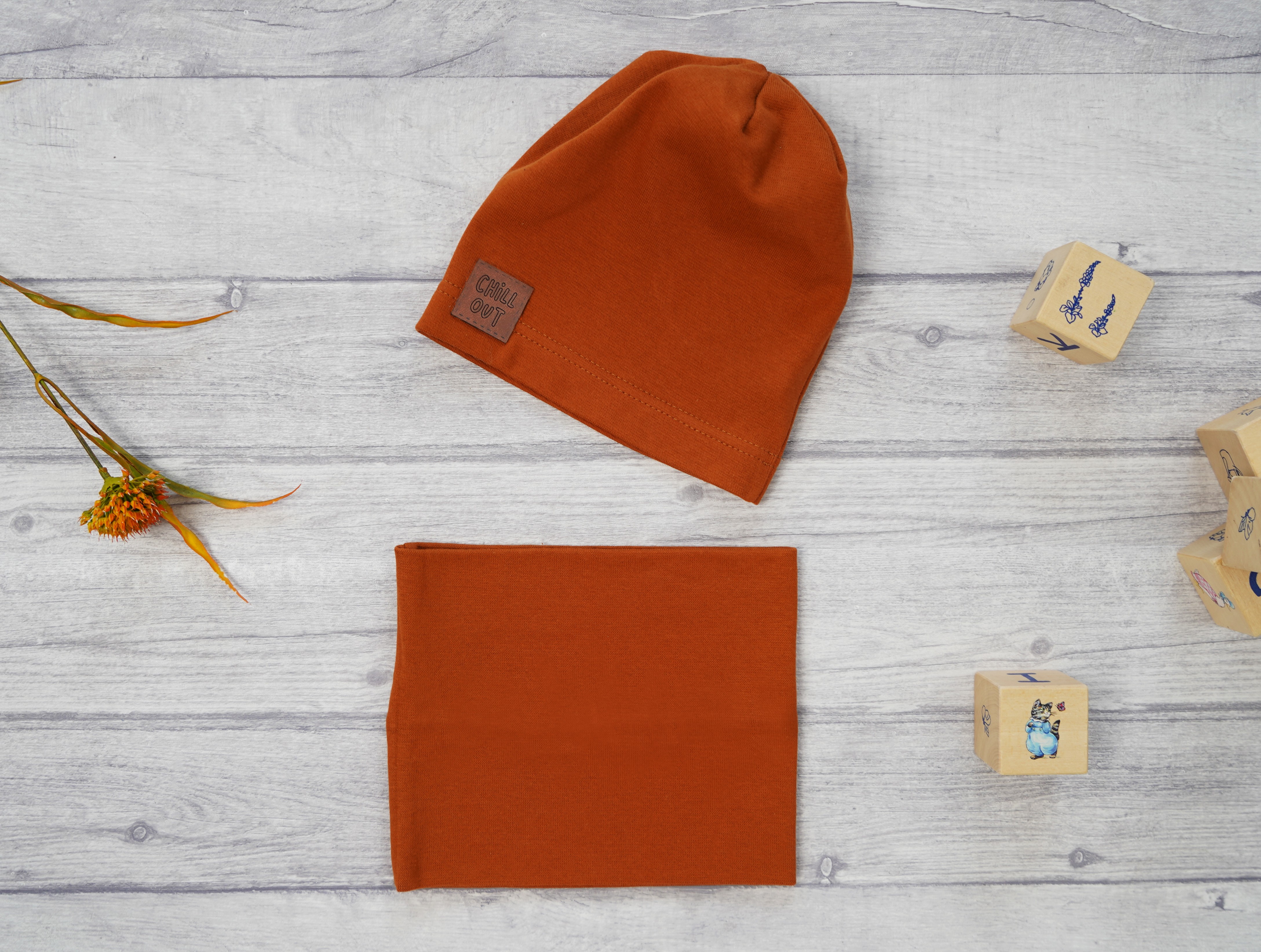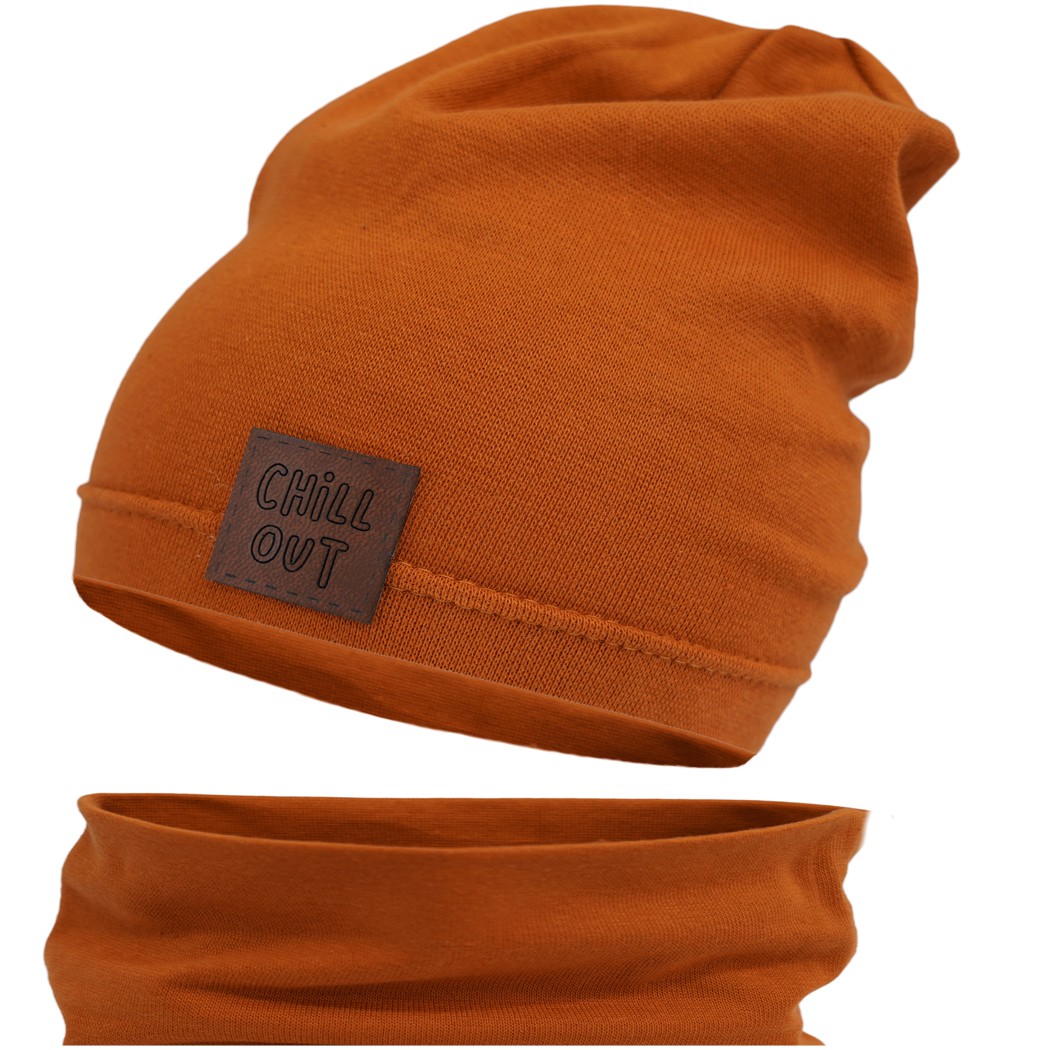 W skład kompletu wchodzi rdzawo- brązowa, bawełniana czapka. Oferowany model to dziecięca czapeczka z wyszytą aplikacja z napisem CHILL OUT, odpowiednia zarówno jako czapeczka wiosenna, jak i czapeczka jesienna. Uzupełnieniem czapeczki jest komin w tym samym kolorze.