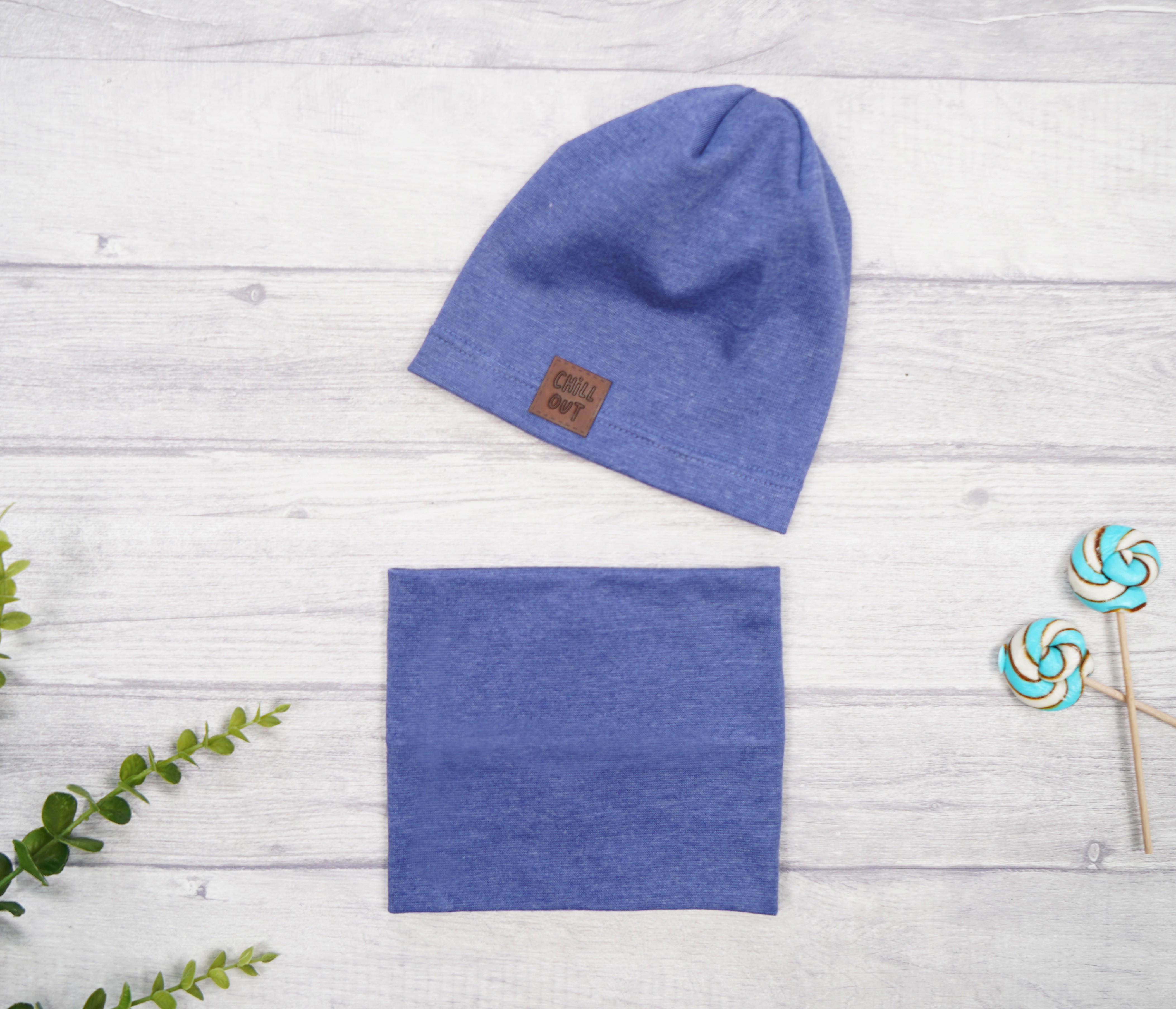 W skład kompletu wchodzi bawełniana czapka w kolorze jeansowym. Oferowany model to dziecięca czapeczka z wyszytą aplikacja z napisem CHILL OUT, odpowiednia zarówno jako czapeczka wiosenna, jak i czapeczka jesienna. Uzupełnieniem czapeczki jest komin w tym samym kolorze.