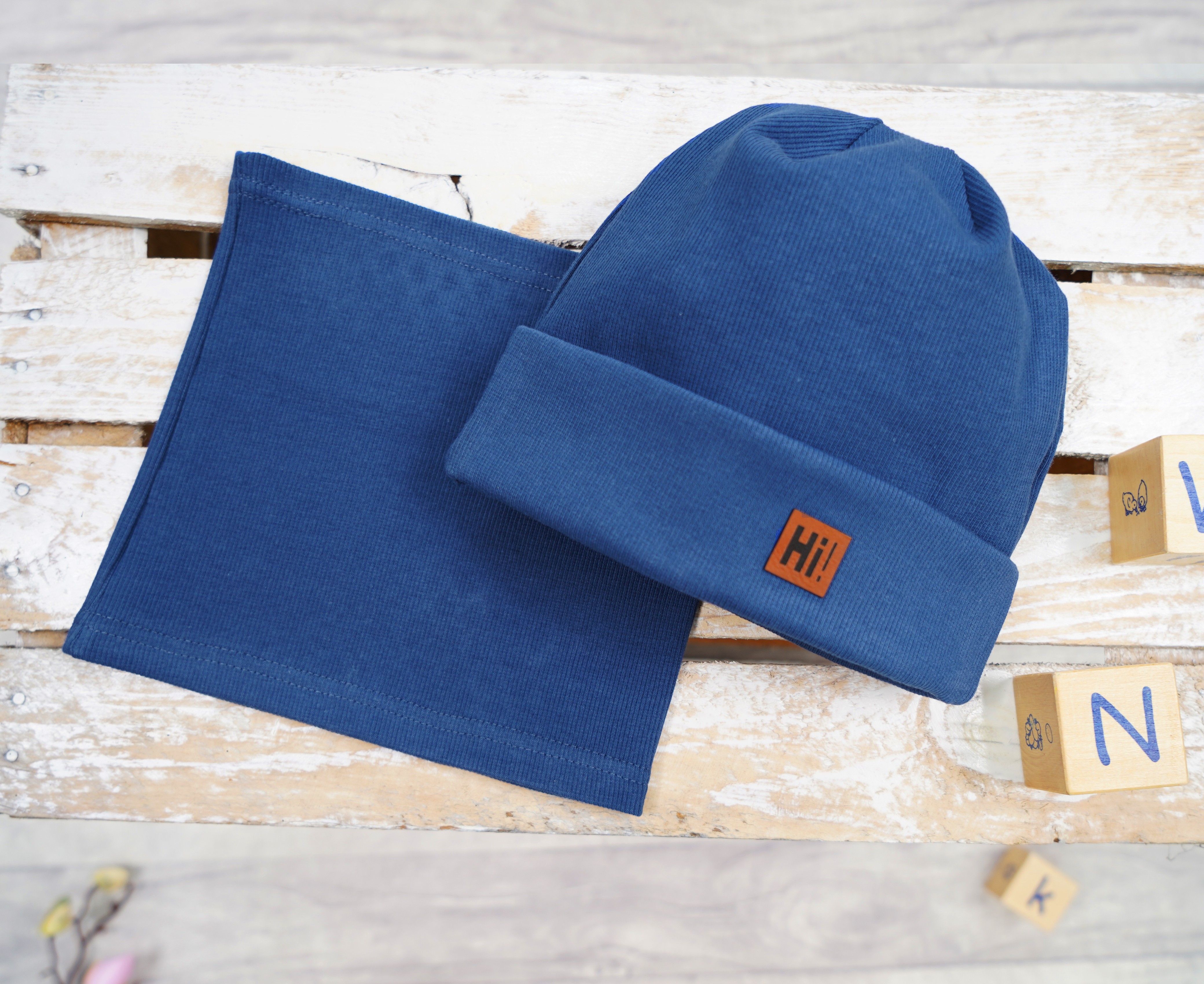 W skład kompletu wchodzi bawełniana czapka w kolorze jeansowym. Oferowany model to czapeczka z bawełny prążkowanej z wyszytą aplikacją z napisem HI! Odpowiednia zarówno jako czapeczka wiosenna, jak i czapeczka jesienna. Uzupełnieniem czapeczki jest komin w tym samym kolorze. Komplet posiada jedną warstwę, czapka podwijana, dzięki czemu pełni funkcję ochronną dla uszu.