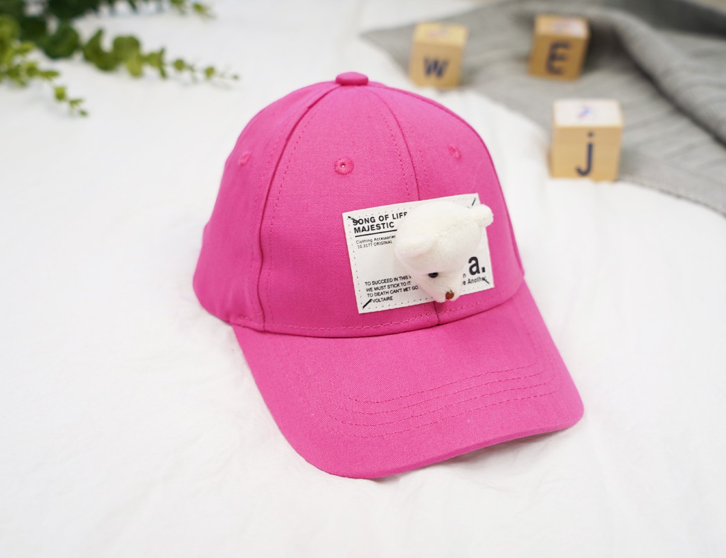 Amarantowa czapeczka dziecięca z profilowanym, twardym daszkiem, typ bejsbolówka. Przód czapki zdobi biało- czarna aplikacja przypominająca gazetę i maskotka- głowa misia! Czapka posiada wszytą z tyłu wpuszczaną regulację oraz małe otworki wentylacyjne. Oferowany model to ponadczasowa dziecięca bejsbolówka, odpowiednia jako czapeczka na wiosnę i lato.