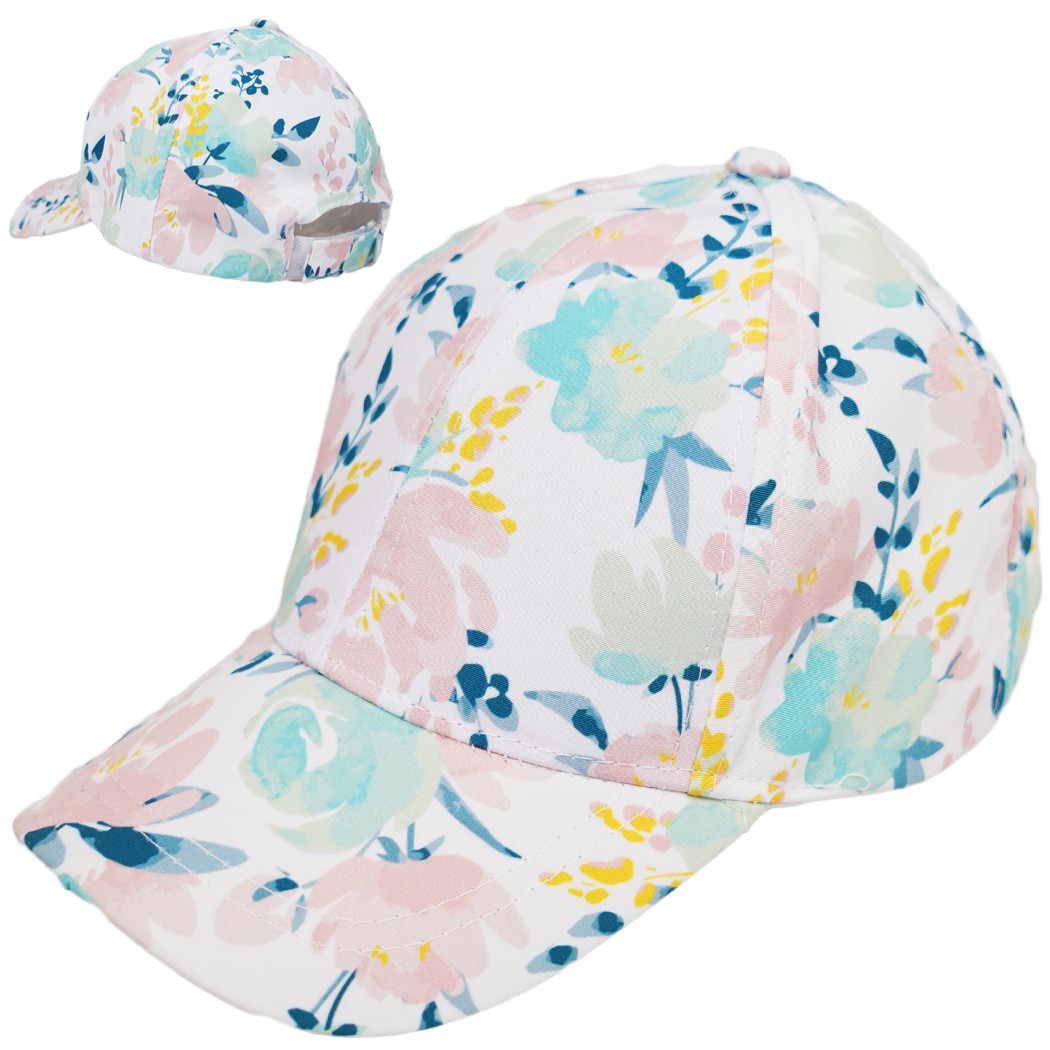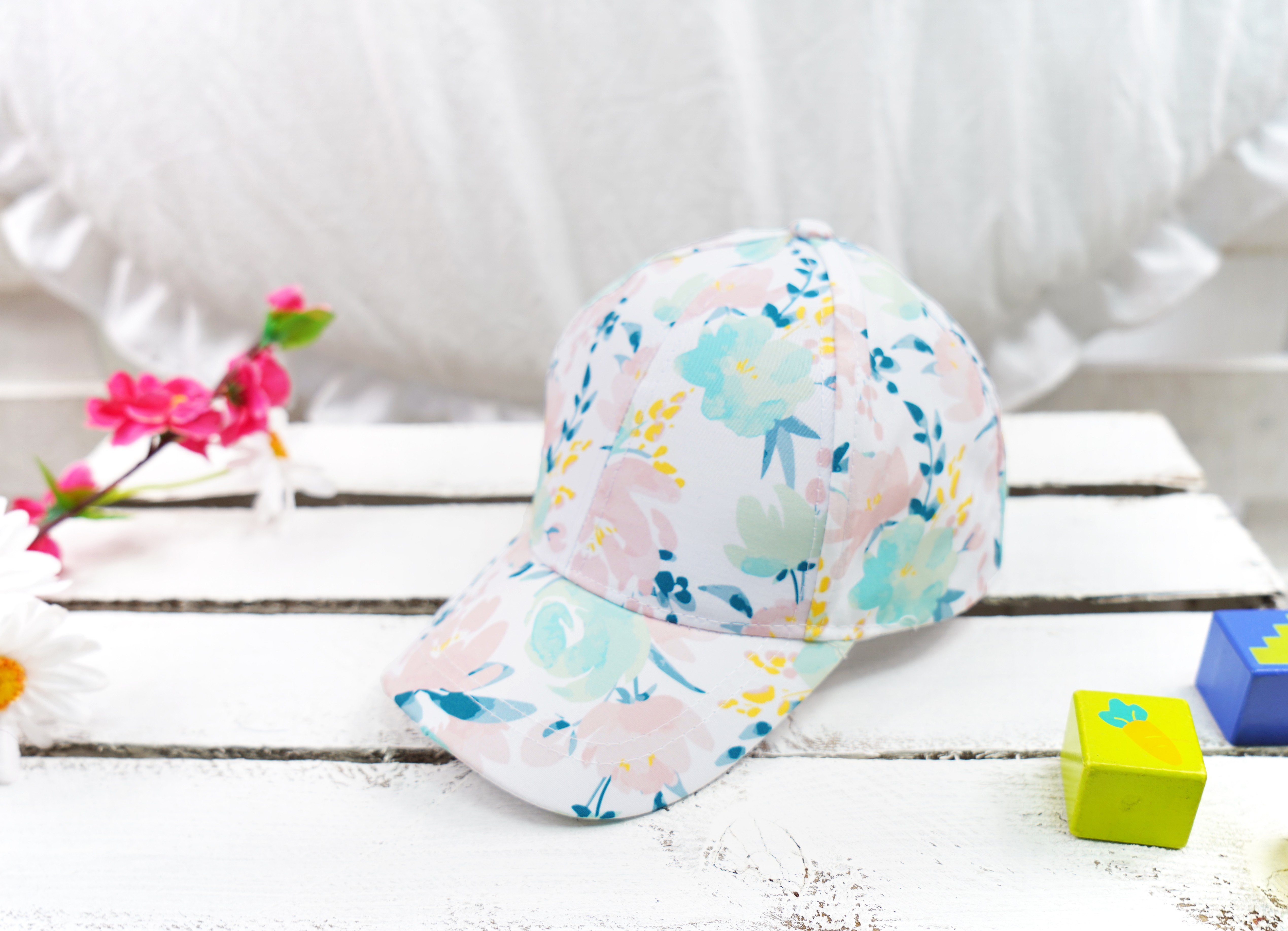 Biała czapeczka dziewczęca z profilowanym, twardym daszkiem, typ bejsbolówka. Czapka zrobiona jest w całości białym, drukowanym materiałem w pudrowe kwiaty i liście ! Czapeczka posiada wszytą z tyłu regulację. Oferowany model to ponadczasowa dziecięca bejsbolówka, odpowiednia jako czapeczka na wiosnę i lato.