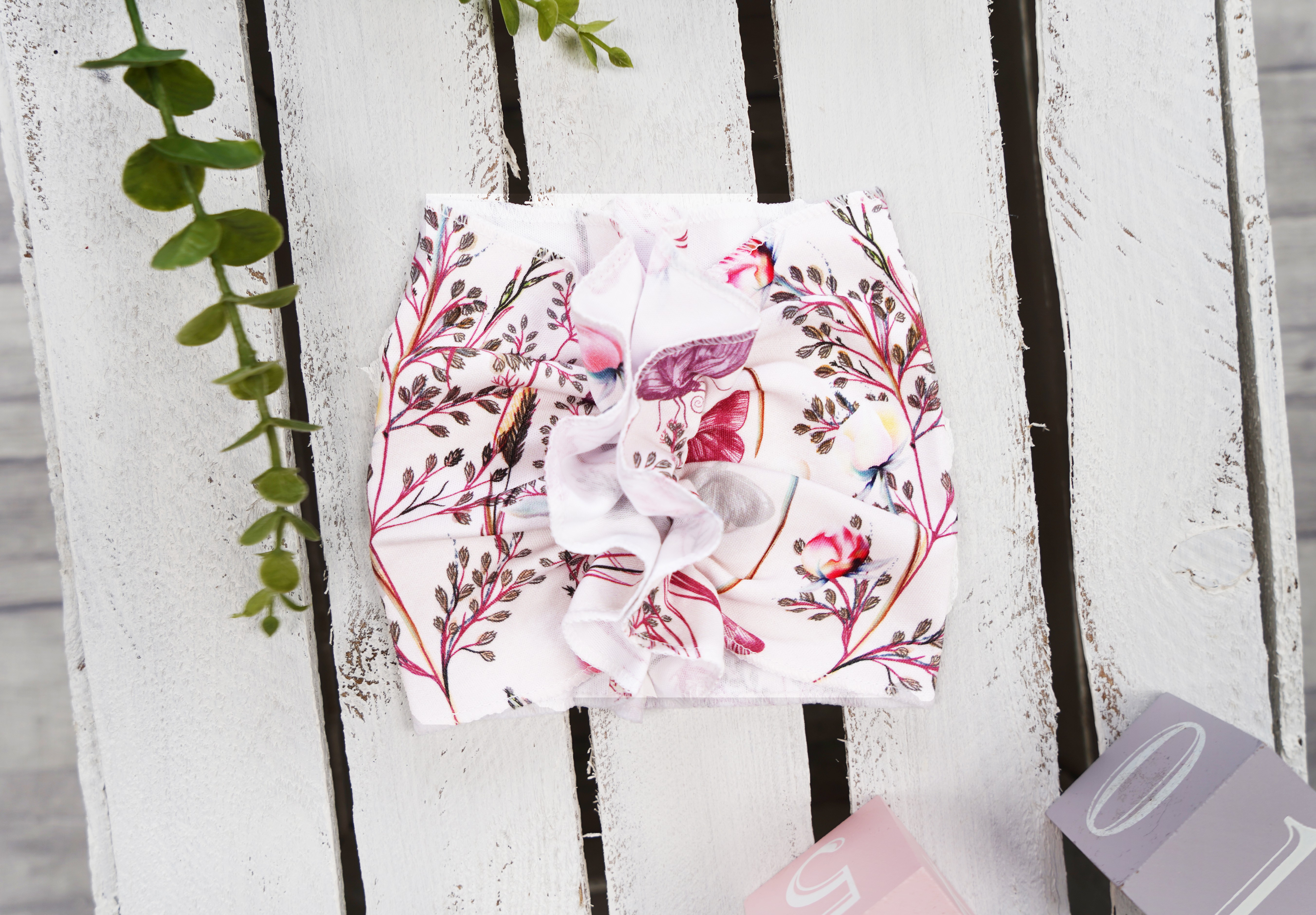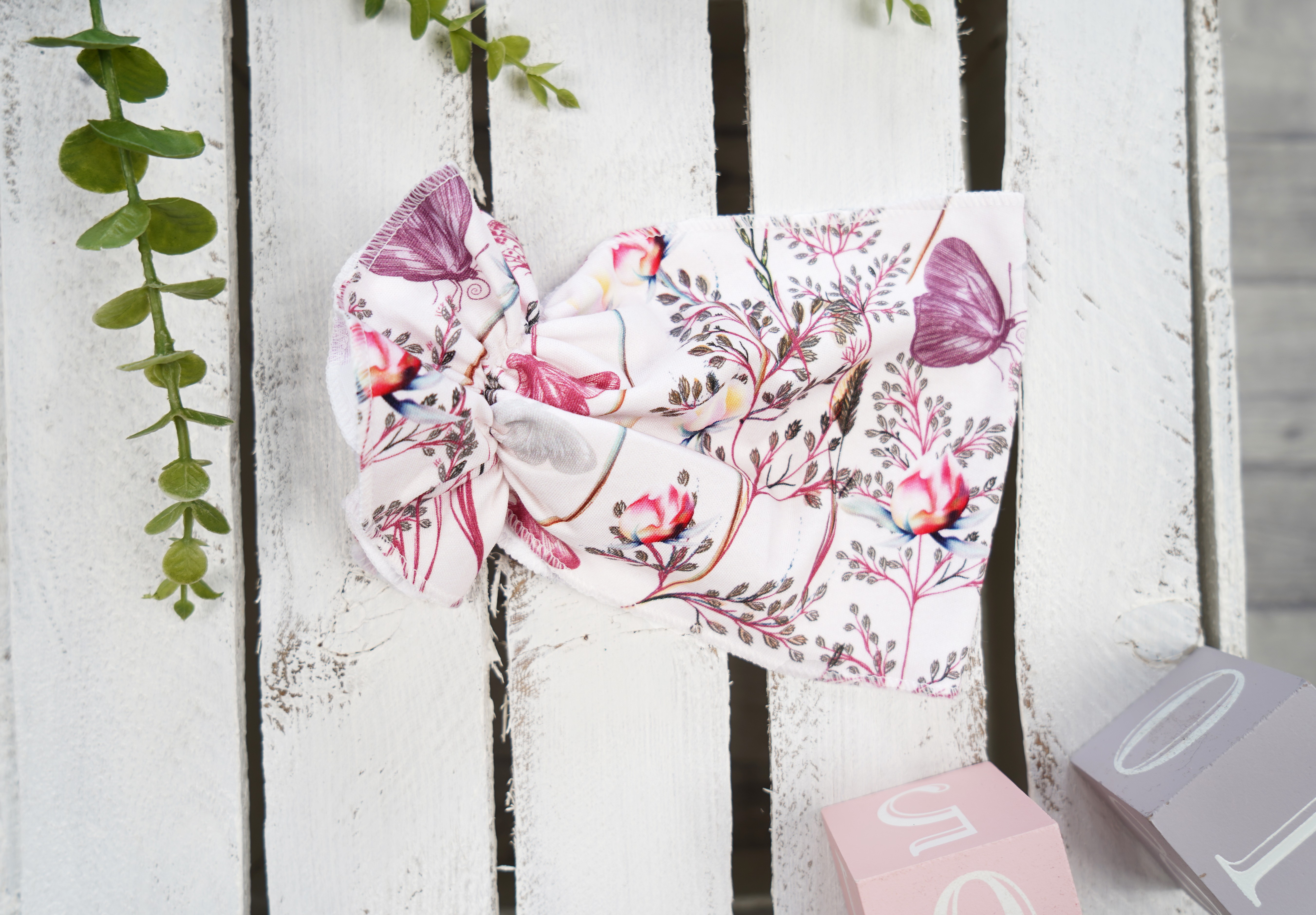 Turban opaska dziewczęca na główkę w kolorowe kwiaty i motyle.