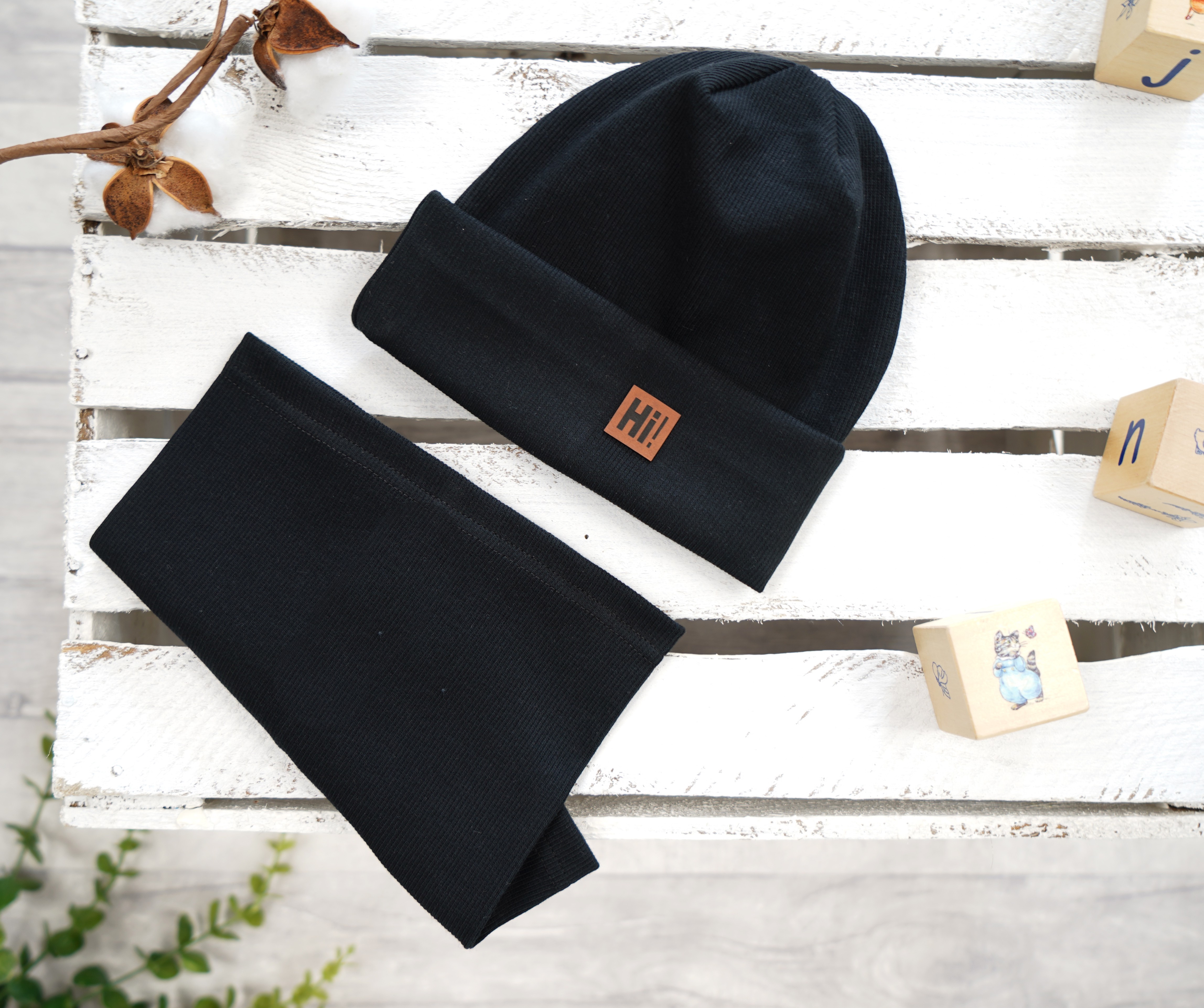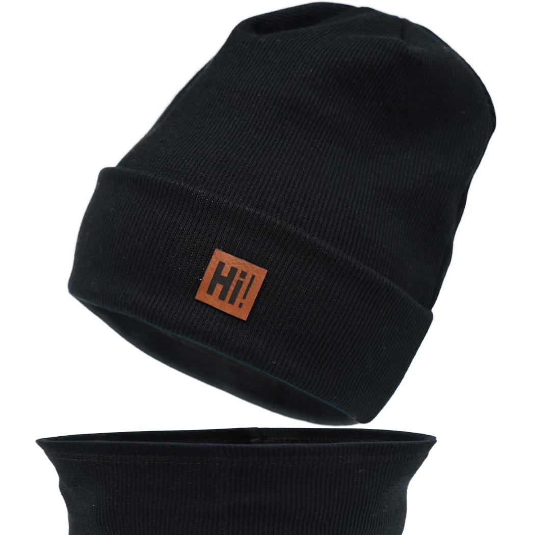 W skład kompletu wchodzi bawełniana czapka w kolorze czarnym. Oferowany model to czapeczka z bawełny prążkowanej z wyszytą aplikacją z napisem HI! Odpowiednia zarówno jako czapeczka wiosenna, jak i czapeczka jesienna. Uzupełnieniem czapeczki jest komin w tym samym kolorze. Komplet posiada jedną warstwę, czapka podwijana, dzięki czemu pełni funkcję ochronną dla uszu.