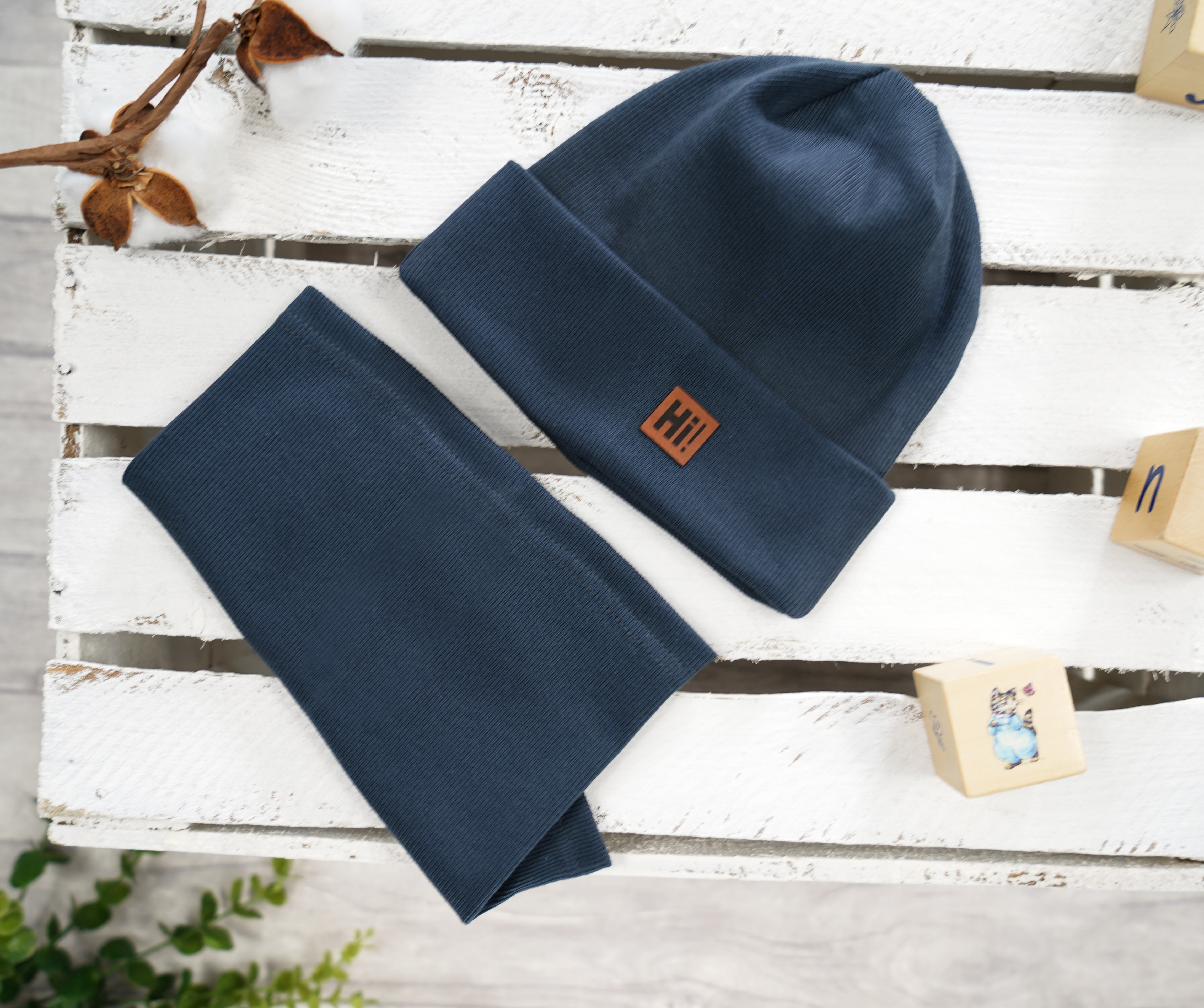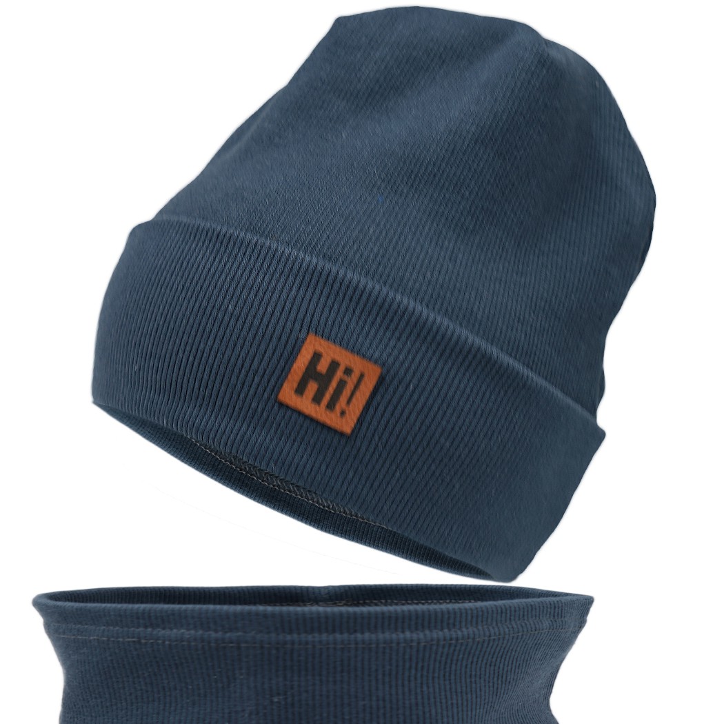 W skład kompletu wchodzi bawełniana czapka w kolorze grafitowym. Oferowany model to czapeczka z bawełny prążkowanej z wyszytą aplikacją z napisem HI! Odpowiednia zarówno jako czapeczka wiosenna, jak i czapeczka jesienna. Uzupełnieniem czapeczki jest komin w tym samym kolorze. Komplet posiada jedną warstwę, czapka podwijana, dzięki czemu pełni funkcję ochronną dla uszu.
