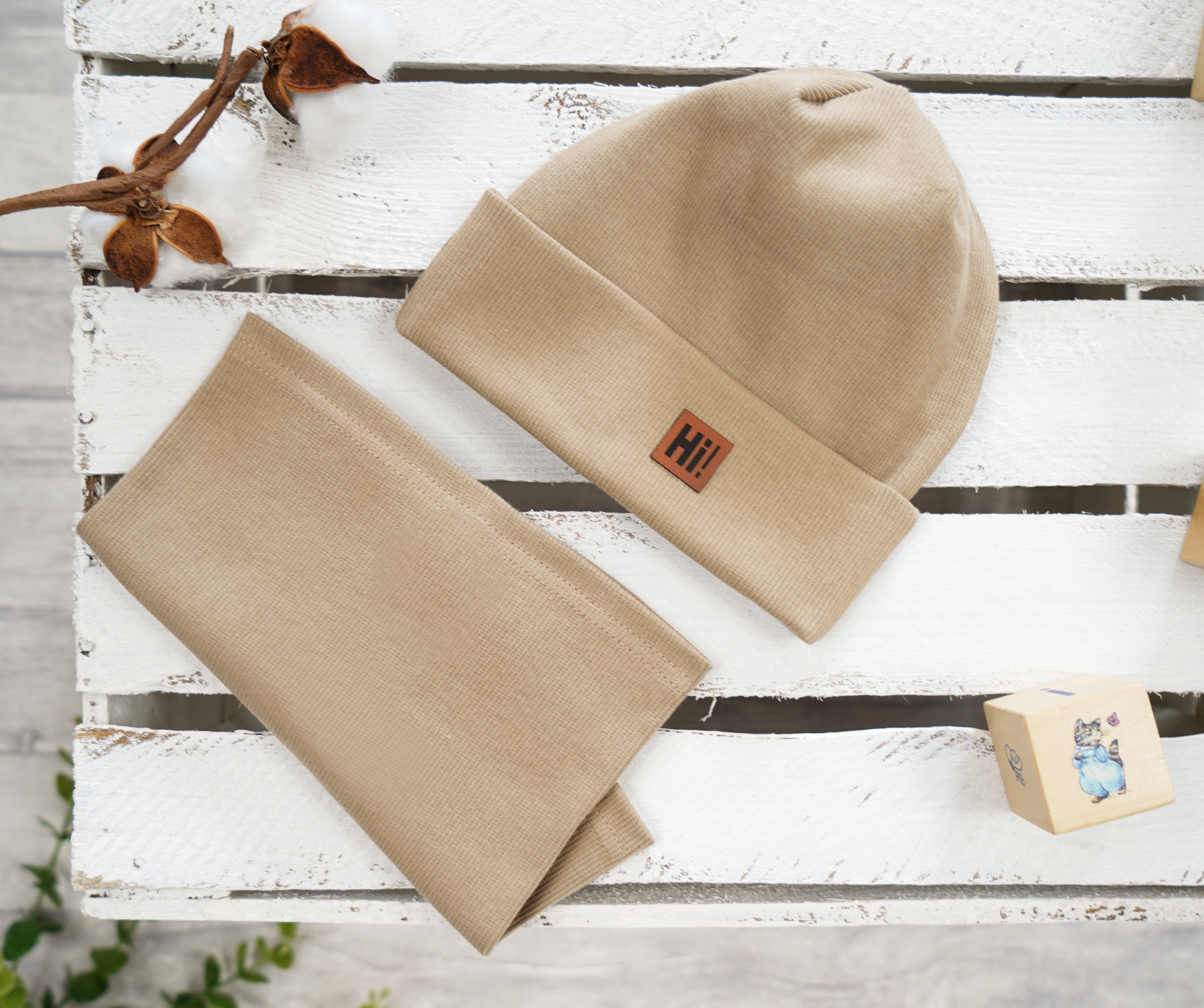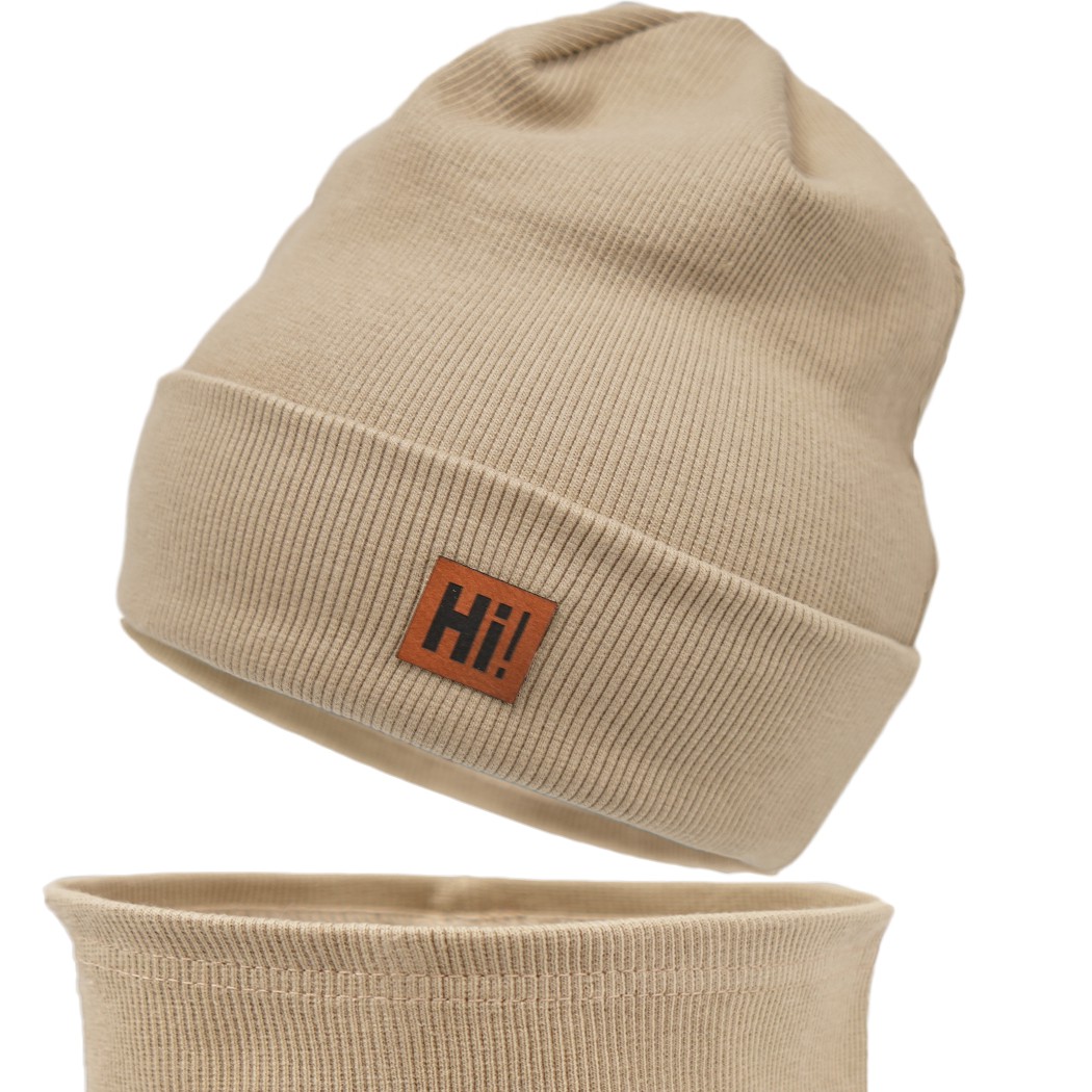 W skład kompletu wchodzi bawełniana czapka w kolorze beżowym. Oferowany model to czapeczka z bawełny prążkowanej z wyszytą aplikacją z napisem HI! Odpowiednia zarówno jako czapeczka wiosenna, jak i czapeczka jesienna. Uzupełnieniem czapeczki jest komin w tym samym kolorze. Komplet posiada jedną warstwę, czapka podwijana, dzięki czemu pełni funkcję ochronną dla uszu.