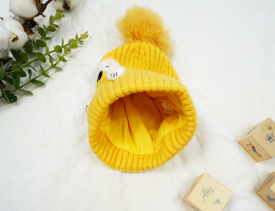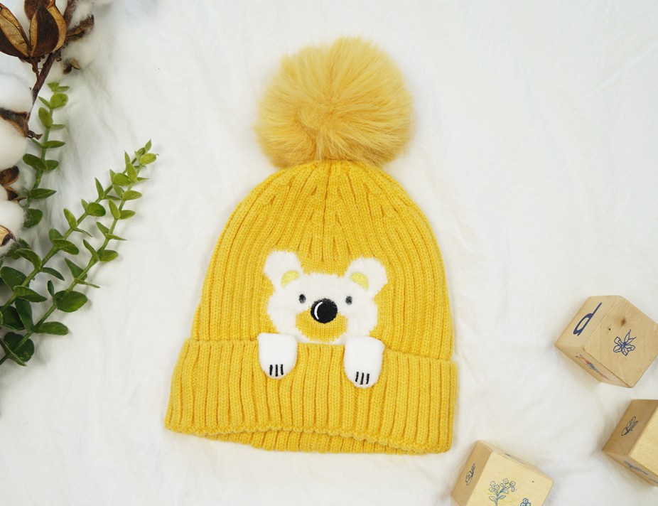 * musztardowa czapka z pomponem i misiem wykonany jest z miękkiego i przyjemnego w dotyku materiału, który po wielokrotnym praniu pozostaje w niezmienionym stanie