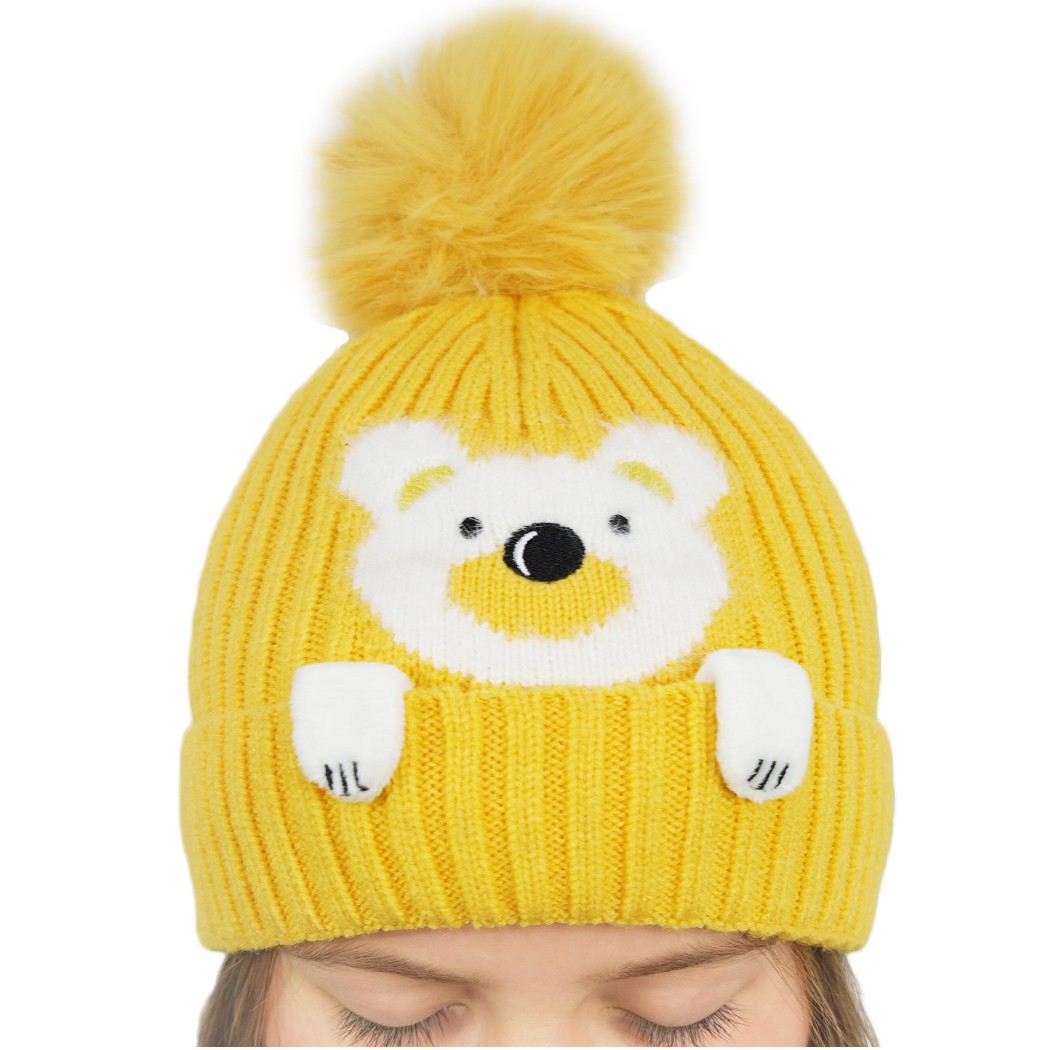 Musztardowa czapka z pomponem i puszystą aplikacją misia.