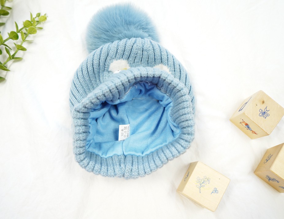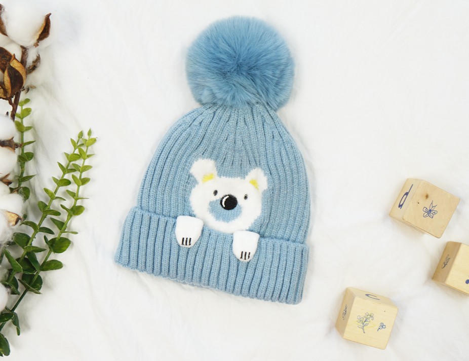* niebieska czapka z pomponem i misiem wykonany jest z miękkiego i przyjemnego w dotyku materiału, który po wielokrotnym praniu pozostaje w niezmienionym stanie