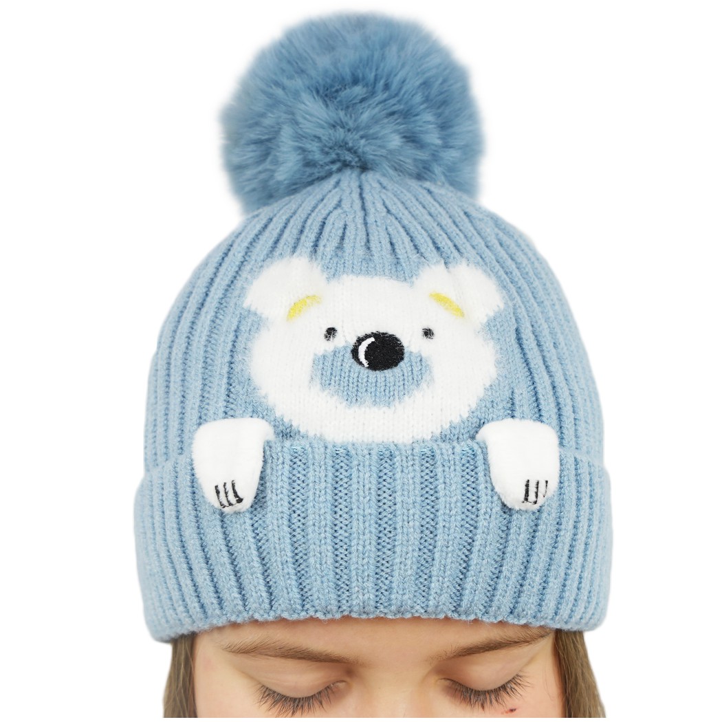 Niebieska czapka z pomponem i puszystą aplikacją misia.