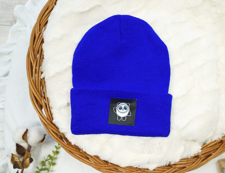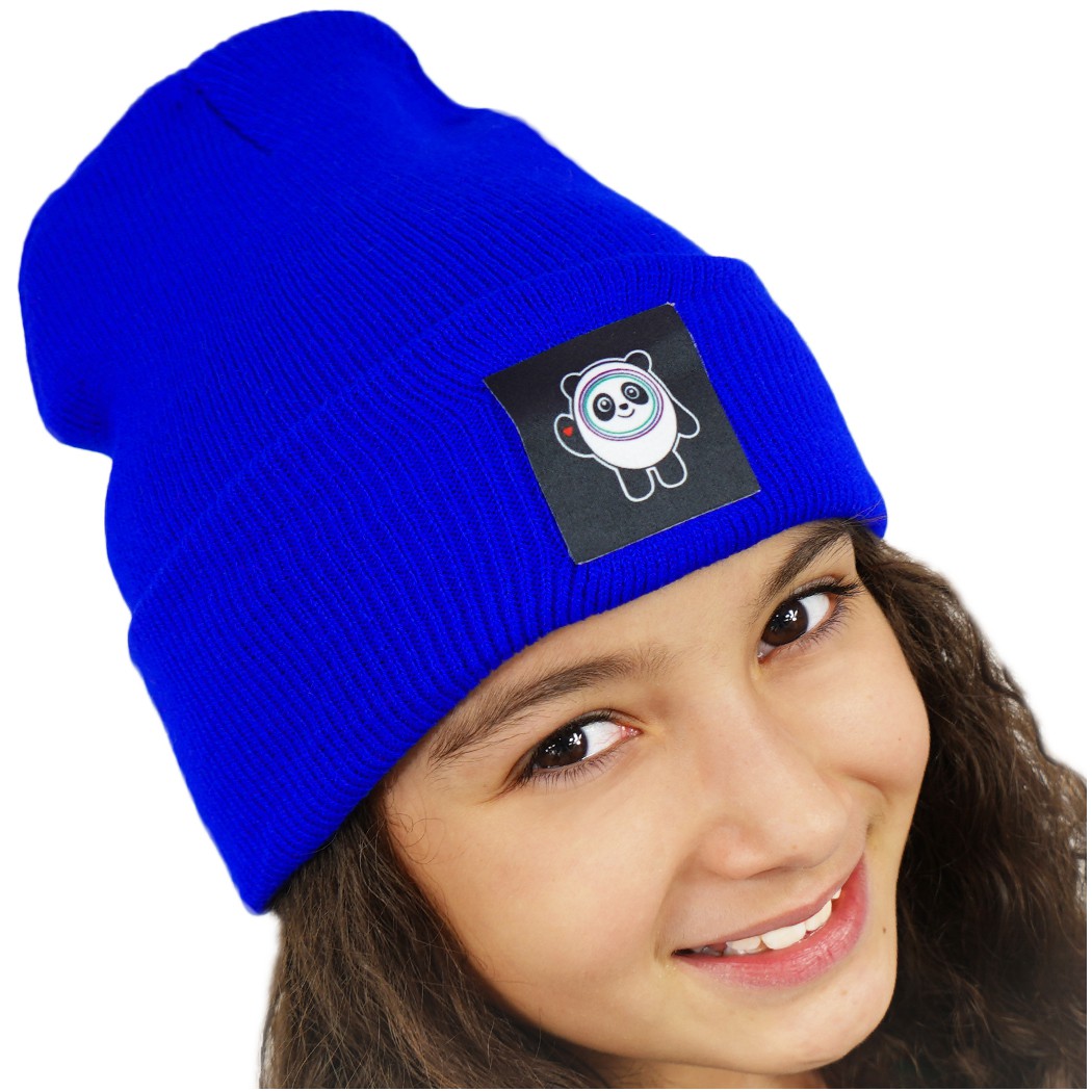 Akrylowa czapka w kolorze chabrowym podwinięta na uszy. Oferowany model to dziecięca czapeczka z wyszytą, uroczą aplikacją pandy, odpowiednia zarówno jako czapeczka wiosenna, jak i czapeczka jesienna oraz na lekką zimę.