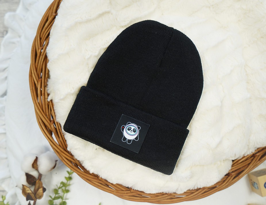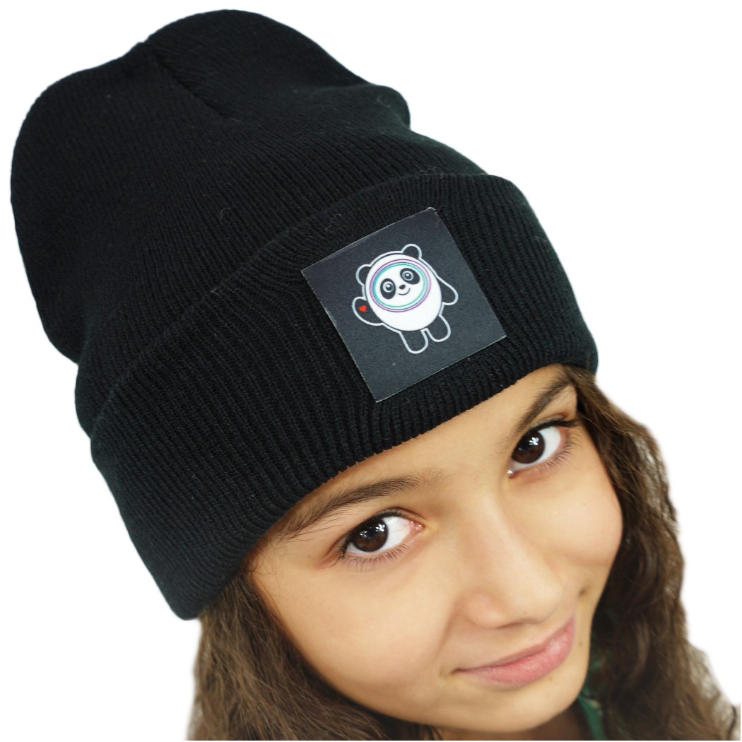 Akrylowa czapka w kolorze czarnym podwinięta na uszy. Oferowany model to dziecięca czapeczka z wyszytą, uroczą aplikacją pandy, odpowiednia zarówno jako czapeczka wiosenna, jak i czapeczka jesienna oraz na lekką zimę.