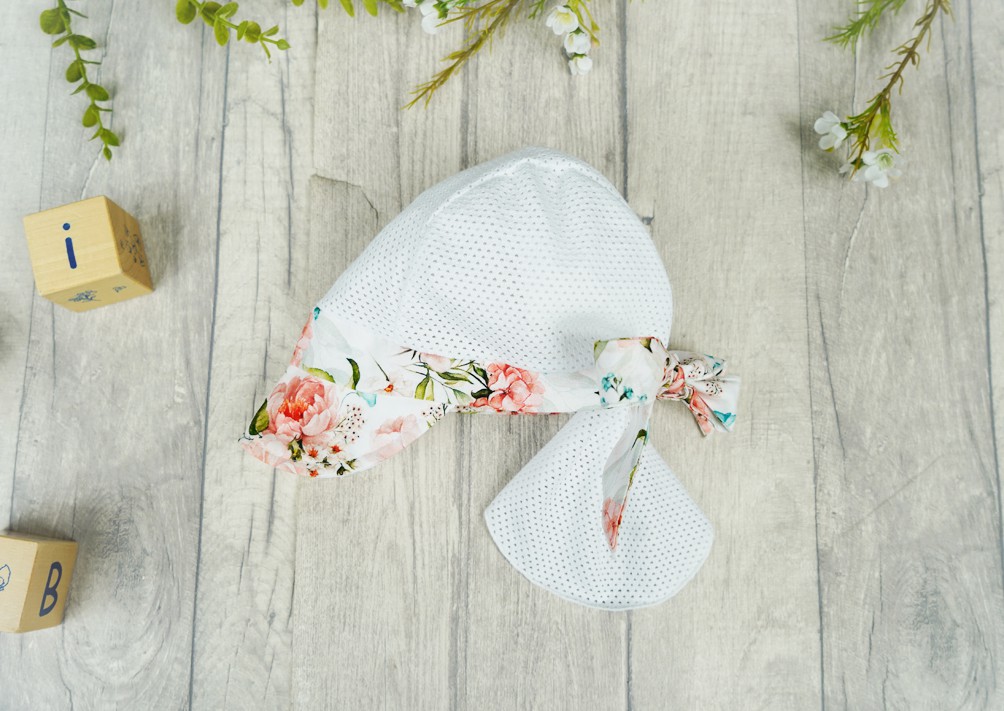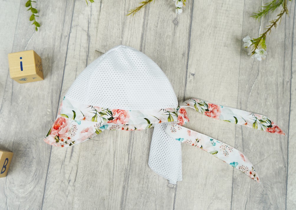 CZAPKA wiązana biała KWIATY z daszkiem na kark przeciw poceniu głowy
