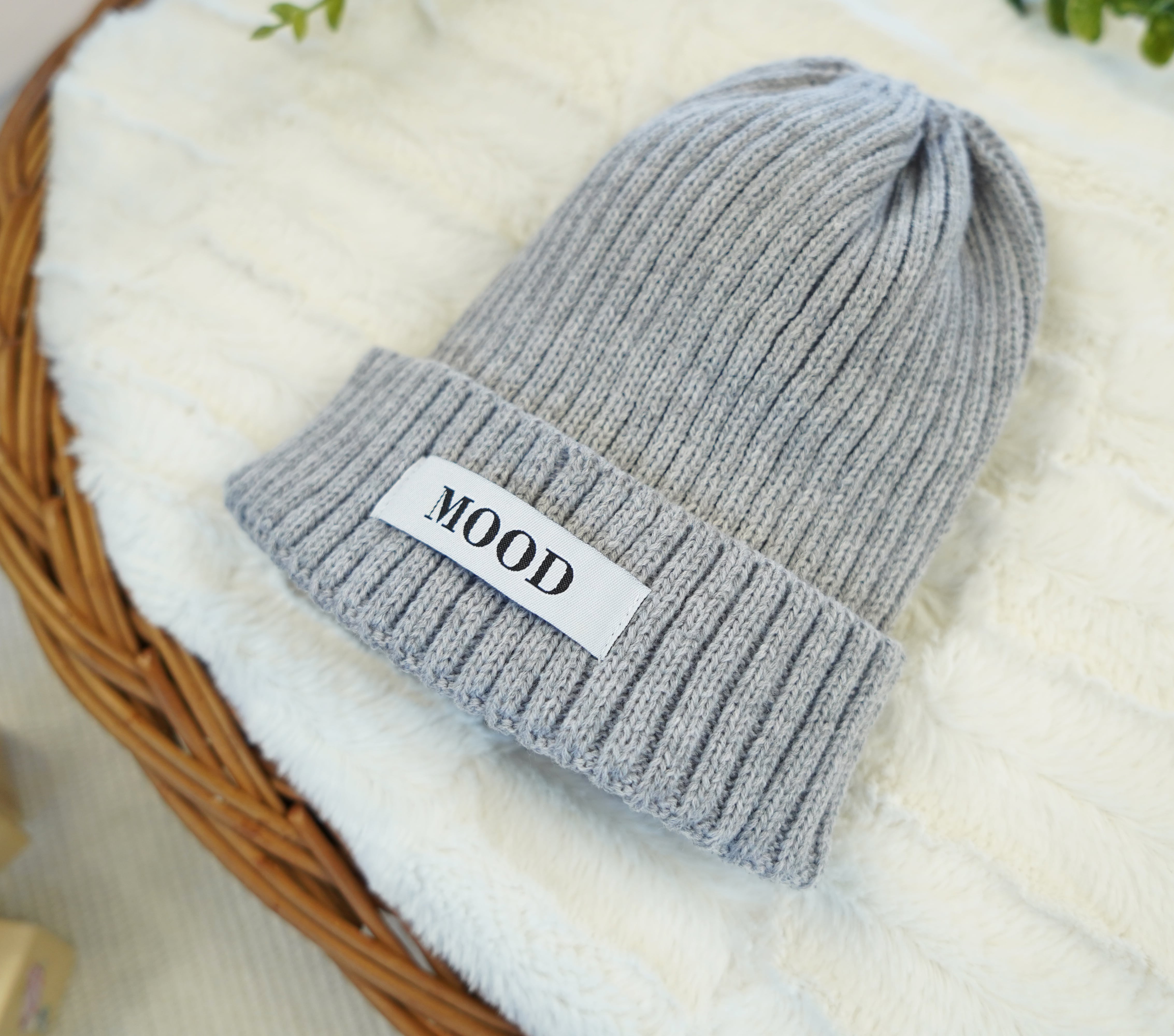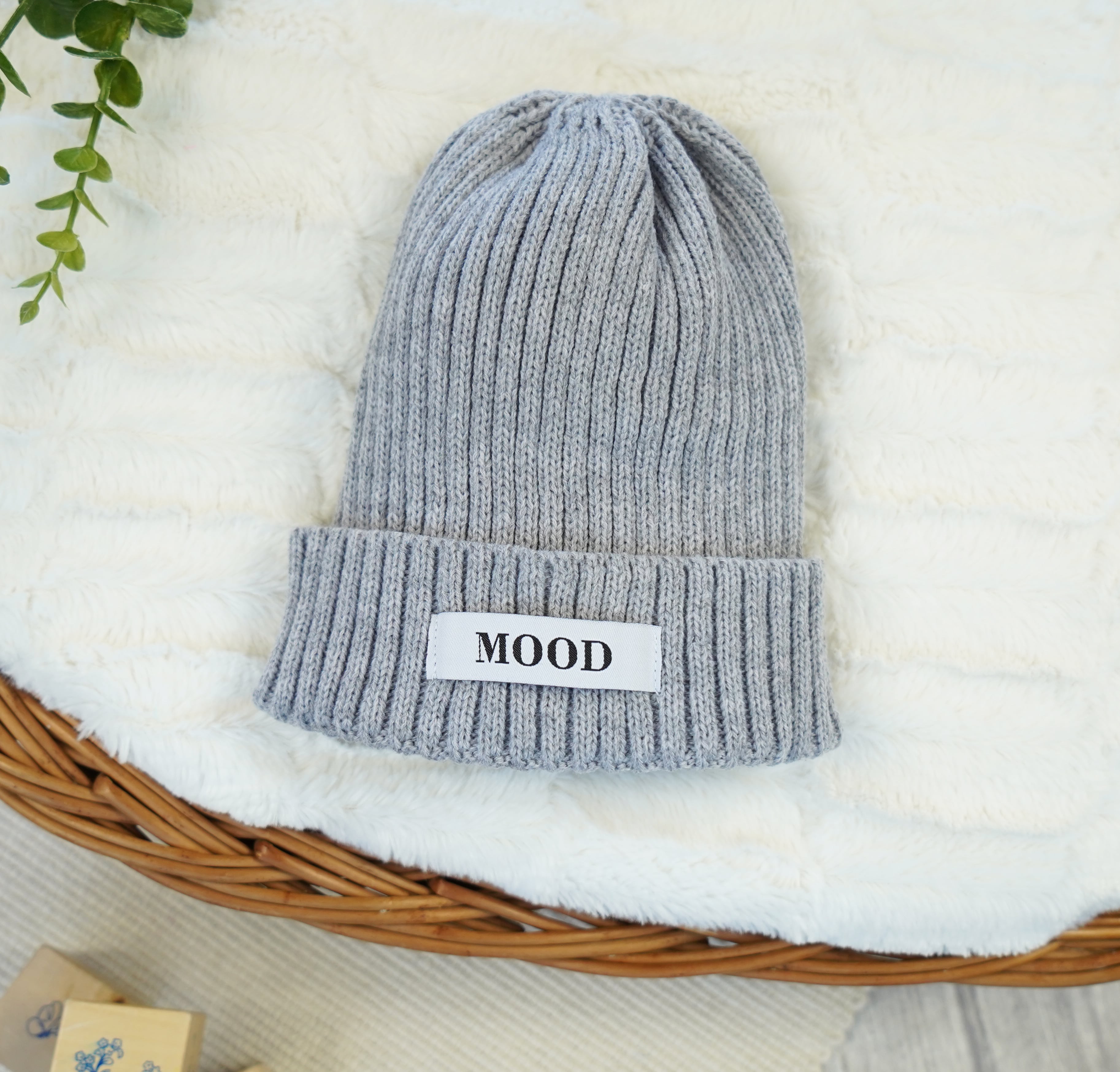 Akrylowa czapka w kolorze szarym podwinięta na uszy. Oferowany model to dziecięca czapeczka z szarą naszywką z napisem MOOD. Odpowiednia zarówno jako czapeczka wiosenna, jak i czapeczka jesienna oraz na lekką zimę.
