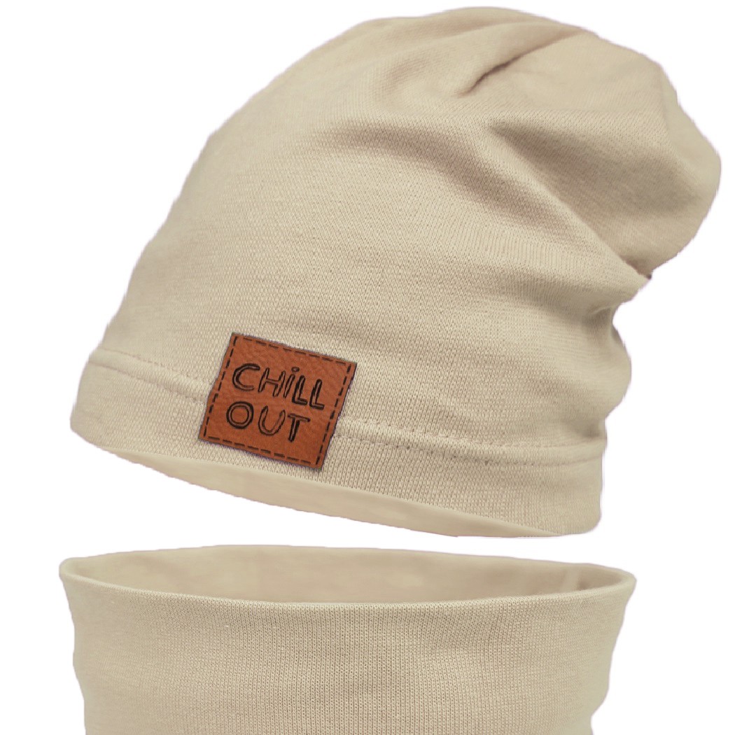 W skład kompletu wchodzi bawełniana czapka w kolorze bezowym. Oferowany model to dziecięca czapeczka z wyszytą aplikacja z napisem CHILL OUT, odpowiednia zarówno jako czapeczka wiosenna, jak i czapeczka jesienna. Uzupełnieniem czapeczki jest komin w tym samym kolorze.
