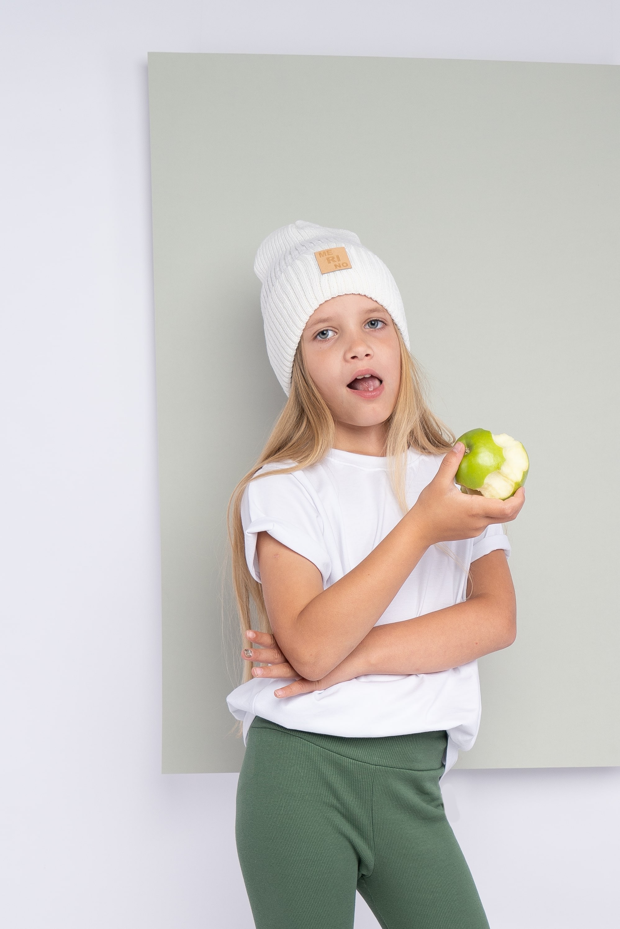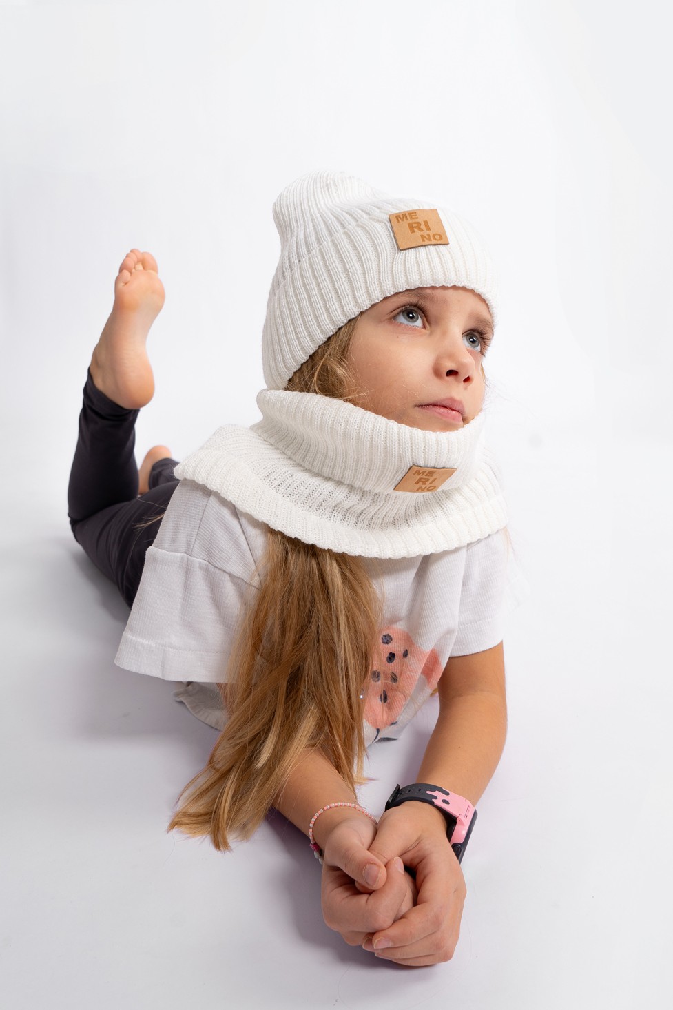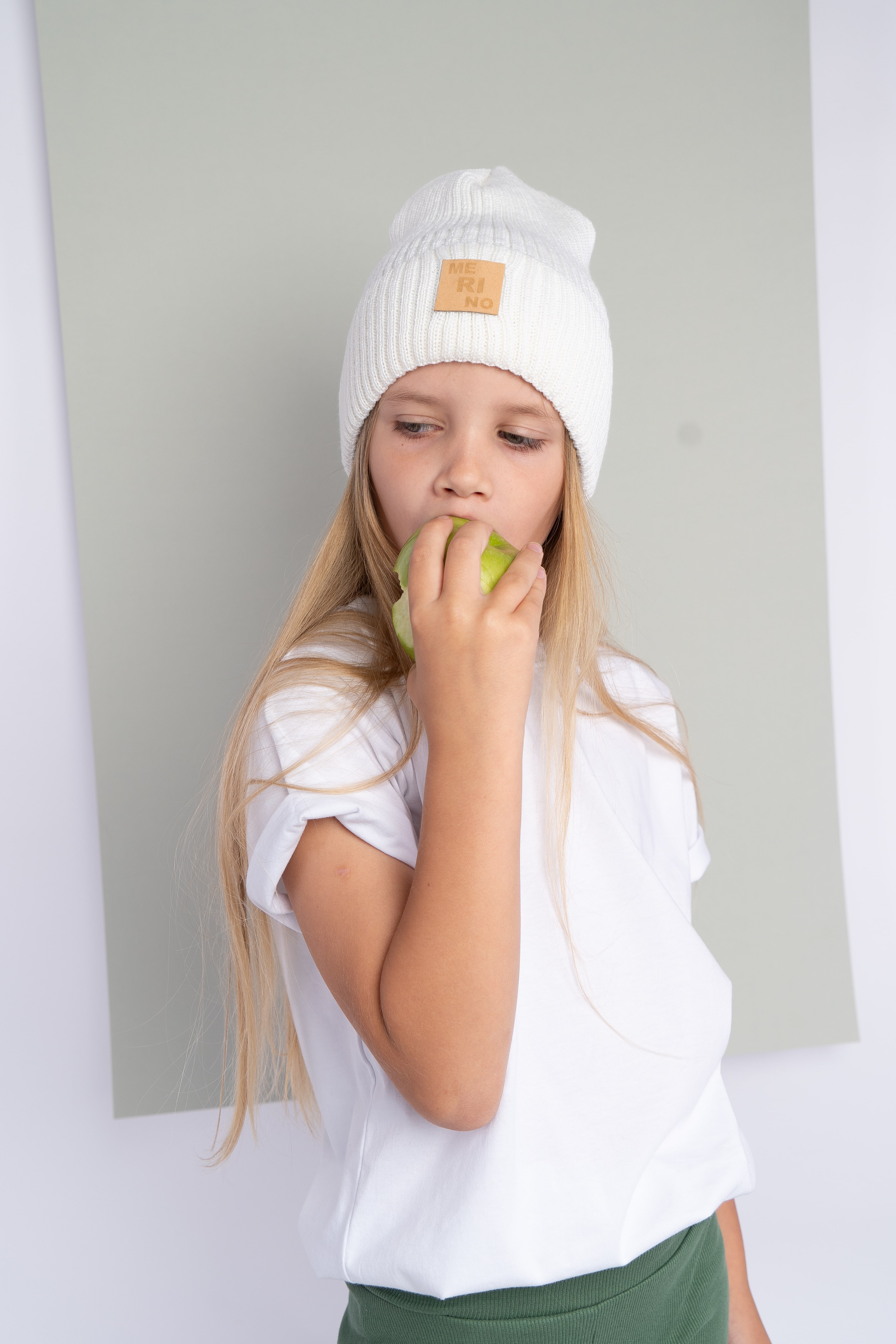 Podwijana czapka dziecięca 100% MERINO w kolorze ecru.