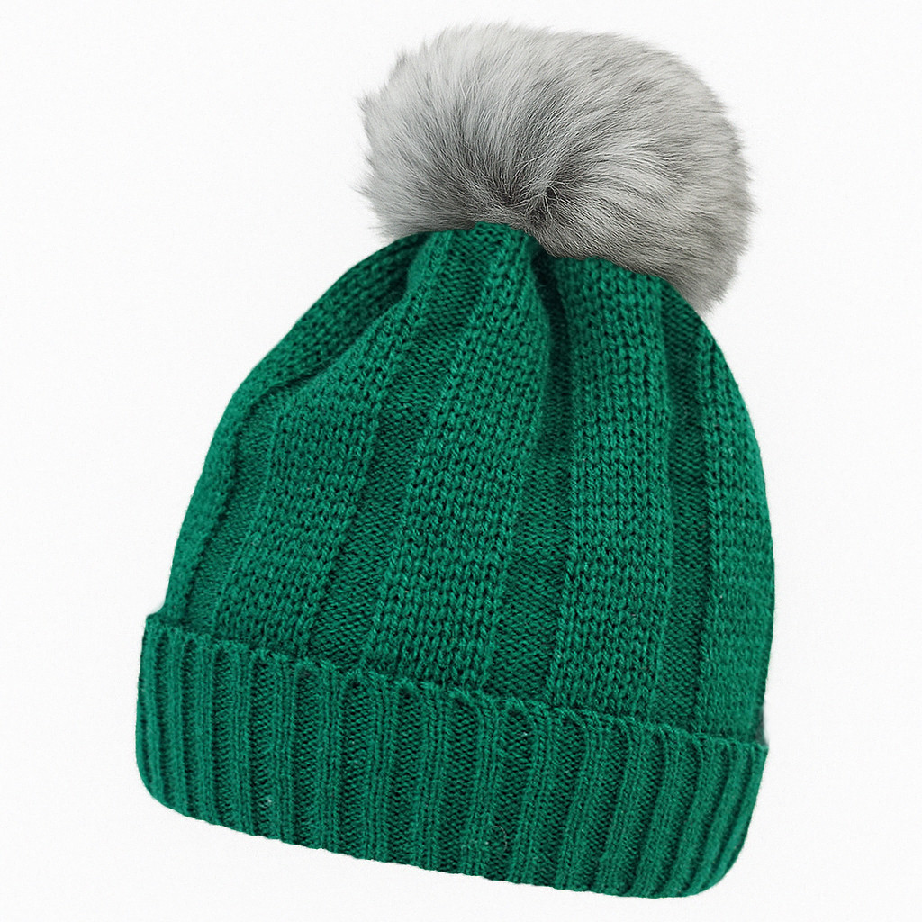 Butelkowa zieleń czapka zimowa dziewiarska "Piotr" puchaty pompon