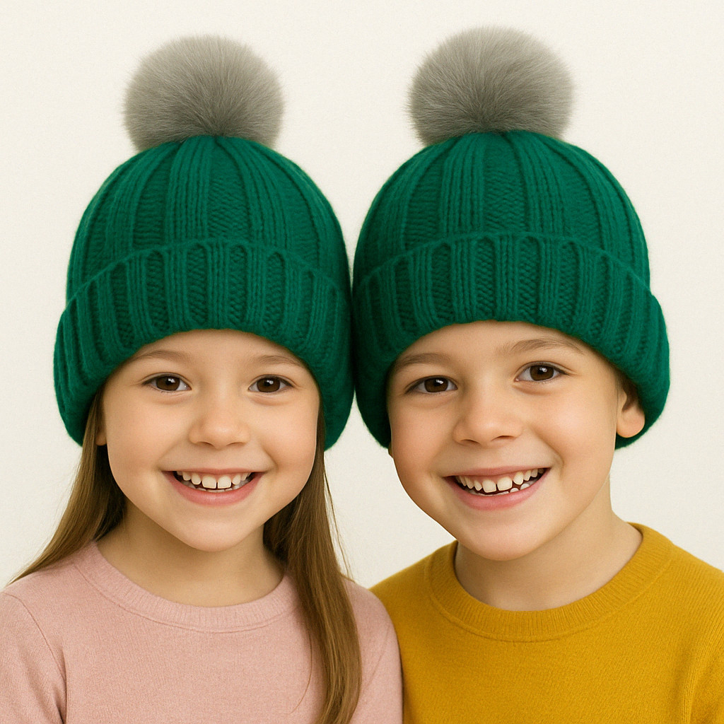 Dziecięca czapka zimowa, dziewiarska "Piotr" z puchatym pomponem w kolorze butelkowej zieleni.
