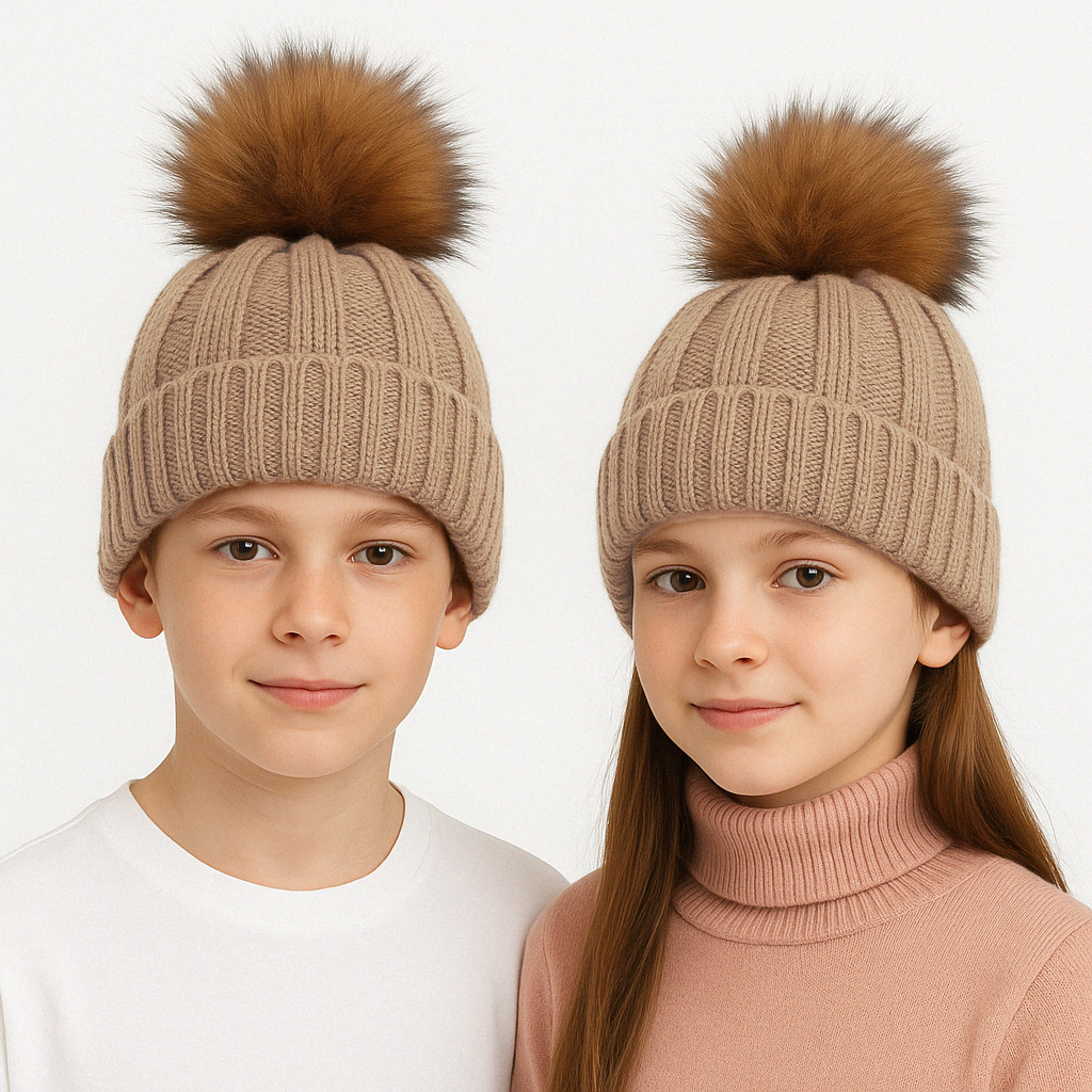 Dziecięca czapka zimowa, dziewiarska "Piotr" z puchatym pomponem w kolorze jasnego brązu.