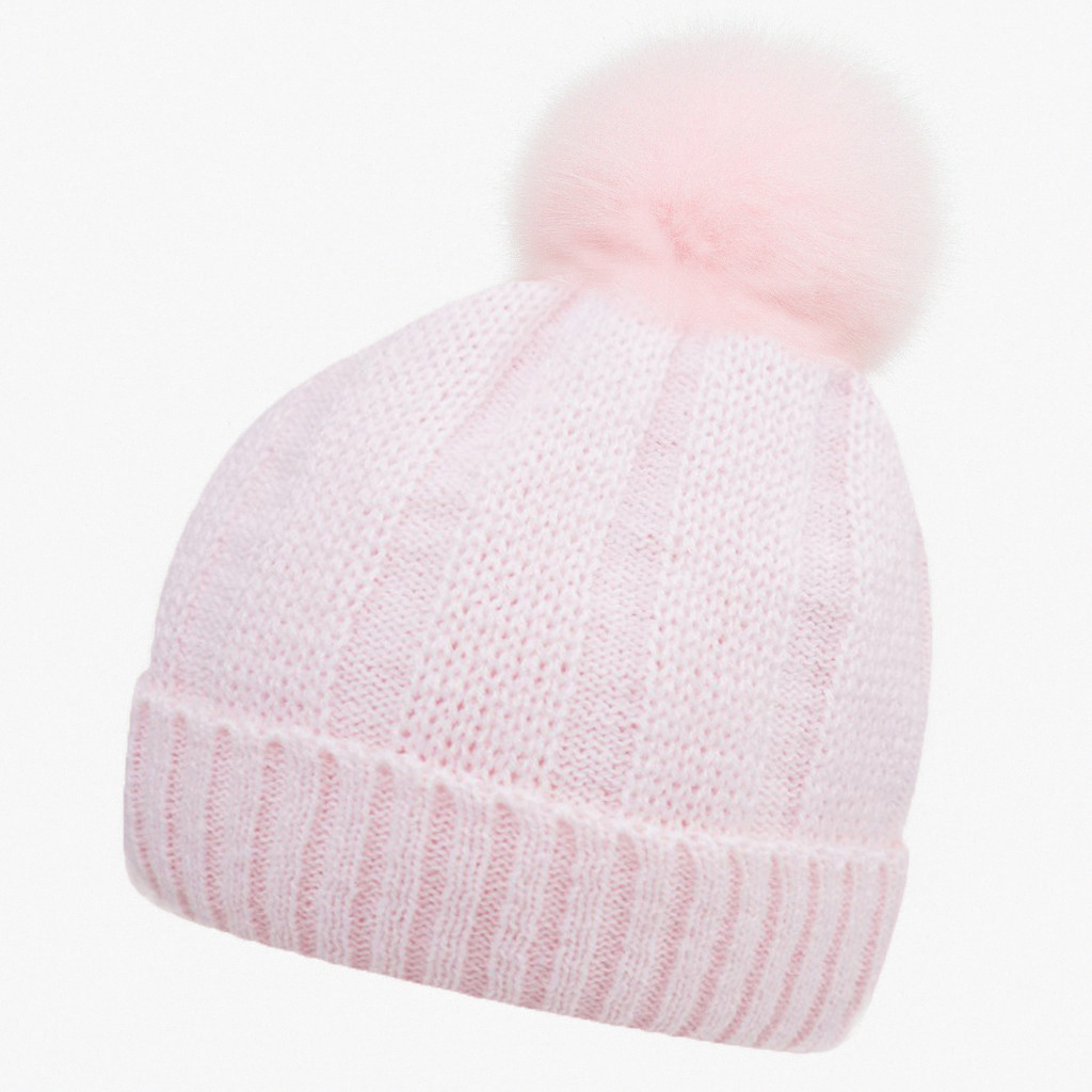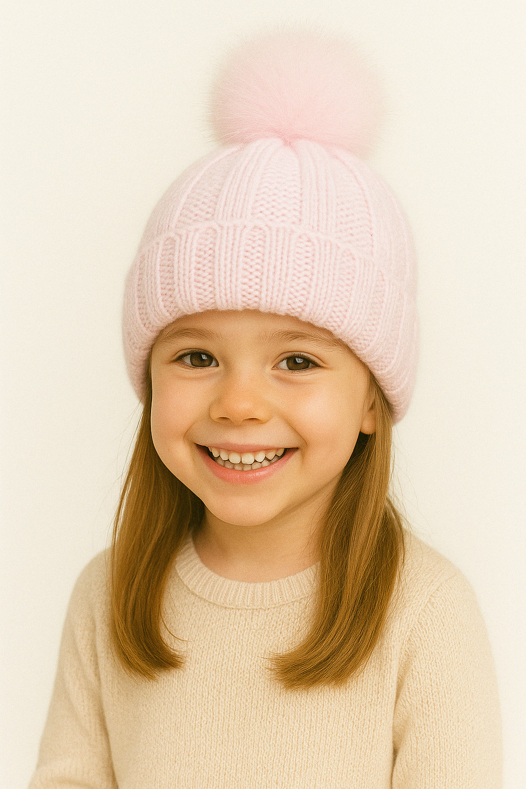 Dziecięca czapka zimowa, dziewiarska "Piotr" z puchatym pomponem w kolorze jasnego różu.