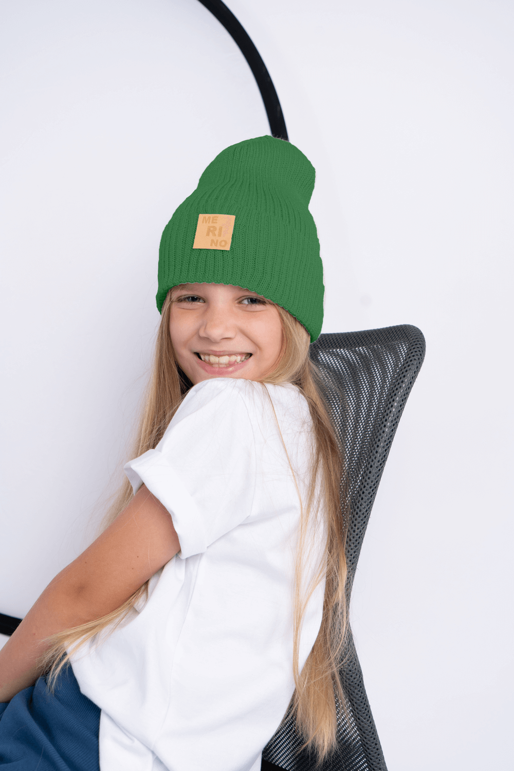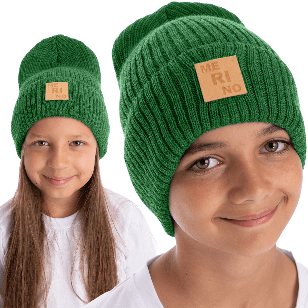 Podwijana czapka dziecięca 100% MERINO w kolorze butelkowej zieleni.