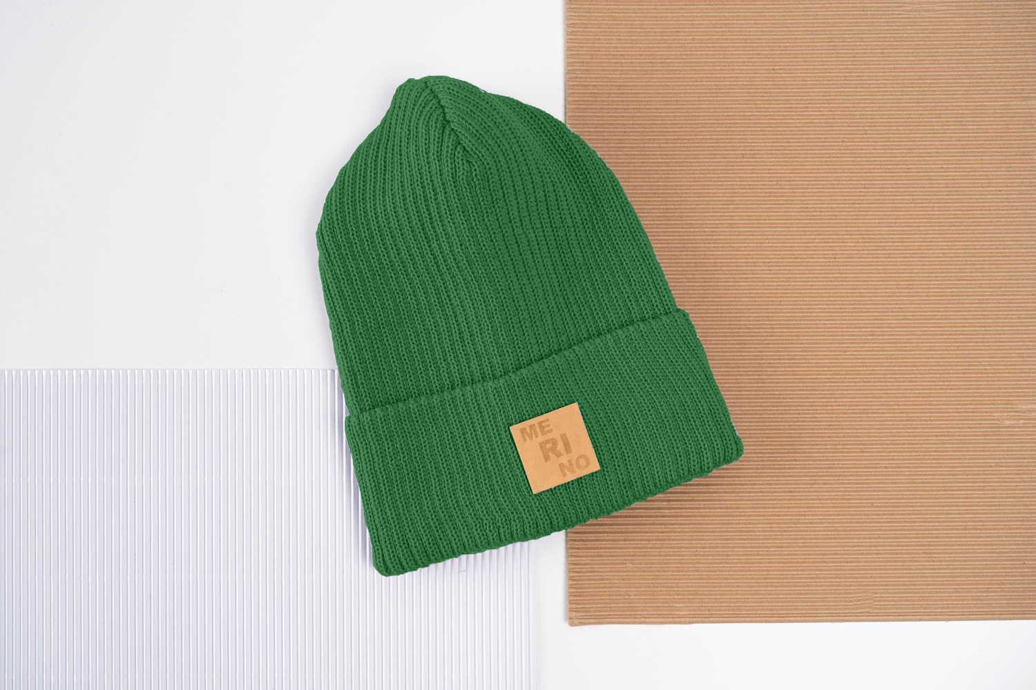 Merino czapka zieleń butelkowa 100% wełna podwijana jesień zima