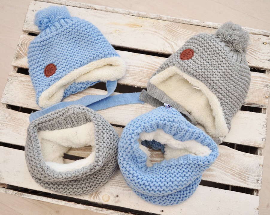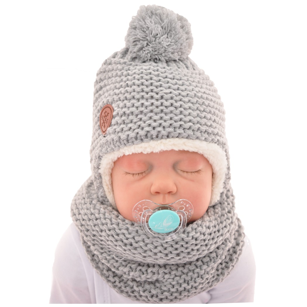 Ciepły komplet dla noworodka ochroni zarówno główkę jak i szyję dziecka. Idealnie sprawdzi się w okresie zimowym do kombinezonu niemowlęcego.
